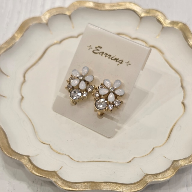 キラキラビジュー フラワー イヤリング☆花 ホワイト 大人可愛い