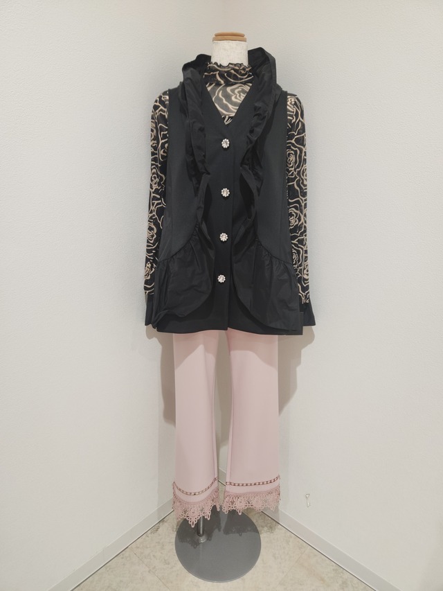 【Super Beauty★】半額❗フリル立ち襟とビジュー&パールボタンがゴージャスな光沢ベスト(ブラック) サイズ40