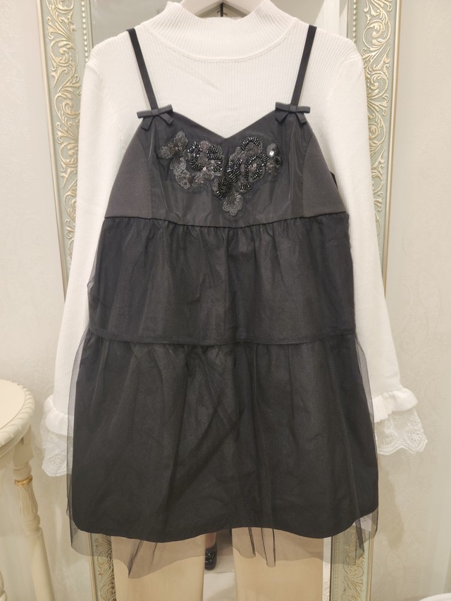 【Super Beauty★セール】胸元のビーズ使い刺繍が高級感あるタフタ&チュール素材キャミソール [表示サイズ]42(11号位) [仕上がり寸法(cm)] 着丈59※チュールは+4.5 身丈(胸のリボン~)59※チュールは+4.5 身幅46 裾幅71 ストラップ幅1 ストラップ長さ24~43 [色]ブラック [素材] 画像最後をご覧ください。 [元の価格(税込)]15,400円 ただ今、半額★特別セール開催中! このキャミソールは、胸元に施されたビーズ使いの刺繍が高級感を放つ逸品です。タフタとチュール素材を組み合わせており、エレガントな雰囲気を醸し出します。この一着を纏えば、どんなシーンでも注目を集めること間違いなしです。 春には薄手のジャケットやカーディガンを羽織って、軽やかさを演出。夏はデニムやスカートと合わせて、カジュアルでも洗練されたスタイルに仕上げることができます。そして、秋冬にはタートルネックやシャツとのレイヤードスタイルで、シーズンを問いません。 特に、胸元のビーズ使いが印象的で、シンプルながらも存在感のあるデザインは、女性らしさを引き立てることができます。このキャミソールを身に着けることで、上品な装いが完成し、自信を持って外出できるでしょう。 特別な日の装いにも、日常のルックにも使える、多用途なアイテムです。新たなスタイルの提案として、是非ワードローブに加えてください。貴女の日常に特別な輝きを与える、素敵なキャミソールです!