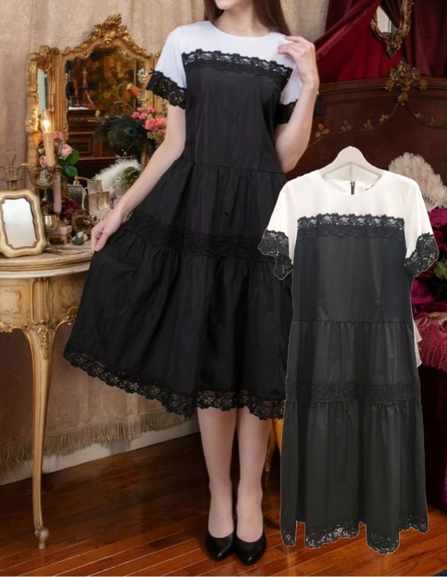 【Super Beauty / スーパービューティー★新作】ホワイト×ブラック胸元切替レース使い半袖ワンピース