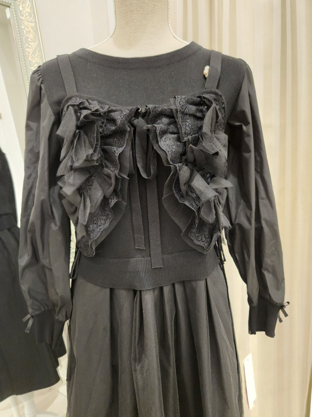 定価13,200円→6,600円(50%off) [サイズ]42(11号位) [色]ブラック [素材] 綿65% ナイロン35% 別布 ポリエステル100% [詳しい寸法](約) 着丈46.5cm 身幅45cm (平置き採寸) フリルのデザインと、レースフリルが 大人可愛い! 腰のリボンもポイントです。 後ろのファスナーも紐がついているので、 とても着やすいです。