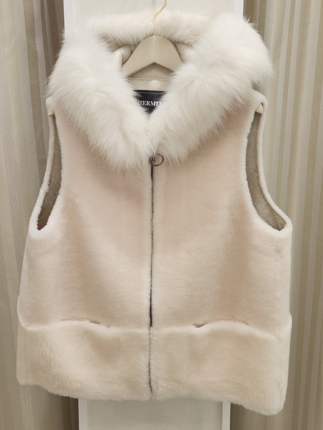 SALE ★ラムウールムートン/フードFOX付ベスト(オフホワイト)