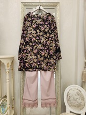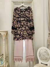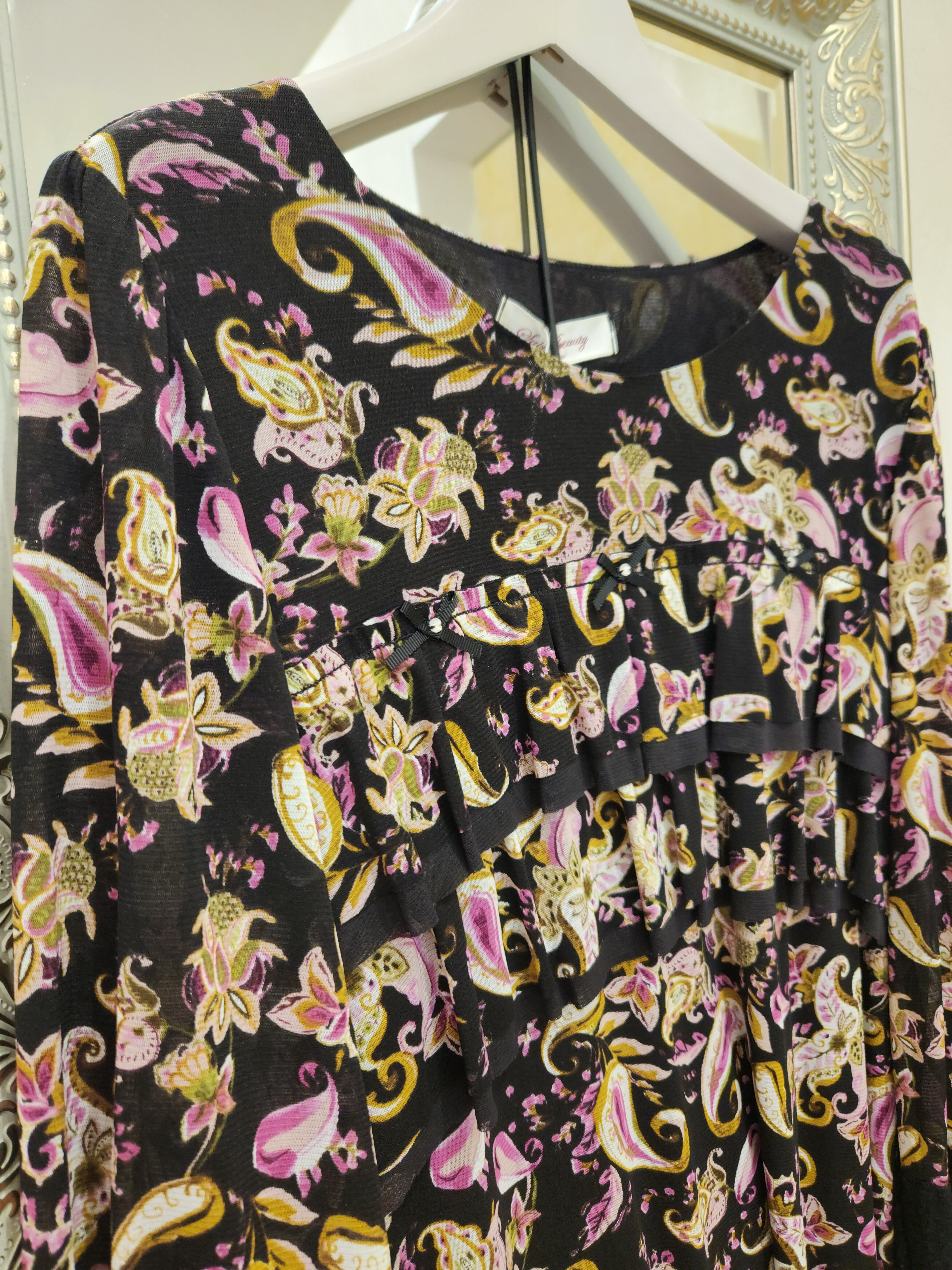 心踊るこのチュニックは、ピンクとブラックが見事に調和したデザインが特徴で、着るだけで華やかさを演出します。ペイズリー柄のパワーネット素材に、胸元のフリルとブラックのレース使いが加わり、優雅でありながらも愛らしい印象を与えます。