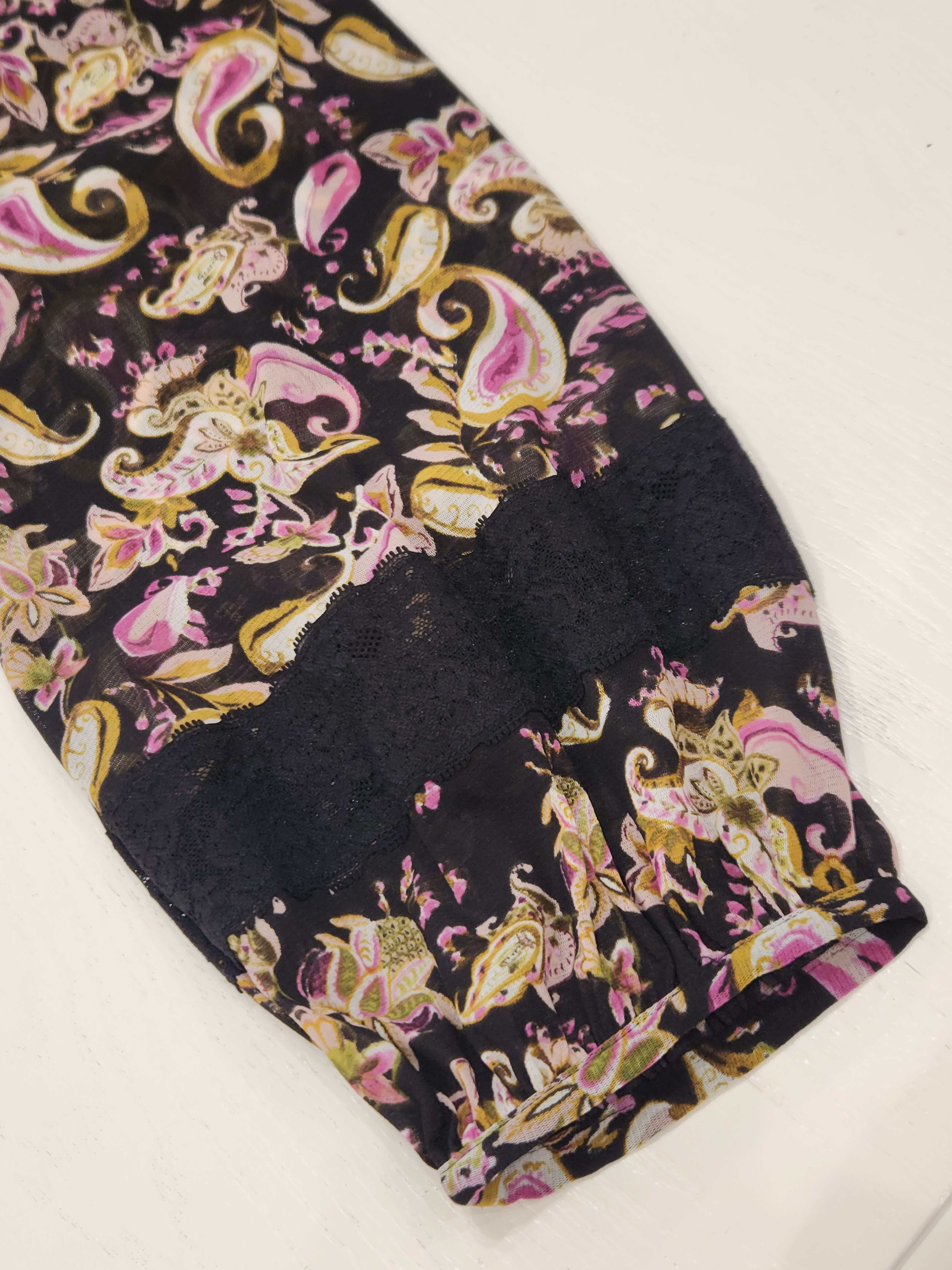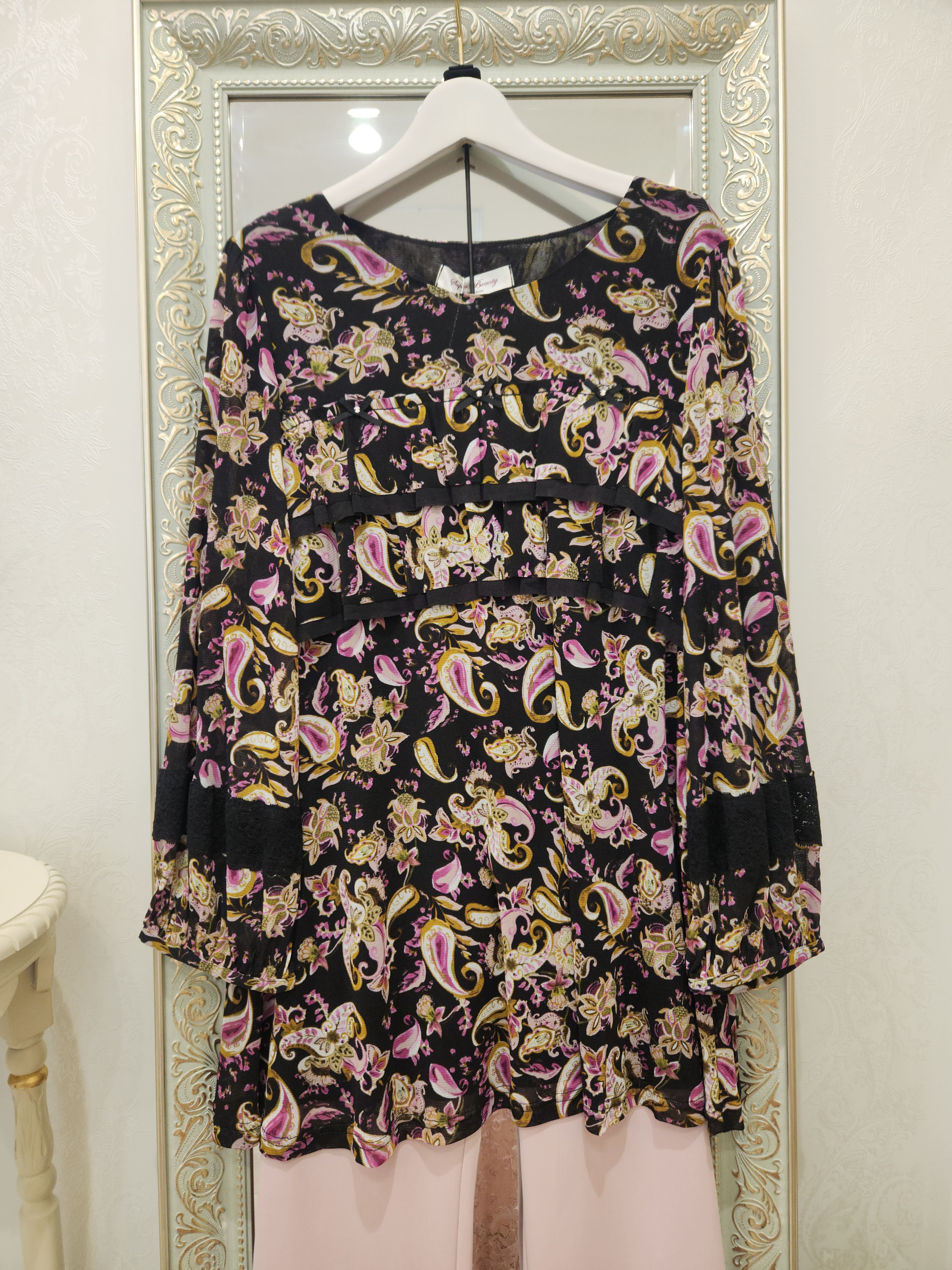 【Super Beauty★半額セール】ピンクが混じった愛らしさを感じるペイズリー柄のパワーネット素材の胸のフリルデザインとブラックのレース使いが優雅な印象のチュニック