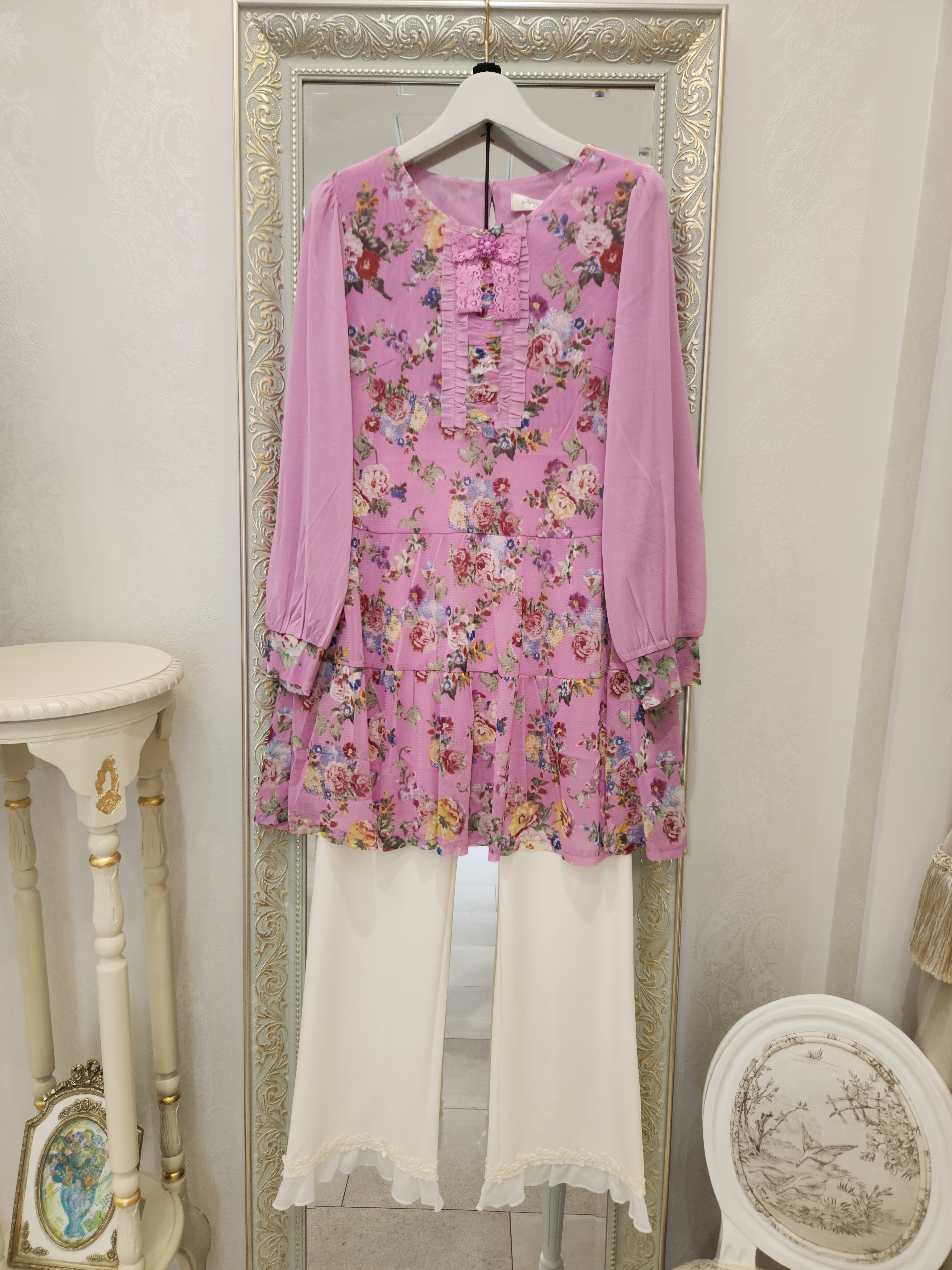 【Super Beauty★半額セール】ピンク地の優雅なバラ柄のパワーネットにリボンとレースの装飾が大人可愛いチュニック
