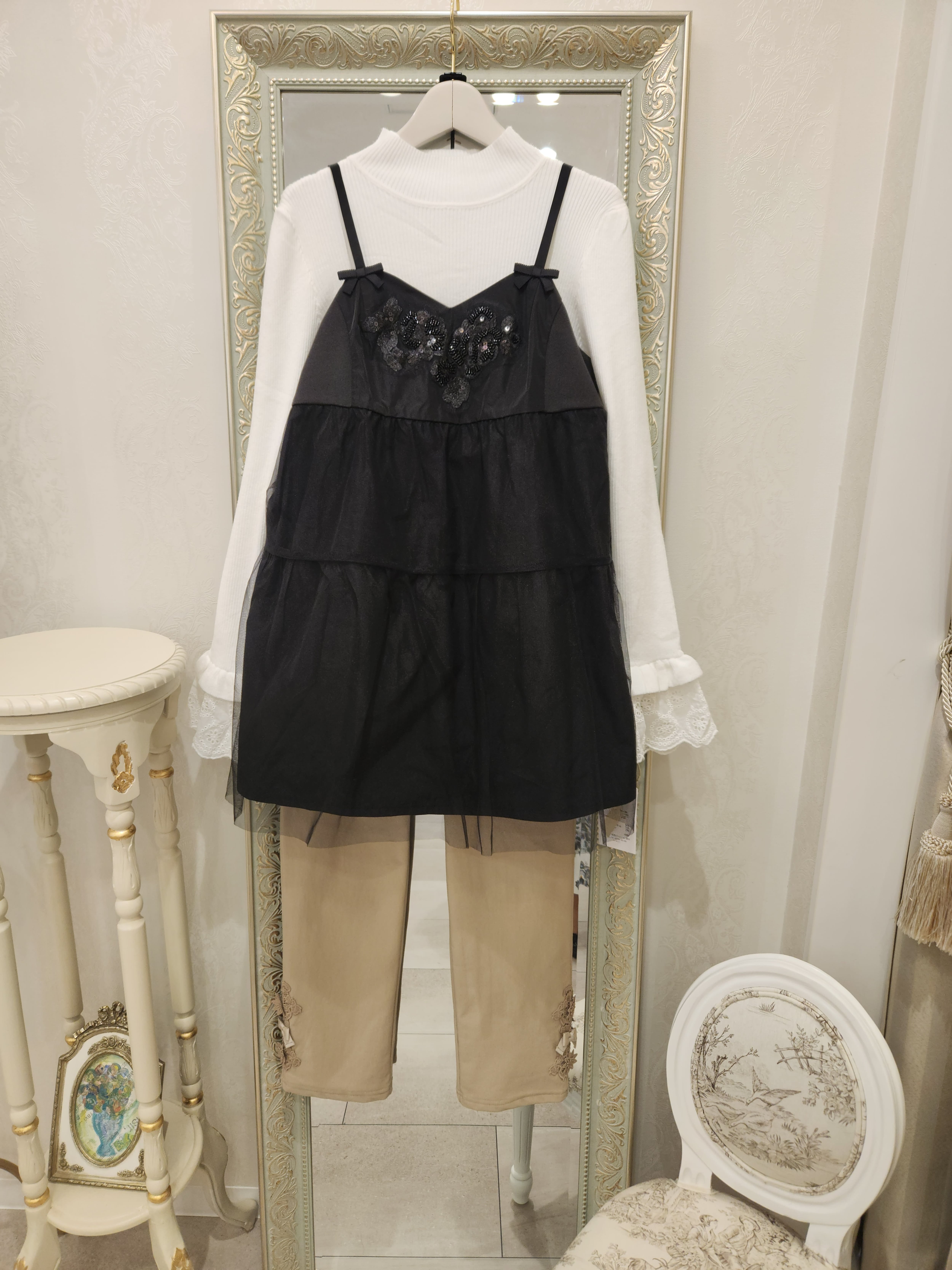 特に、胸元のビーズ使いが印象的で、シンプルながらも存在感のあるデザインは、女性らしさを引き立てることができます。このキャミソールを身に着けることで、上品な装いが完成し、自信を持って外出できるでしょう。