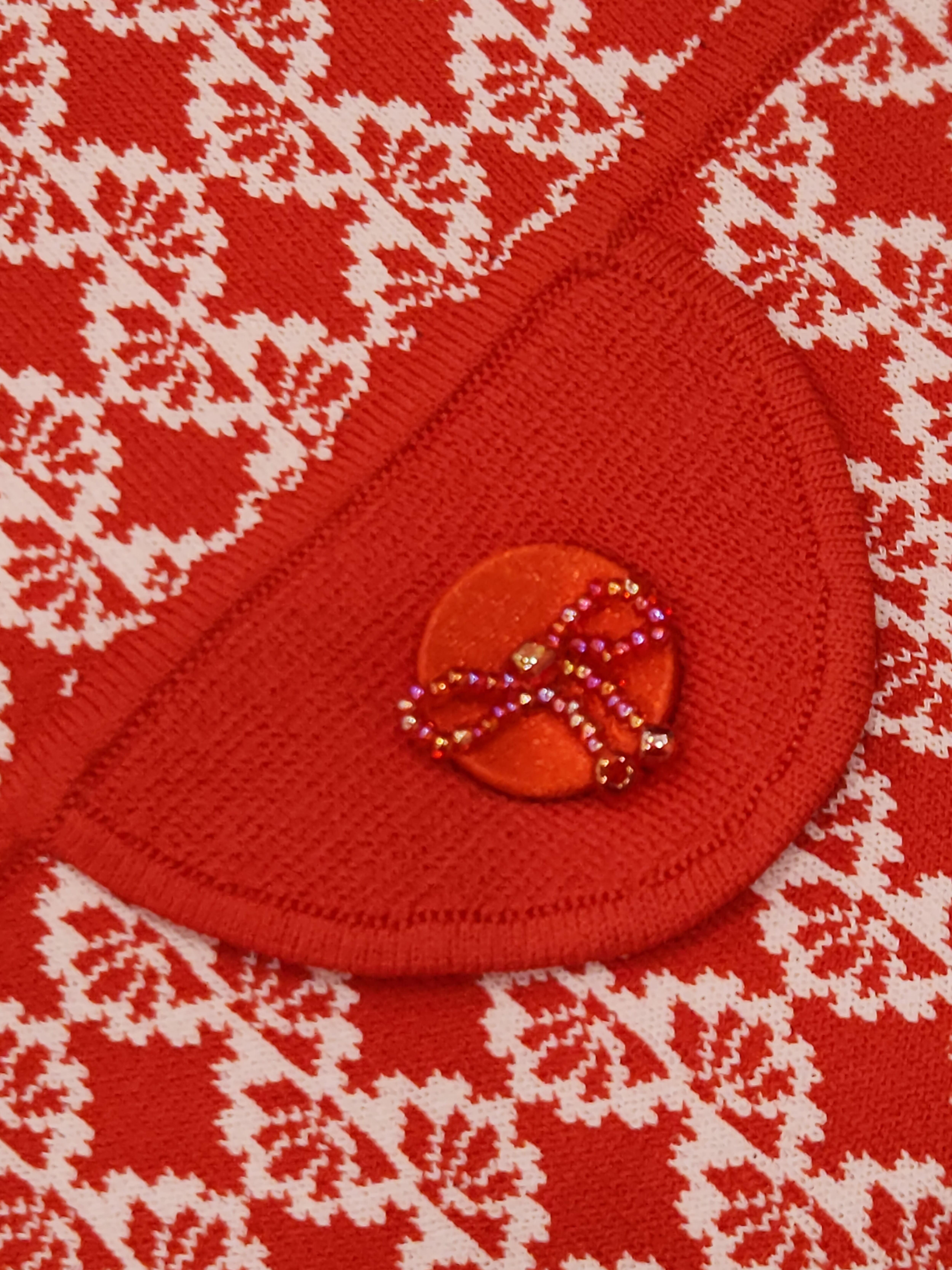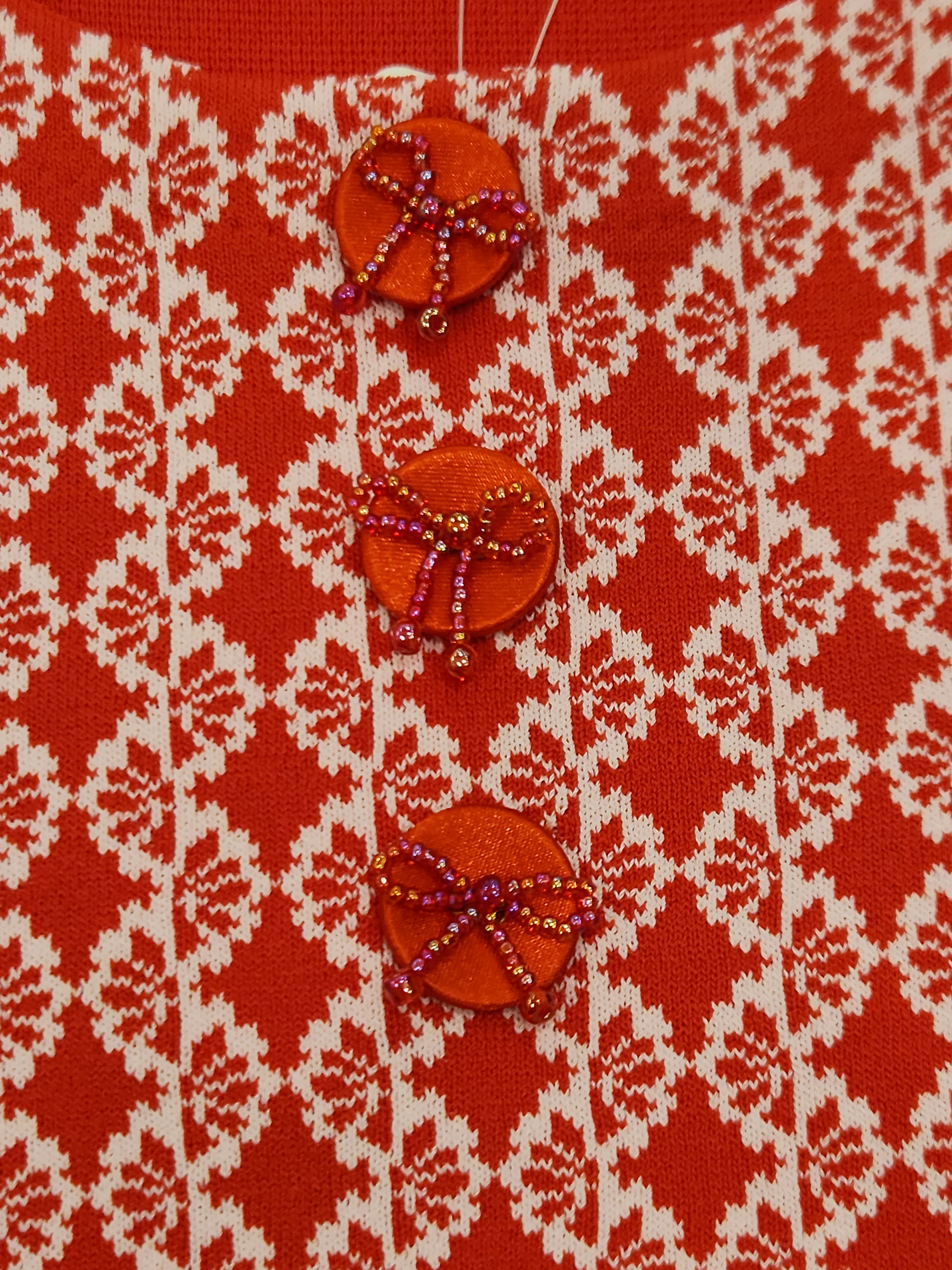 【Super Beauty ★セール】レトロな柄にビーズで出来た小さなリボンが装飾されたボタンが施された型崩れしにくいニットワンピース