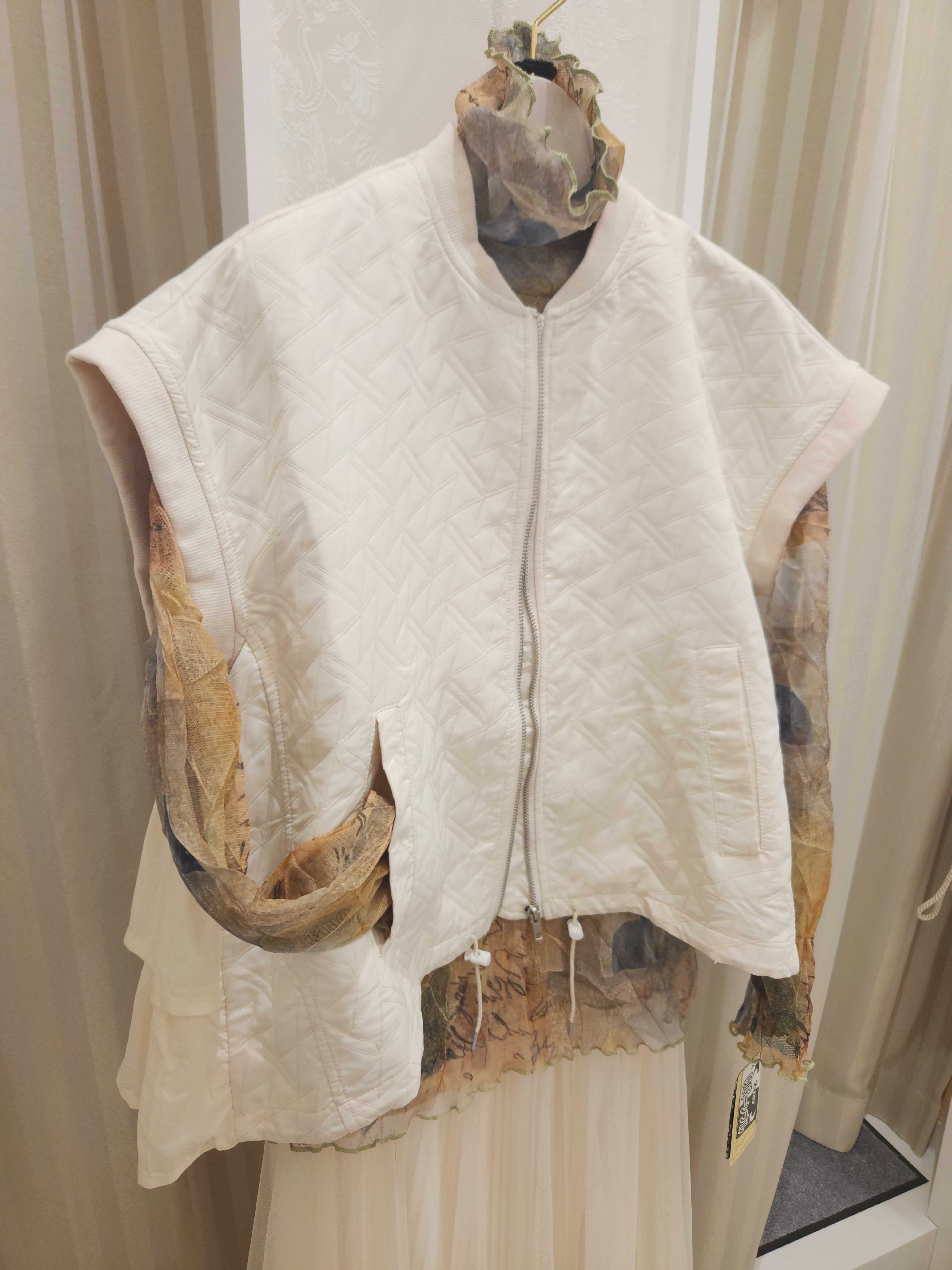 薄いお洒落なキルティング生地のたっぷり着られるモードなベスト(オフホワイト)