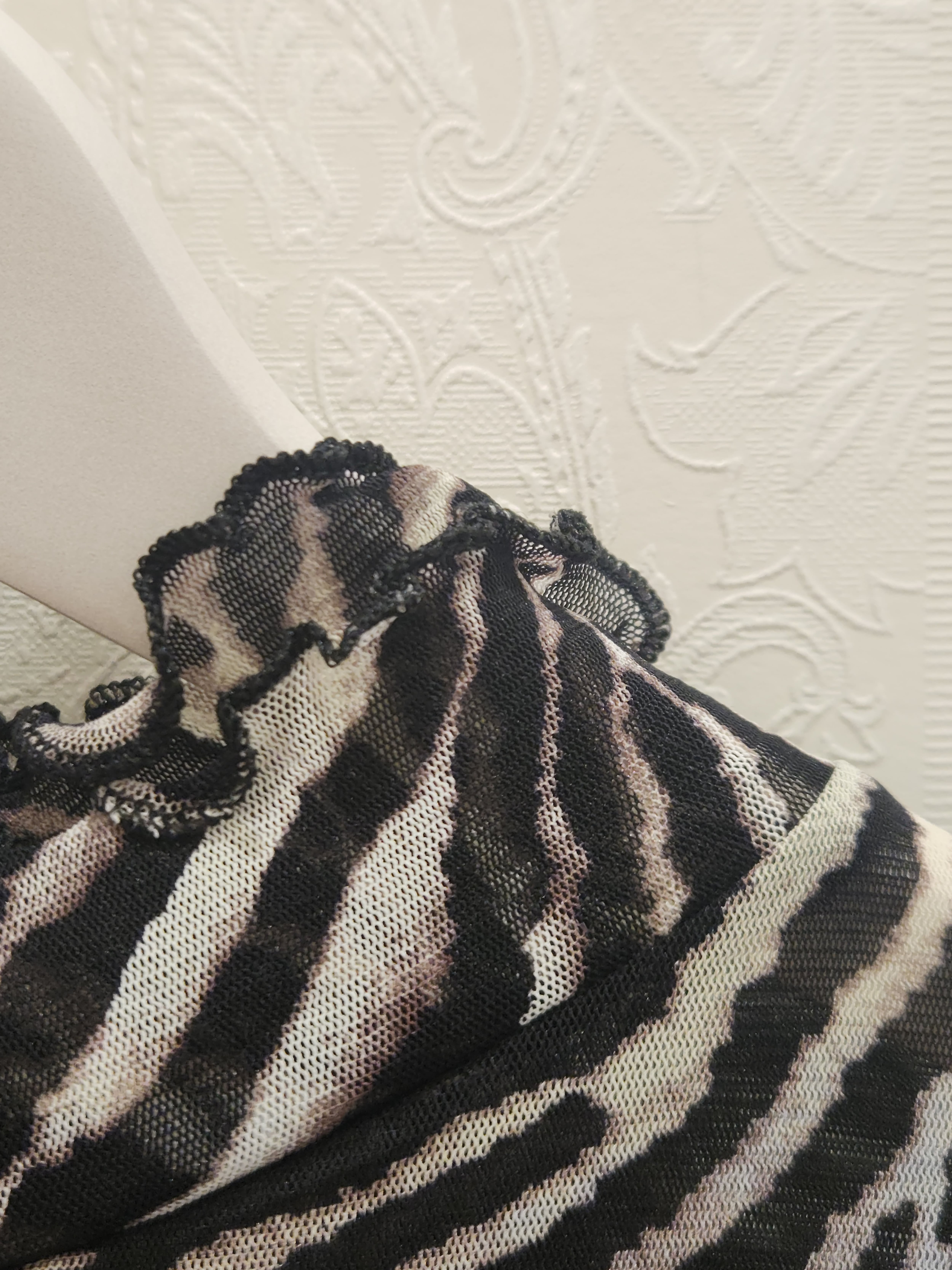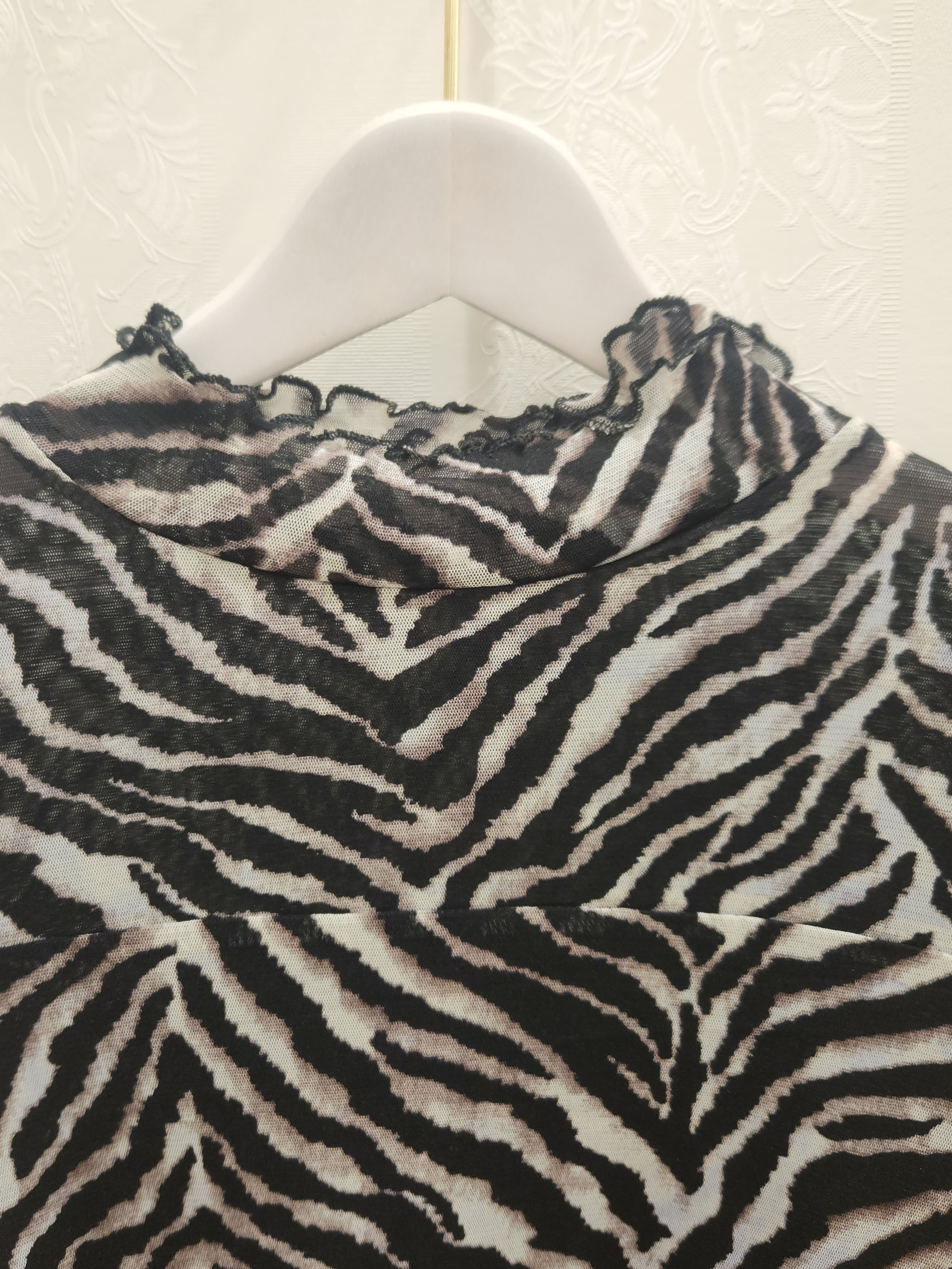首もとフリフリ上品さが漂うゼブラ柄の肌触り抜群ネット素材トップス