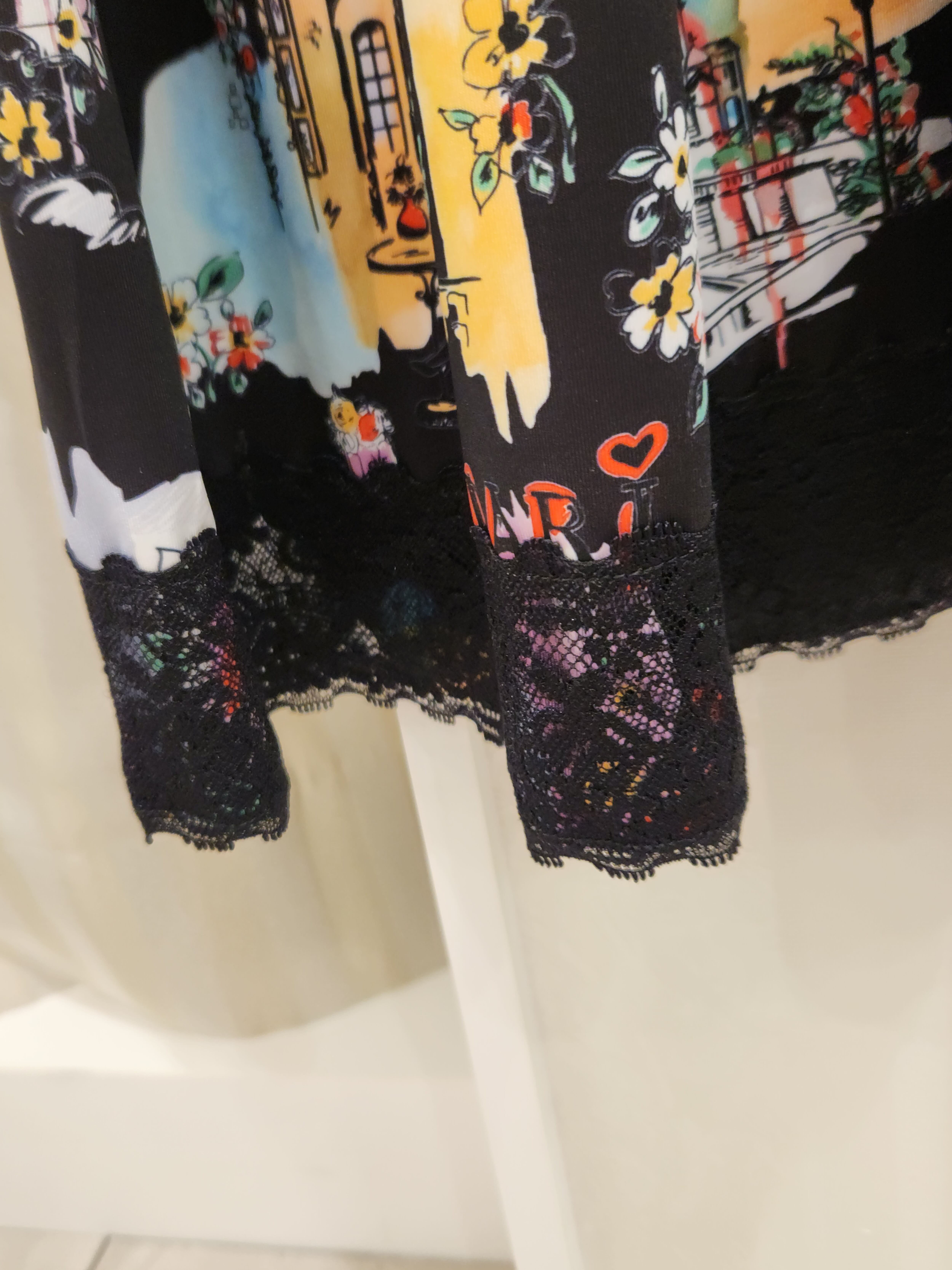 このワンピースは、柔らかく快適な素材で作られており、着るたびに心が躍るデザインが魅力です。お洒落な風景と人々のイラストは、まるで一枚のアートのようで、周りの視線を集めること間違いなしです。コーディネートに一つ加えることで、あなたのスタイルを華やかに引き立ててくれることでしょう。