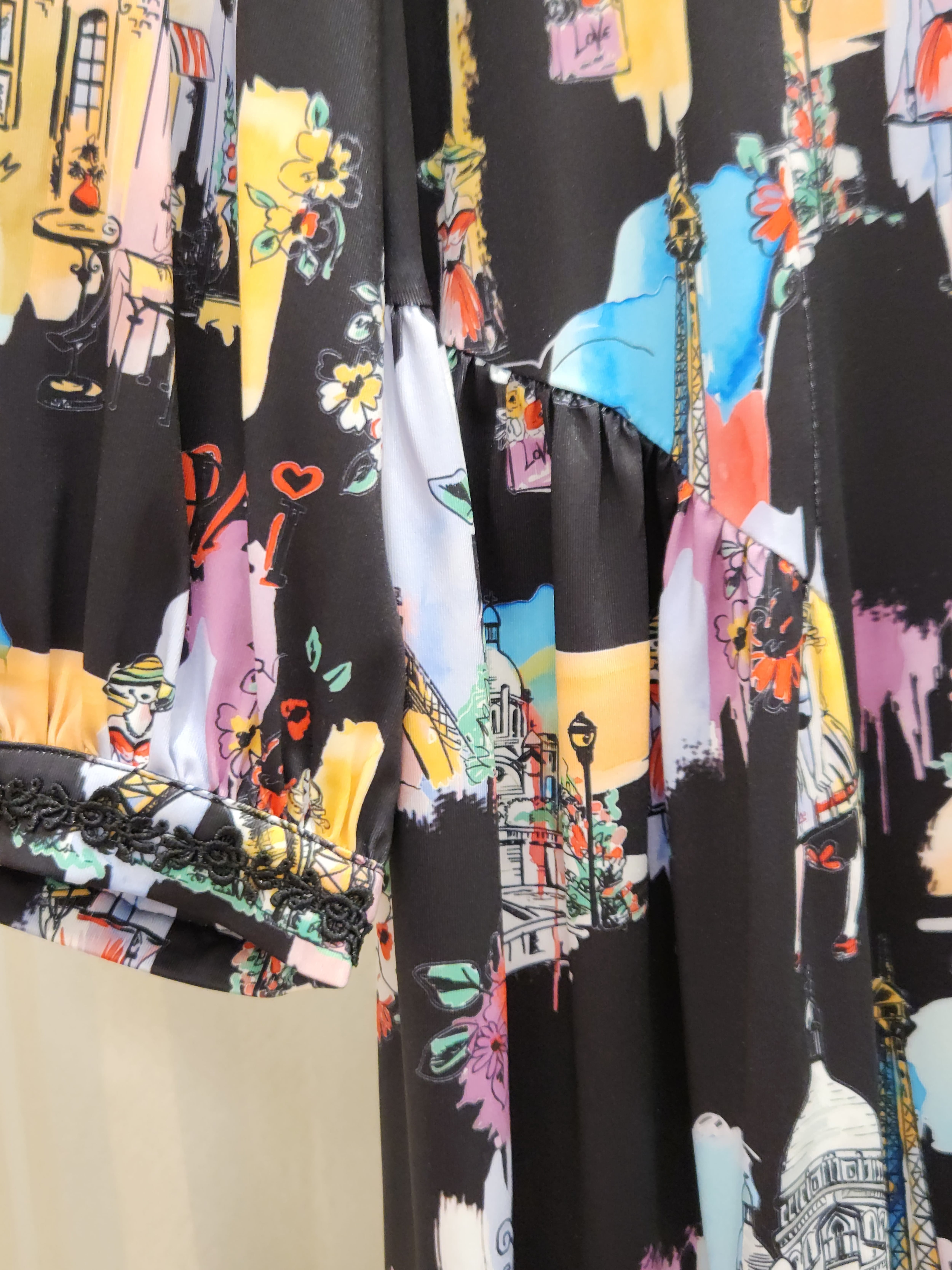 お洒落な心弾むPariの風景と人々が描かれた夢の世界が広がるワンピース(黒/40・44号)