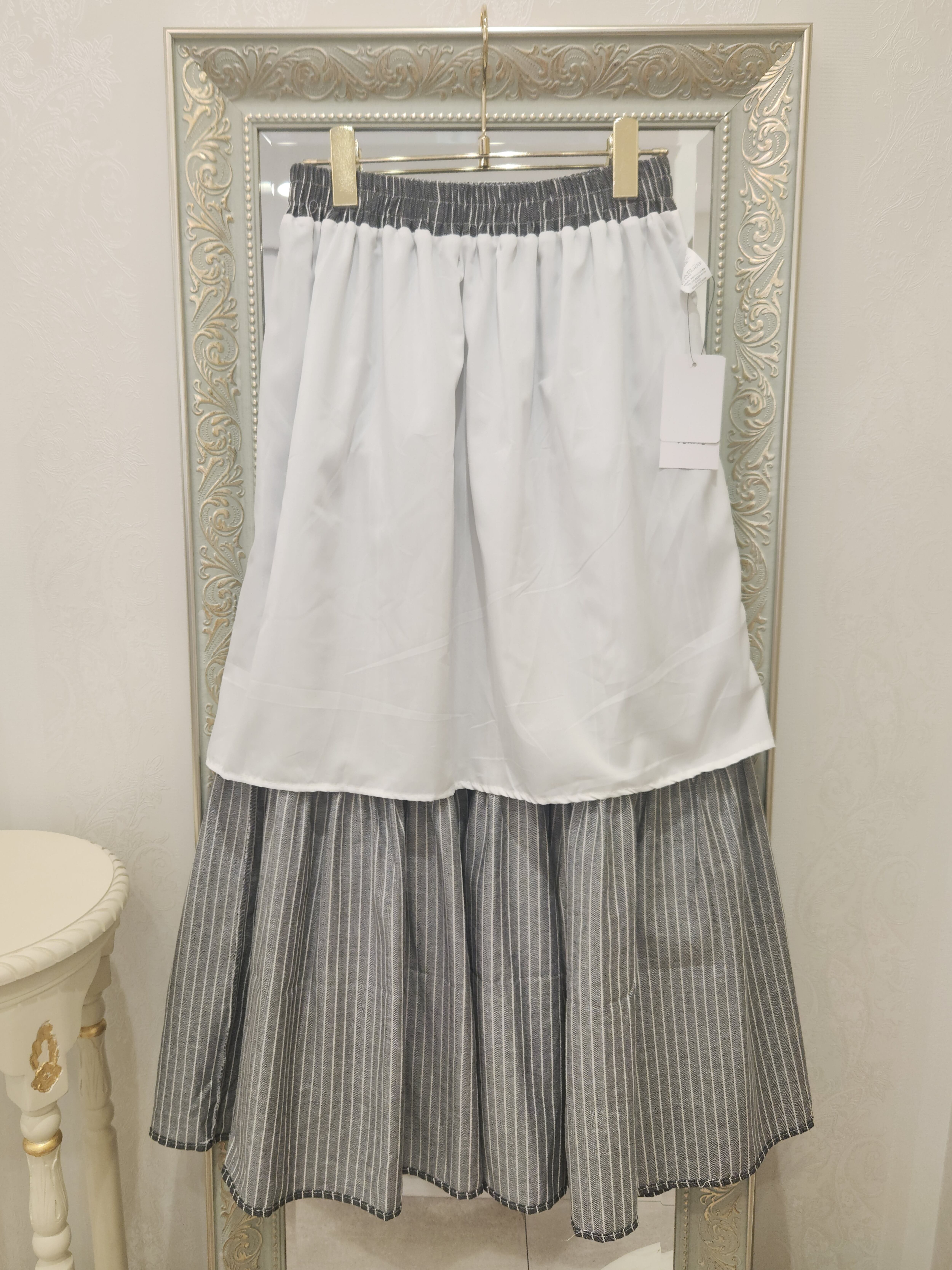 ブラックデニム調の生地にホワイトストライプがカッコよく映えるスタイリッシュなスカートです。上品なホワイトのレースがさりげなく装飾されており、カジュアルながらも特別感を演出します。このスカートは、三段階に細かいギャザーが施され、女性らしい美しいシルエットを実現!
