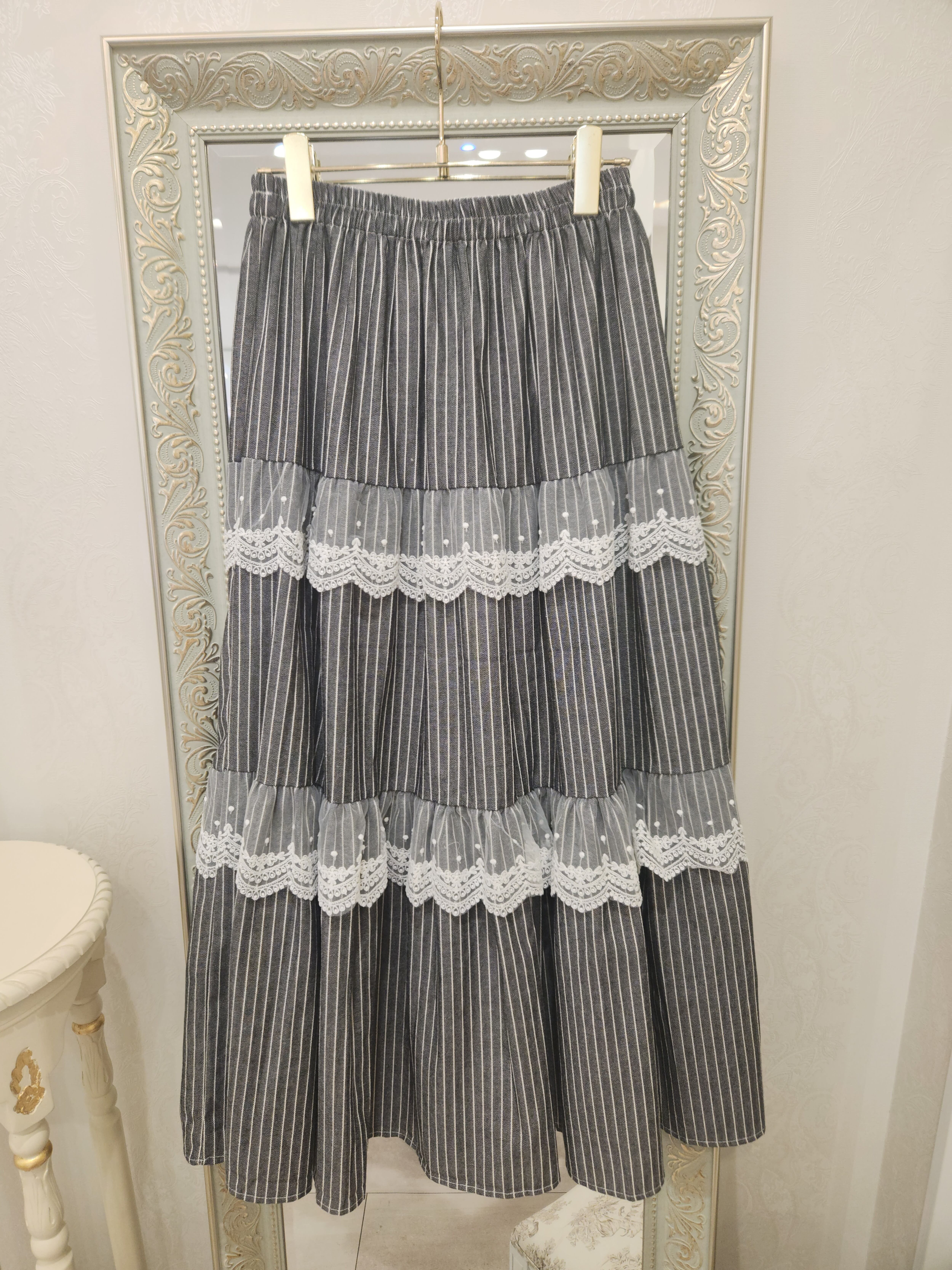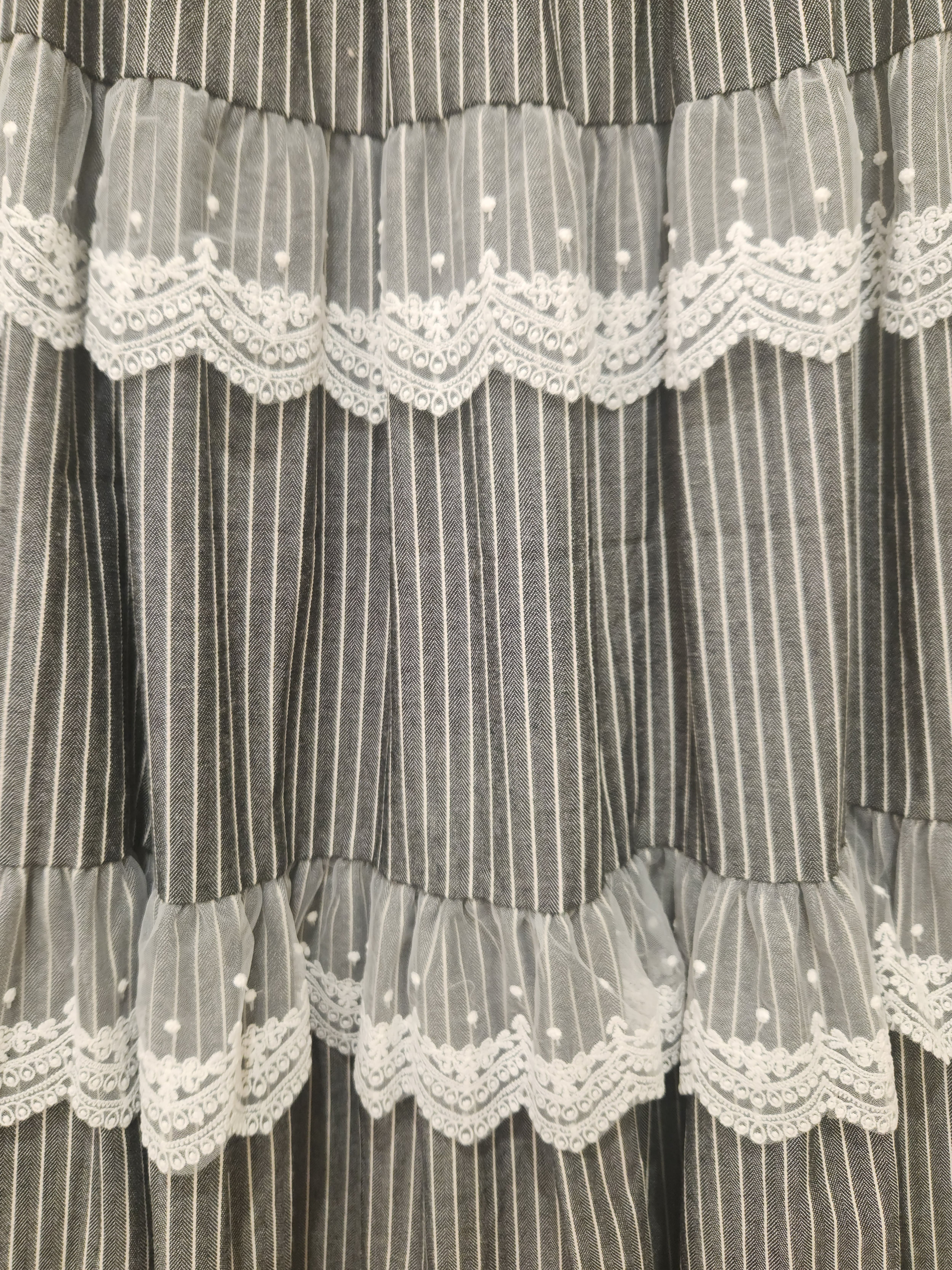 ブラックデニム調にホワイトのストライプがカッコよい生地に上品なホワイトのレースが装飾された三段階に細かいギャザーの入ったウエスト総ゴムスカート