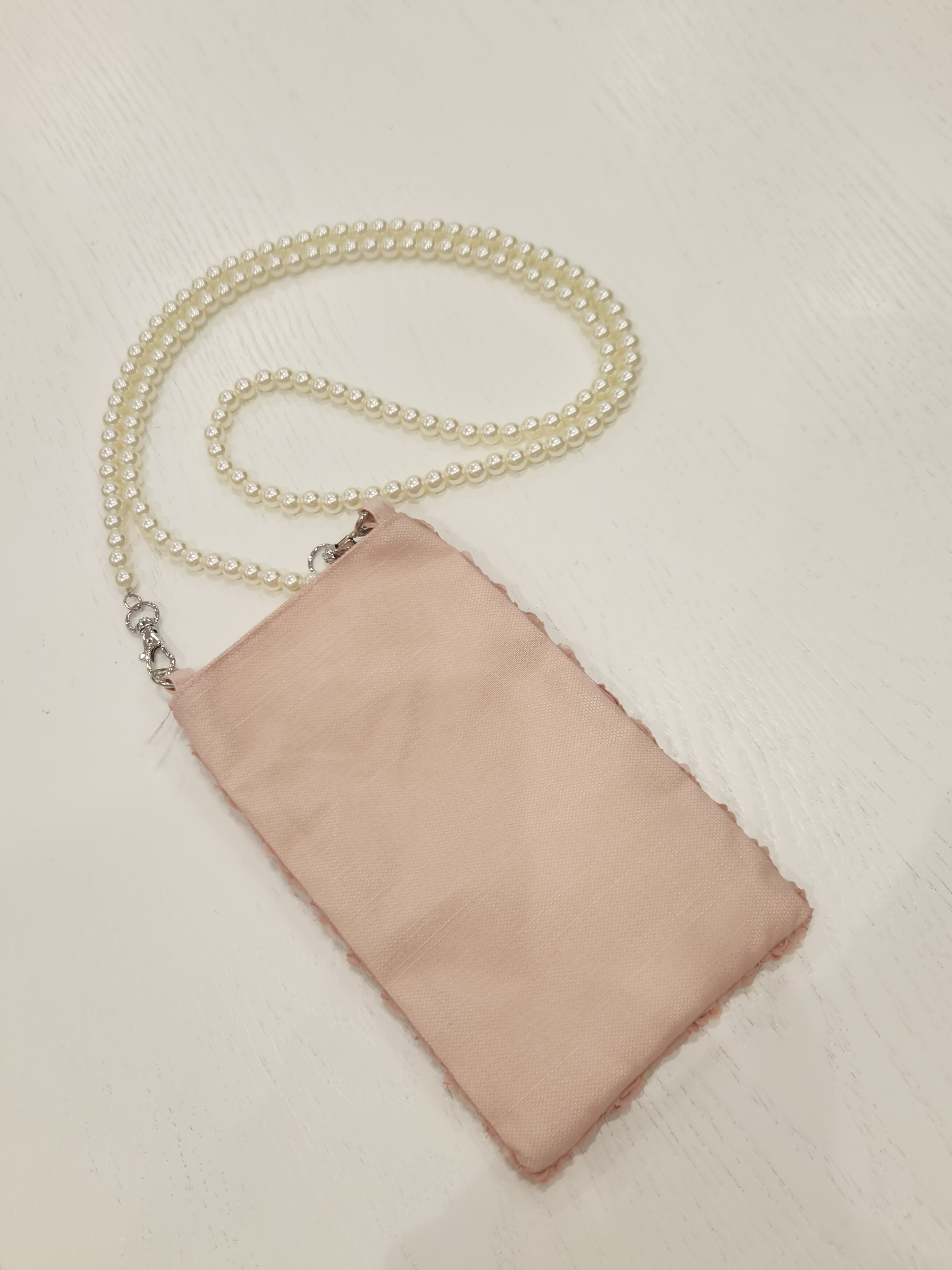 立体的な薔薇の生地を使用したこのスマホポシェットは、上品さと華やかさを兼ね備えた一品です。取り外し可能なパールのストラップが、シンプルなスタイルに華を添え、特別なシーンでも自信を持ってお使いいただけます。