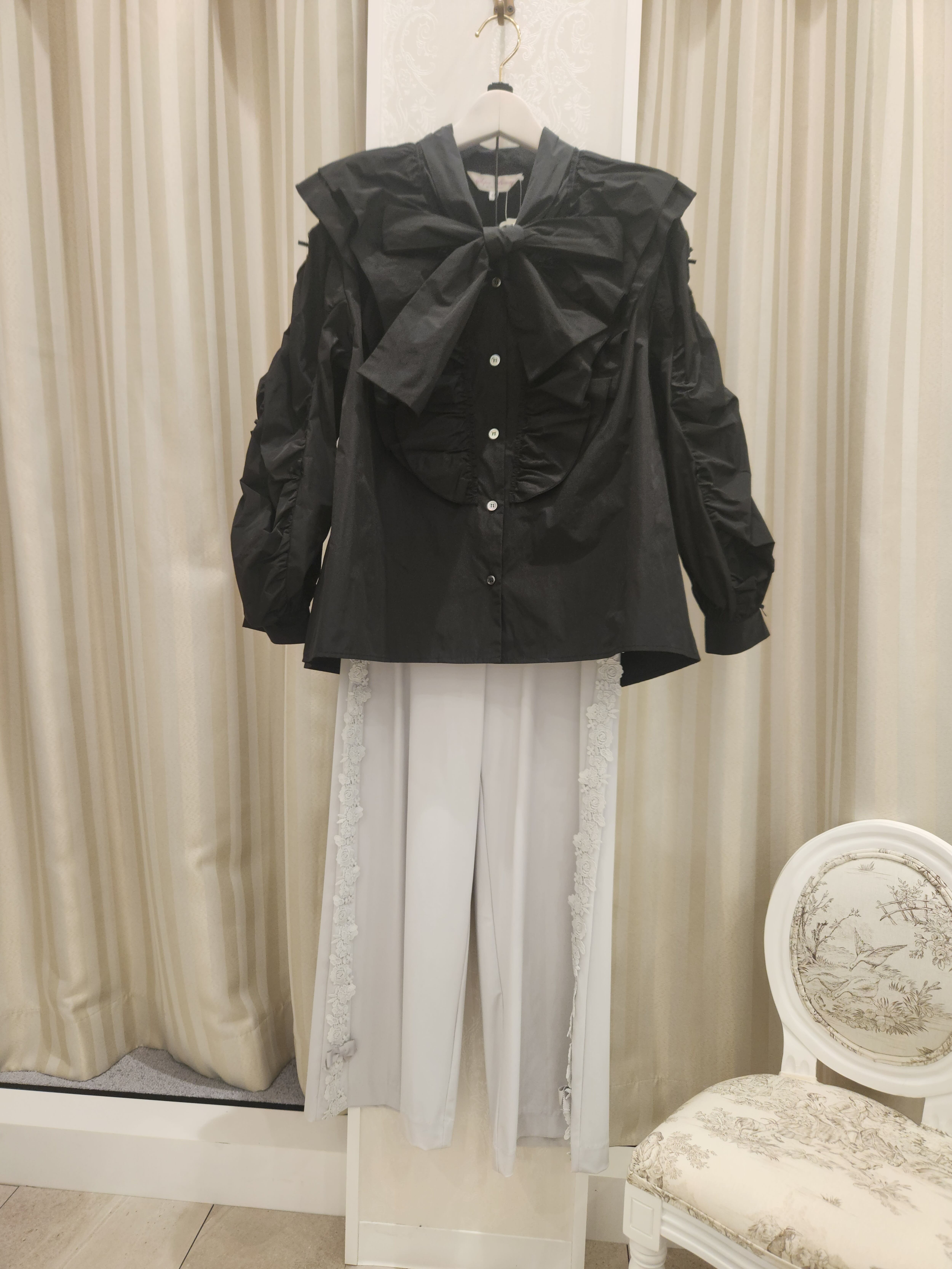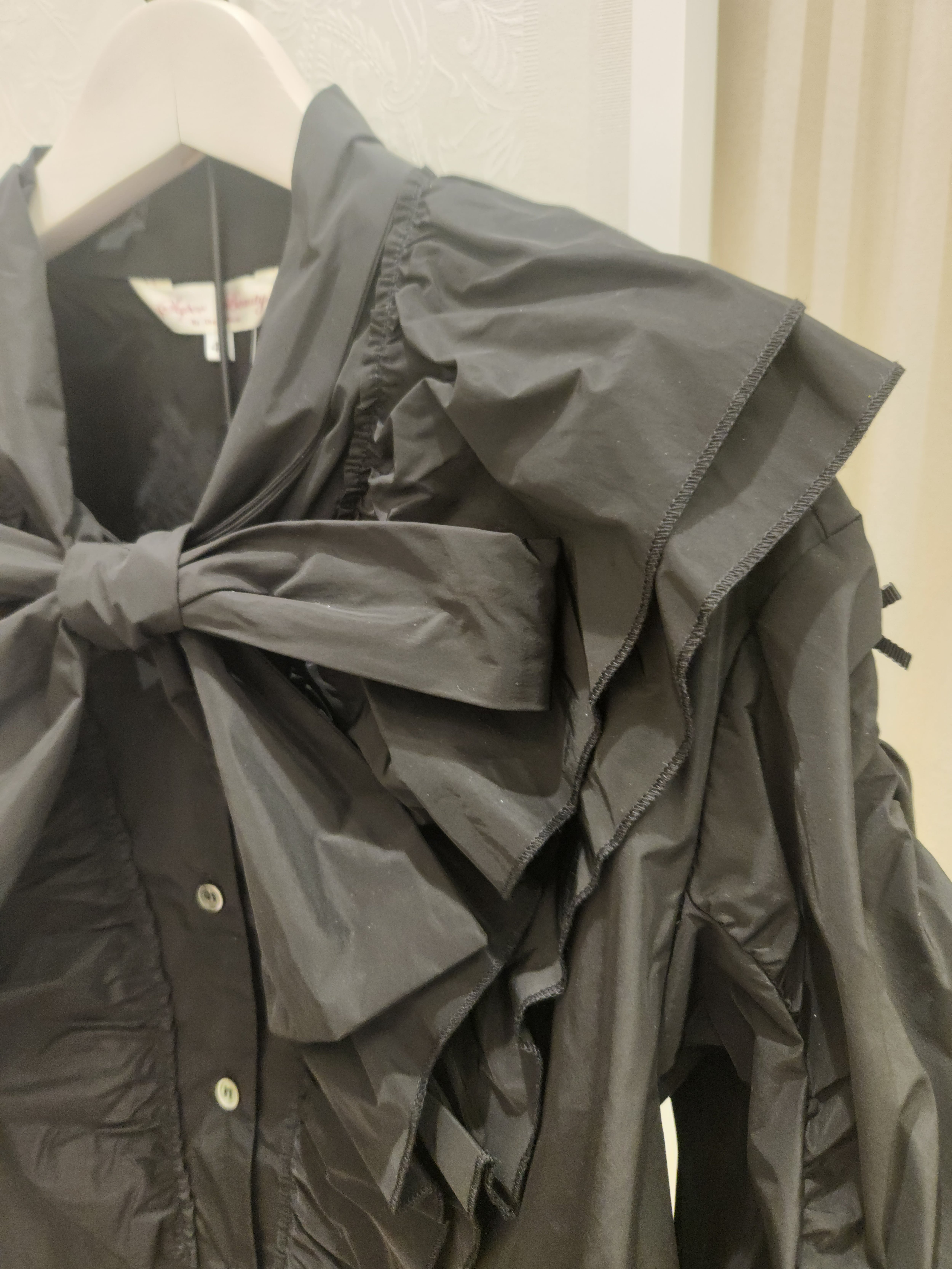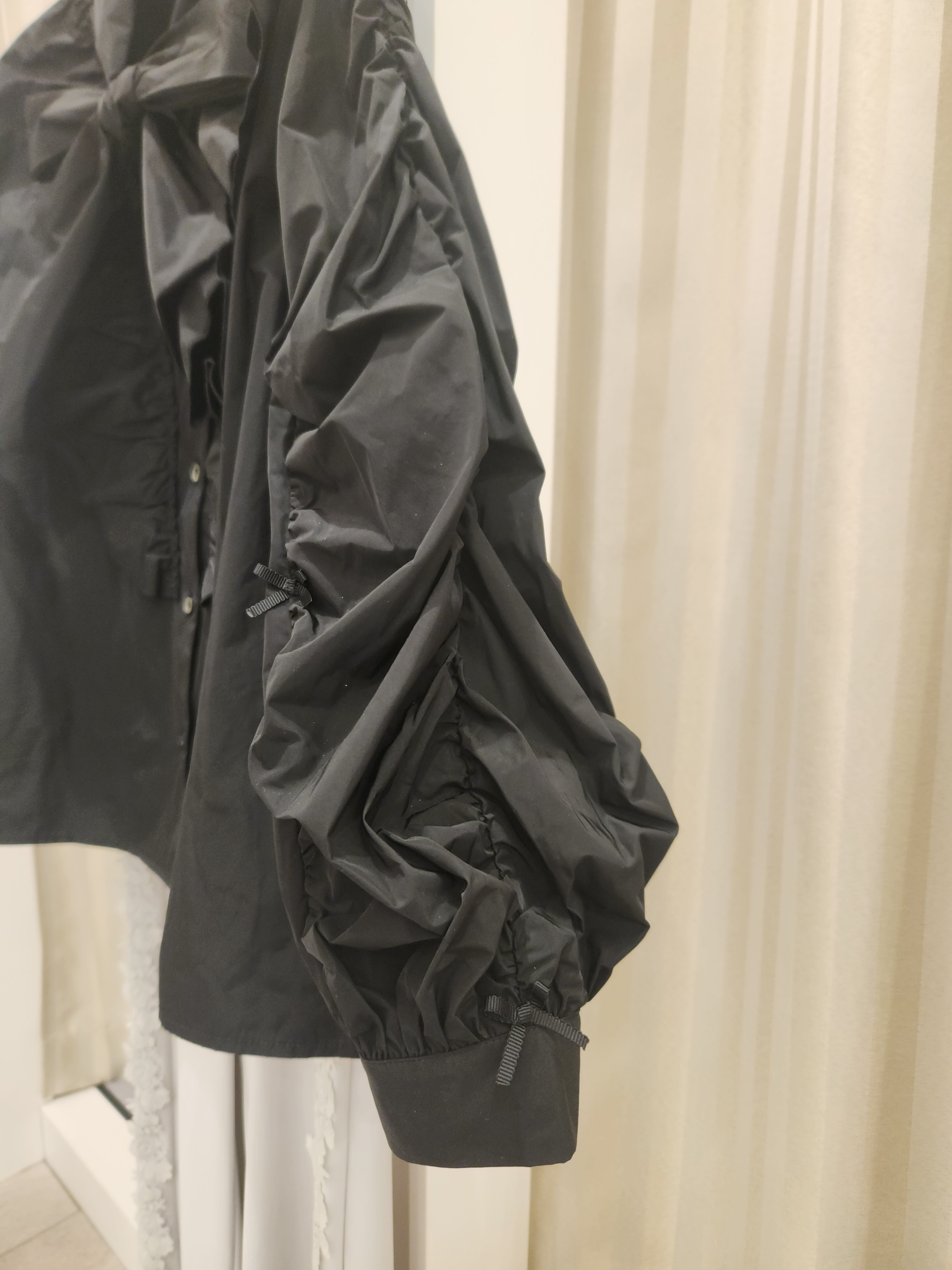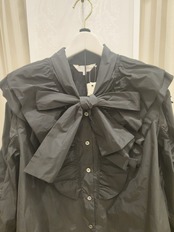 リッチな光沢を持つタフタ素材が、女性らしいエレガンスをもたらすブラウス。大きなフリルの襟とリボンタイが、顔周りを華やかに演出し、ふっくらとしたお袖に散りばめられた小さなリボンが大人可愛らしさをプラス。デイリーから特別なシーンまで、お洒落を堪能できる一着です。