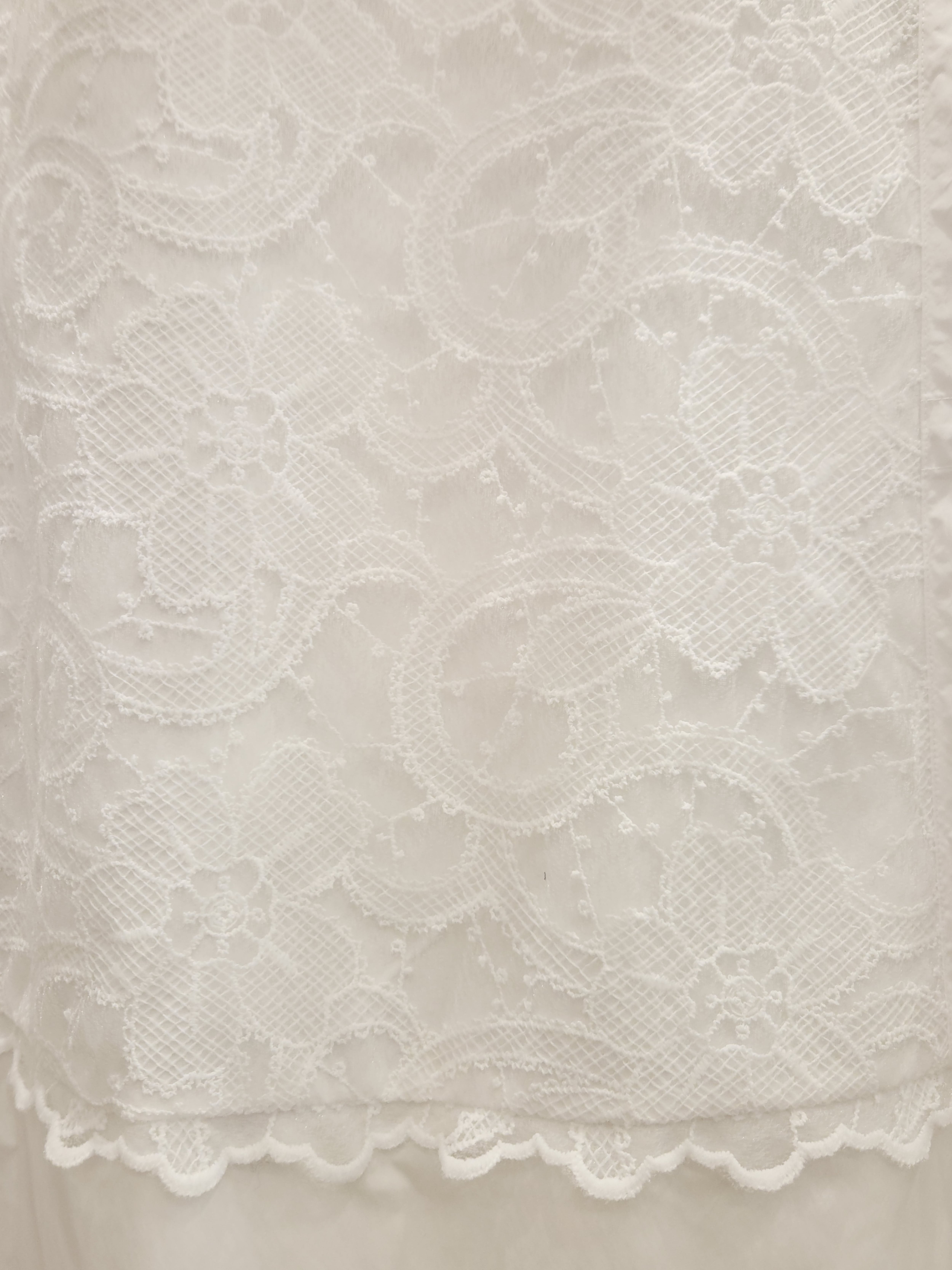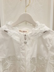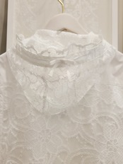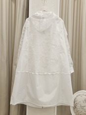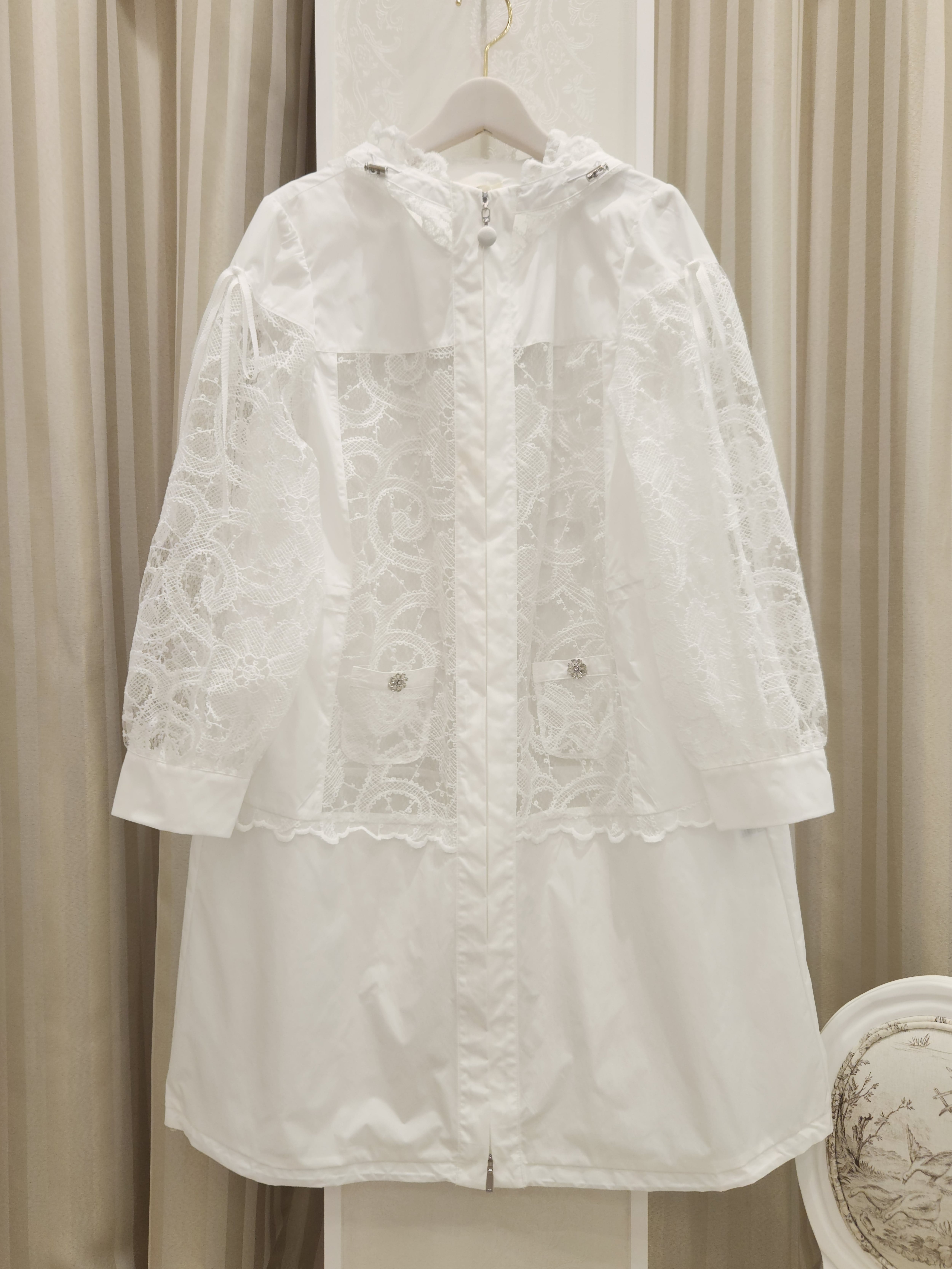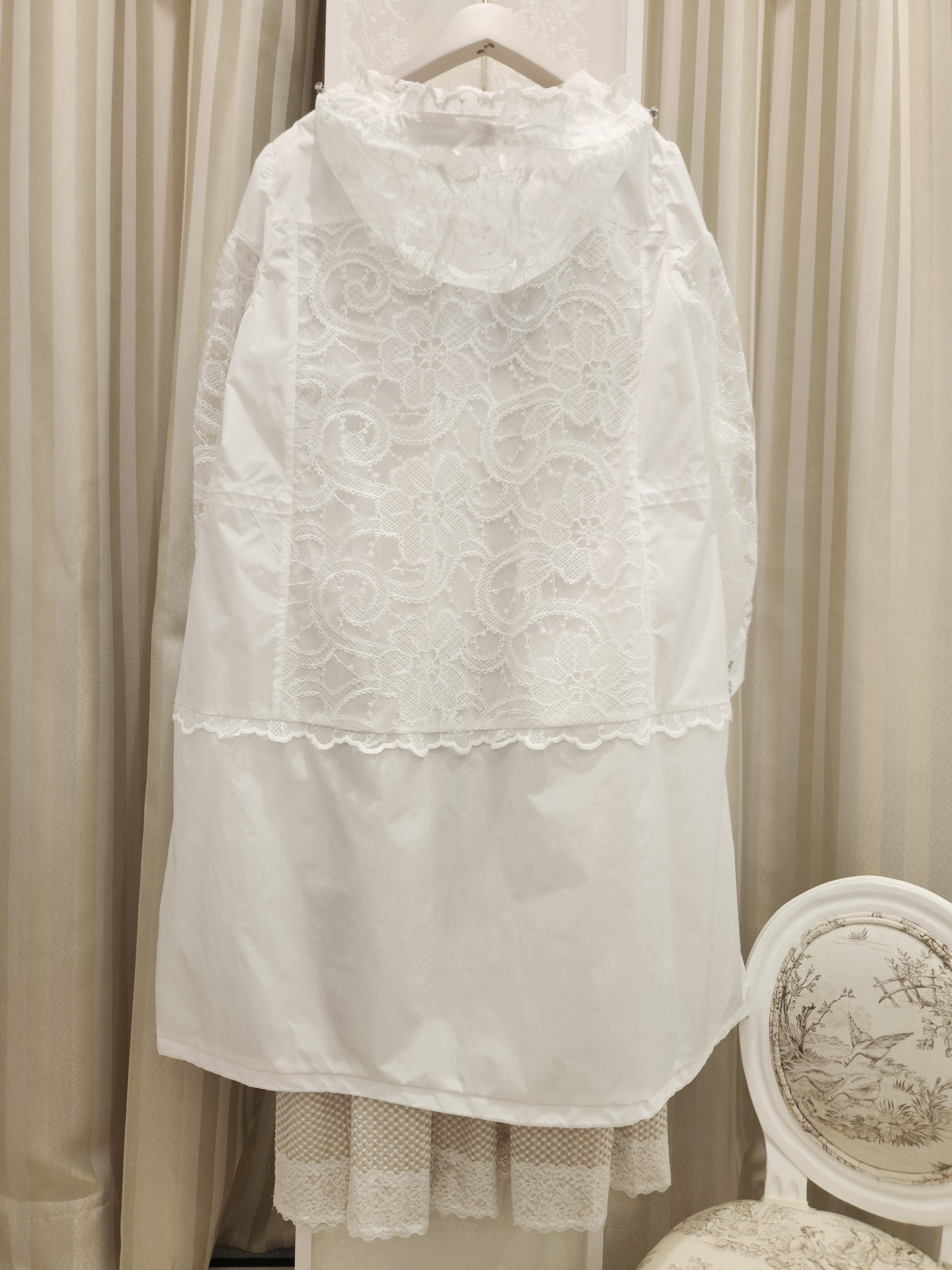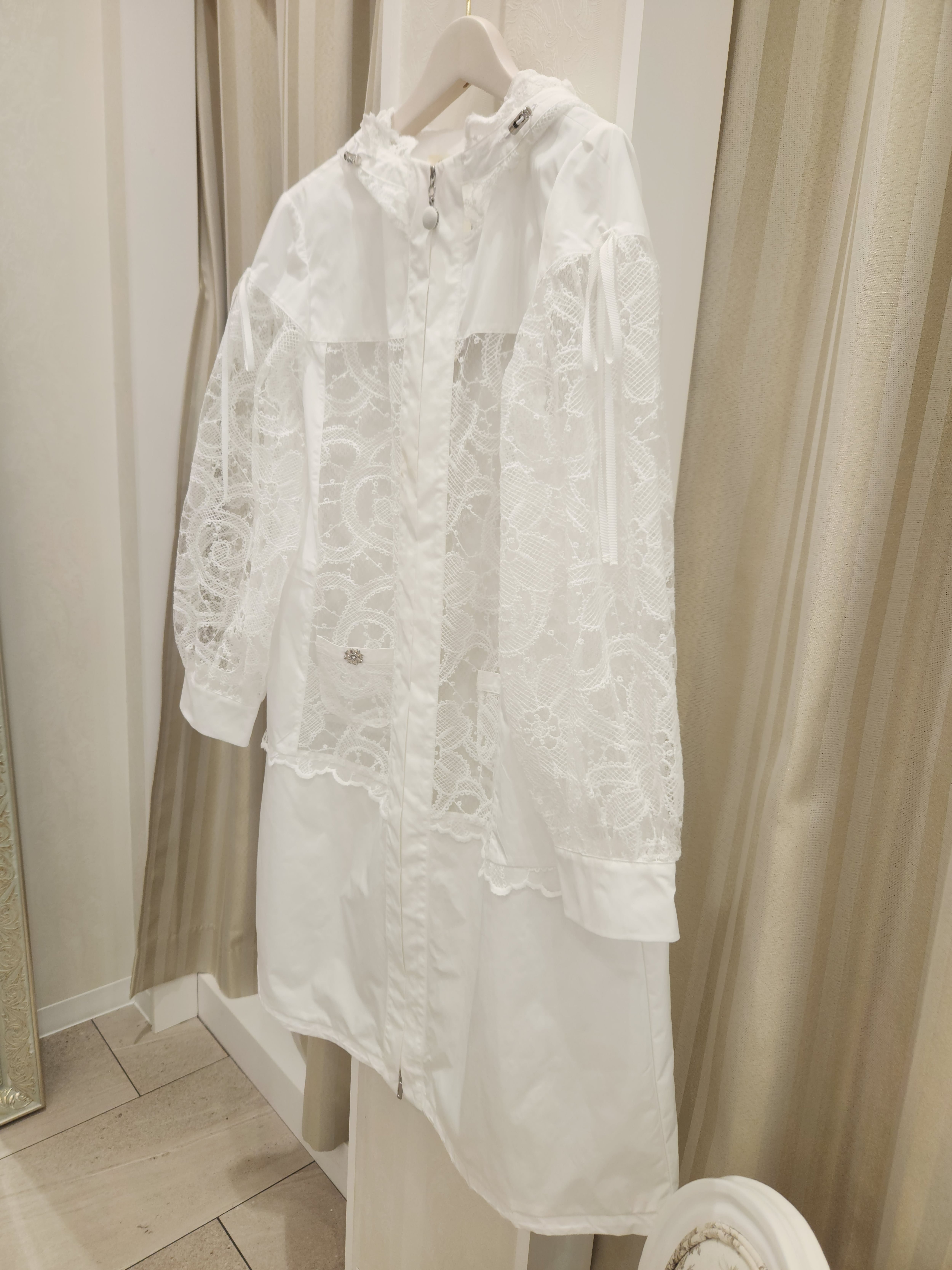 エレガントなレースとタフタ生地の組み合わせが特徴的なこのフード付きコートは、女性らしさを引き立てる洗練されたデザインが魅力です。軽やかな素材感とフードの付いたスタイルは、カジュアルシーンから特別な日まで幅広いシーンで活躍すること間違いなしです。