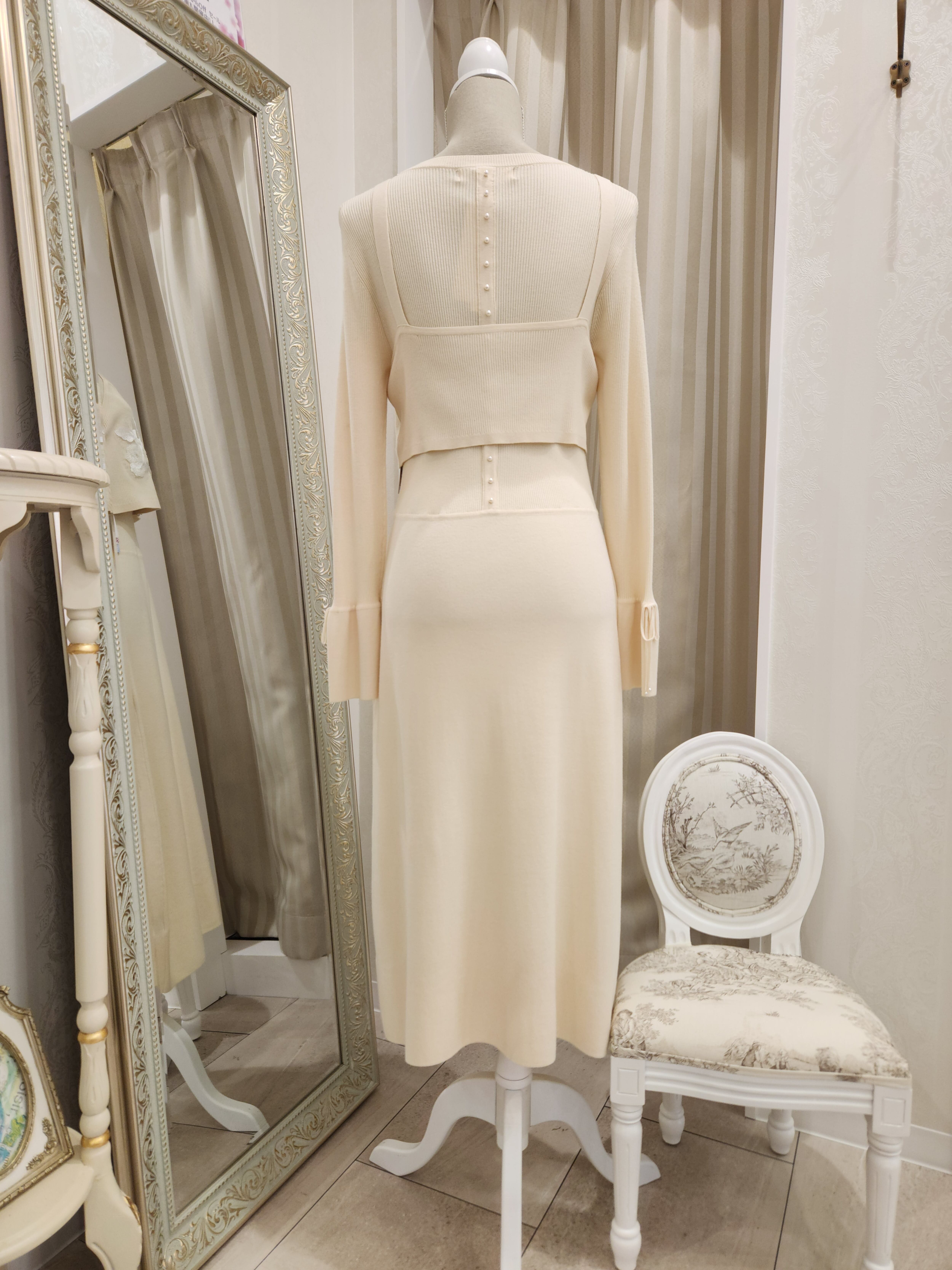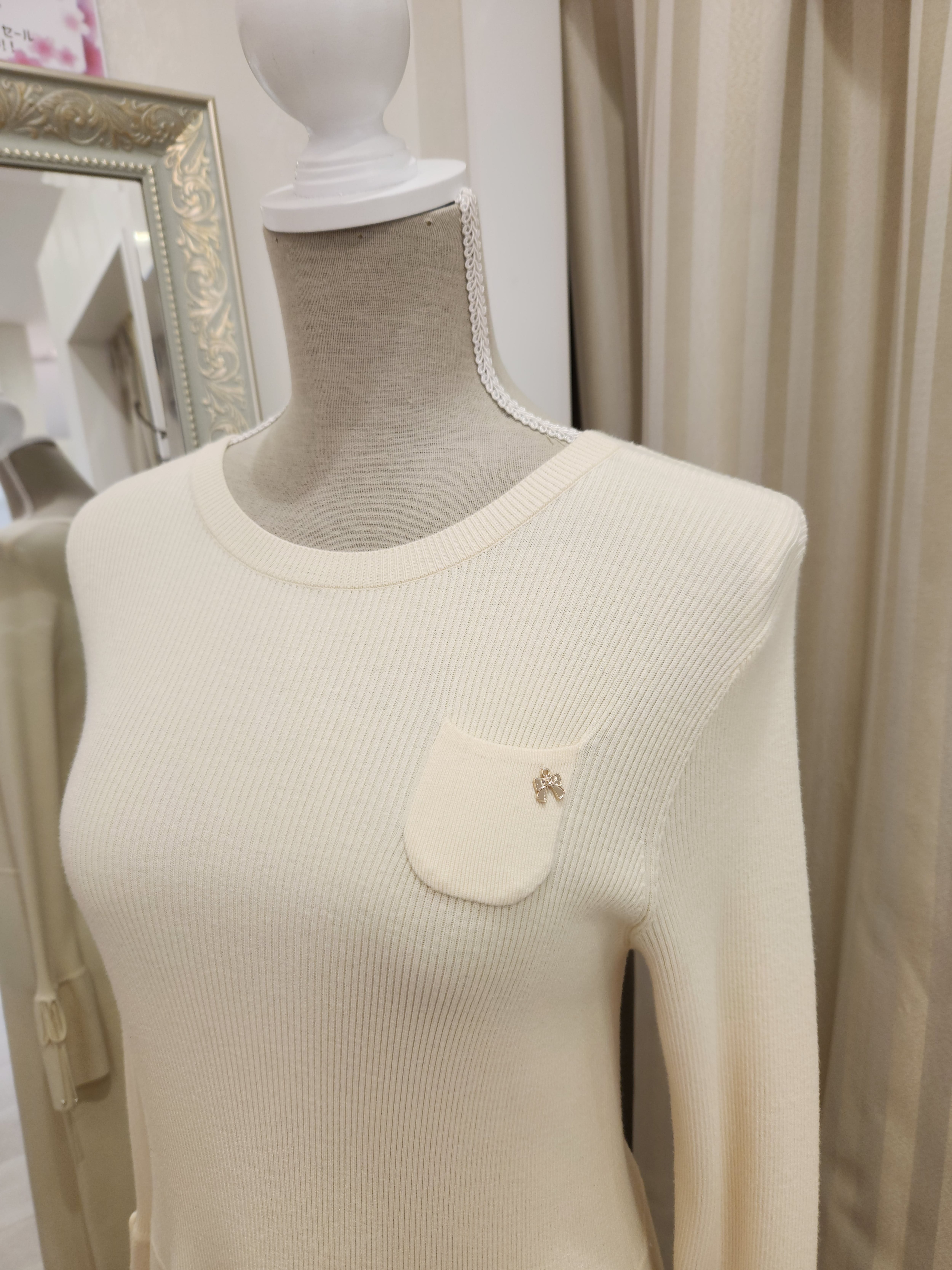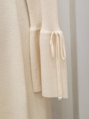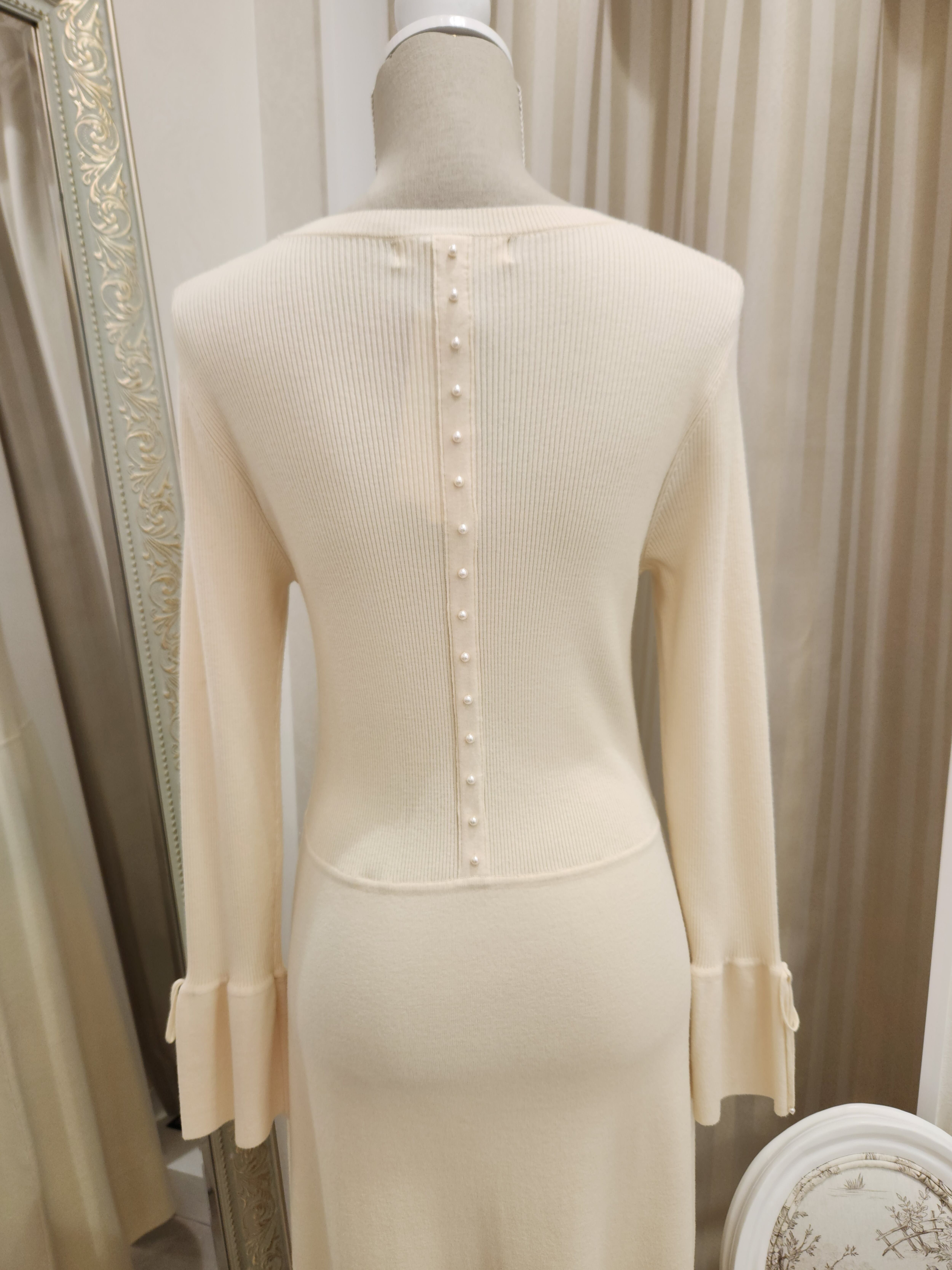 このニットワンピースは、優雅な姫袖と背中に施されたパール装飾が目を引く上品なデザインです。お袖の細いリボンが女性らしいアクセントとなり、どこか大人可愛い雰囲気を醸し出します。心地よいニット素材が身体を優しく包み込み、着心地も抜群です。