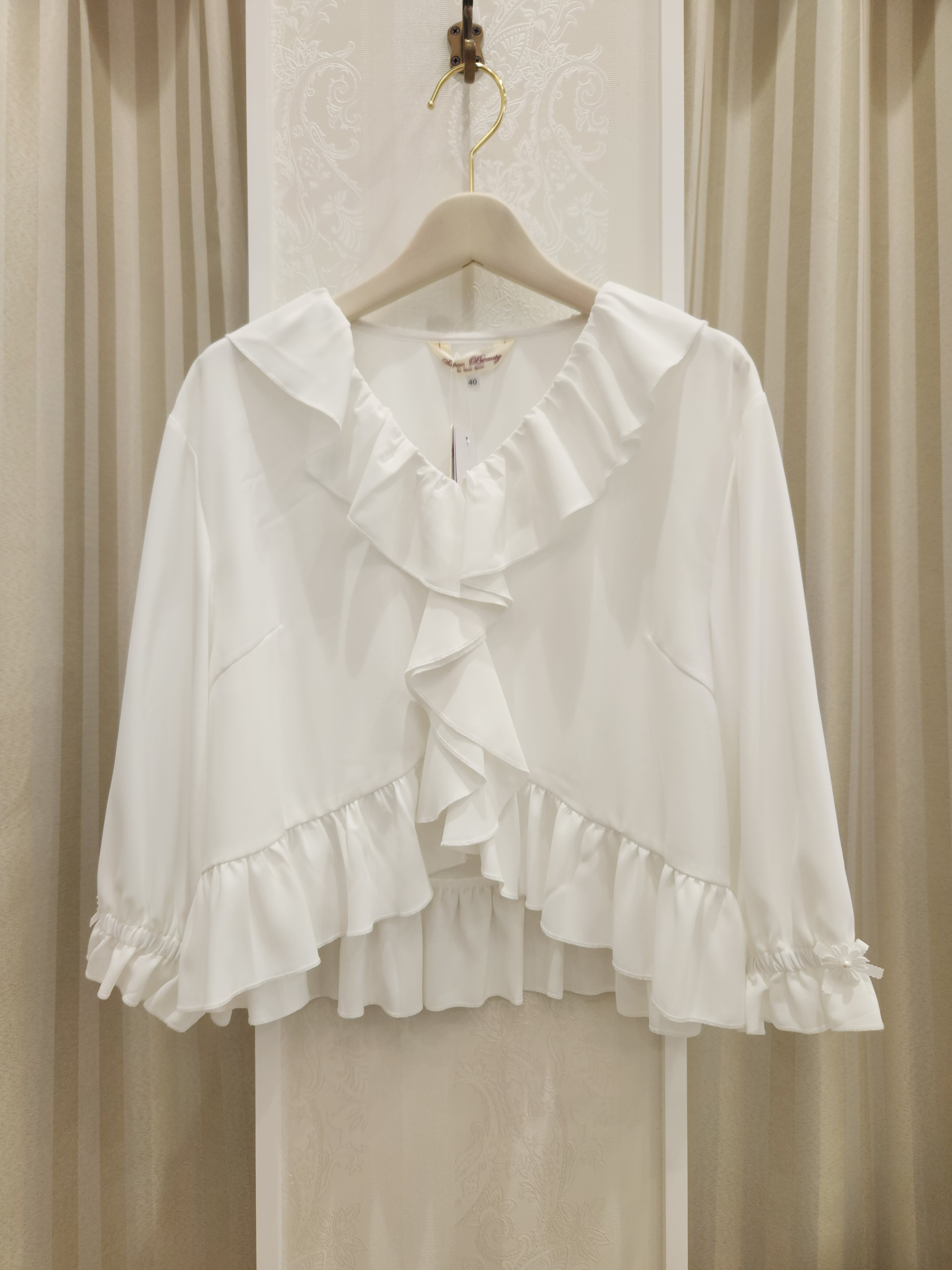 フリルとお花のデザインが華やかさを添え、シンプルなコーディネートに優雅さをプラスします。カジュアルな日常使いから、ちょっとしたお出かけや特別な場面まで、幅広く活躍すること間違いありません。このホワイトフリルボレロを取り入れて、あなたのファッションをさらに格上げしてみてはいかがでしょうか?お洒落なアイテムをぜひお手元にお迎えください!