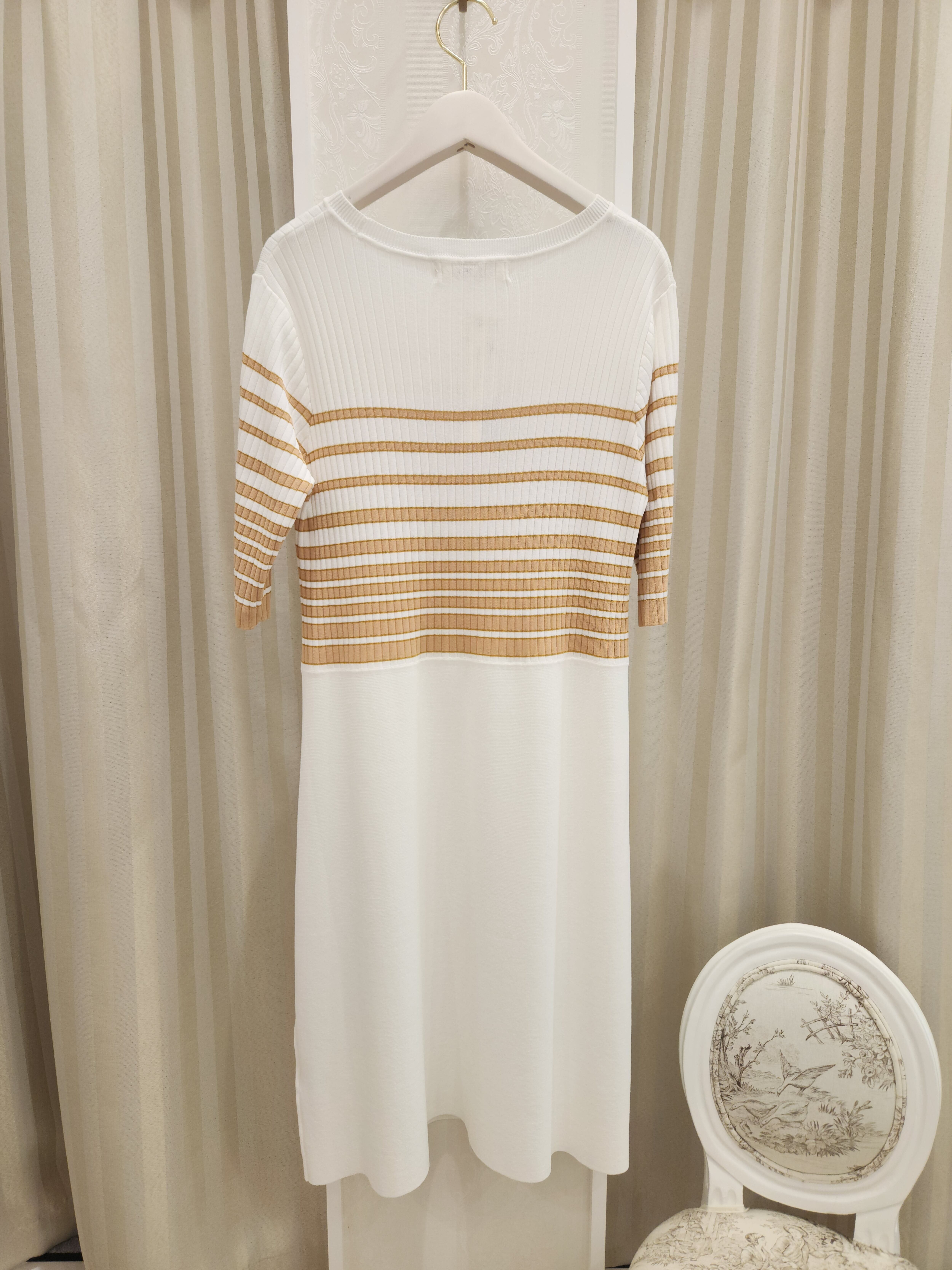 型崩れしない高級感あるホワイトニットワンピース。ゴールドのラインや小さなリボン、お花の装飾が華やかさをプラス!