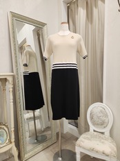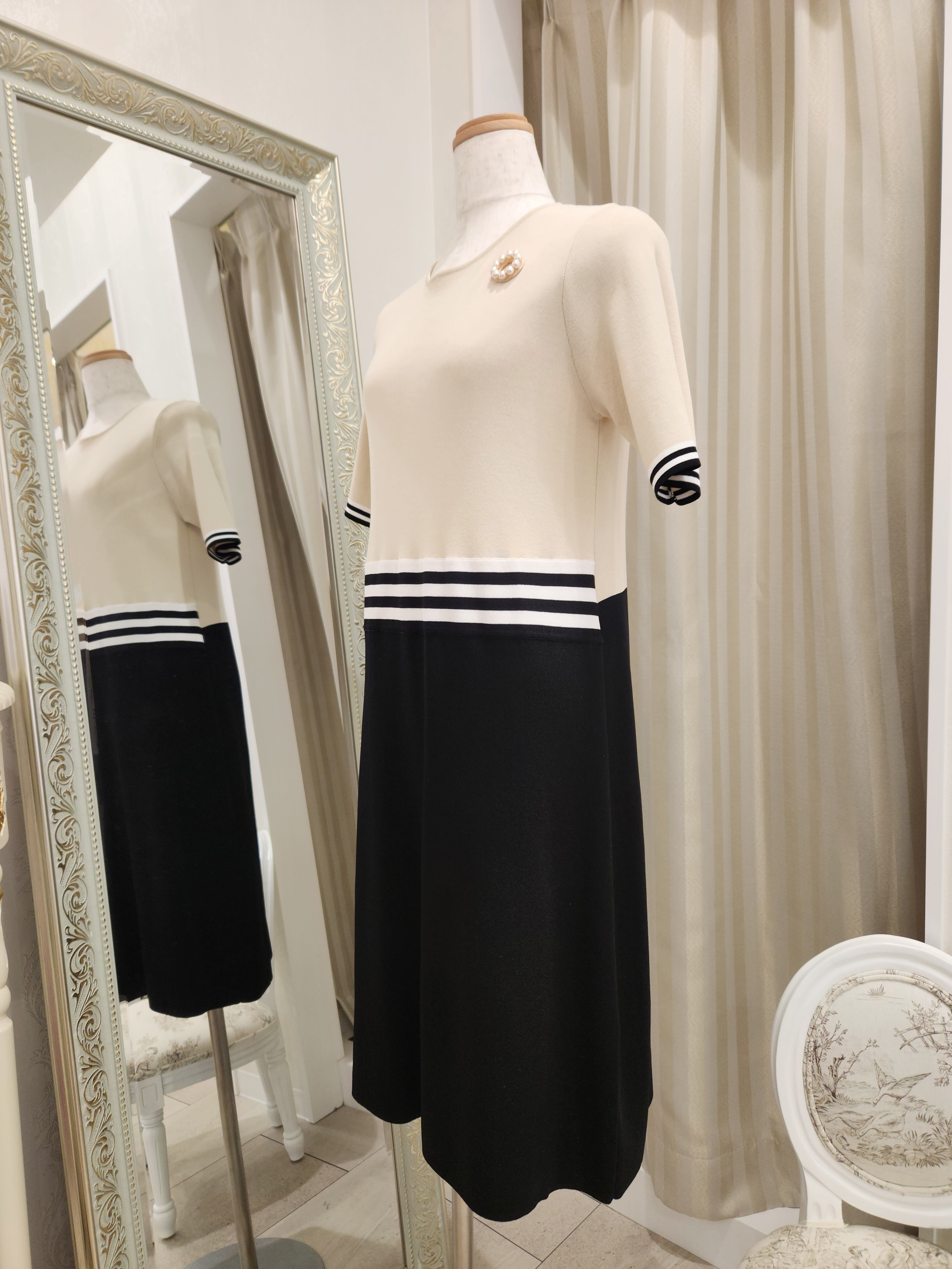 【Super Beauty / スーパービューティー★新作】質の高いニットワンピース。ベージュ×ブラックの配色と胸元のお花の形のパール装飾が上品でおとなしい可愛いらしさを演出!!