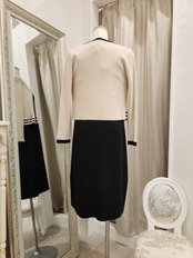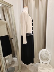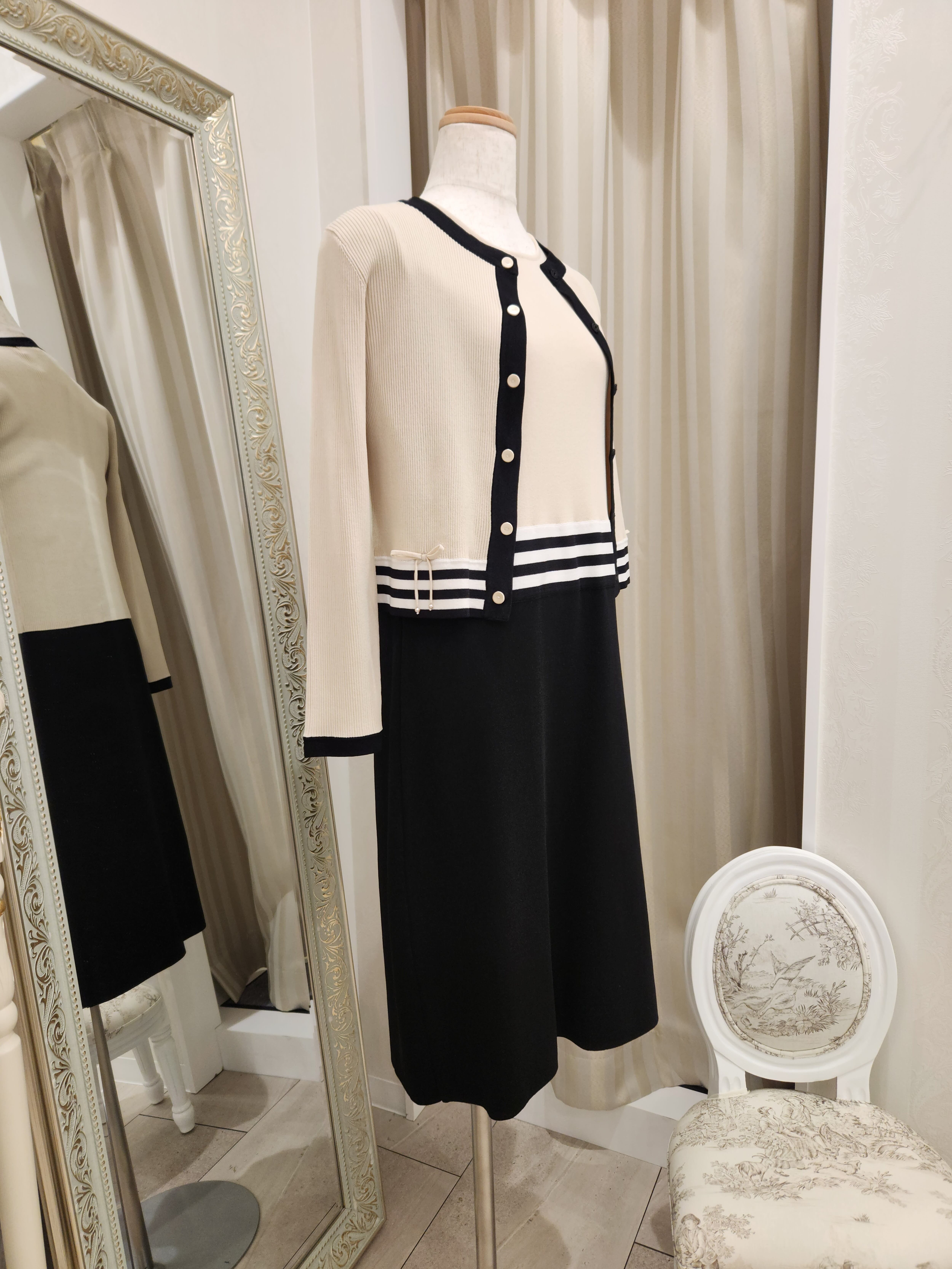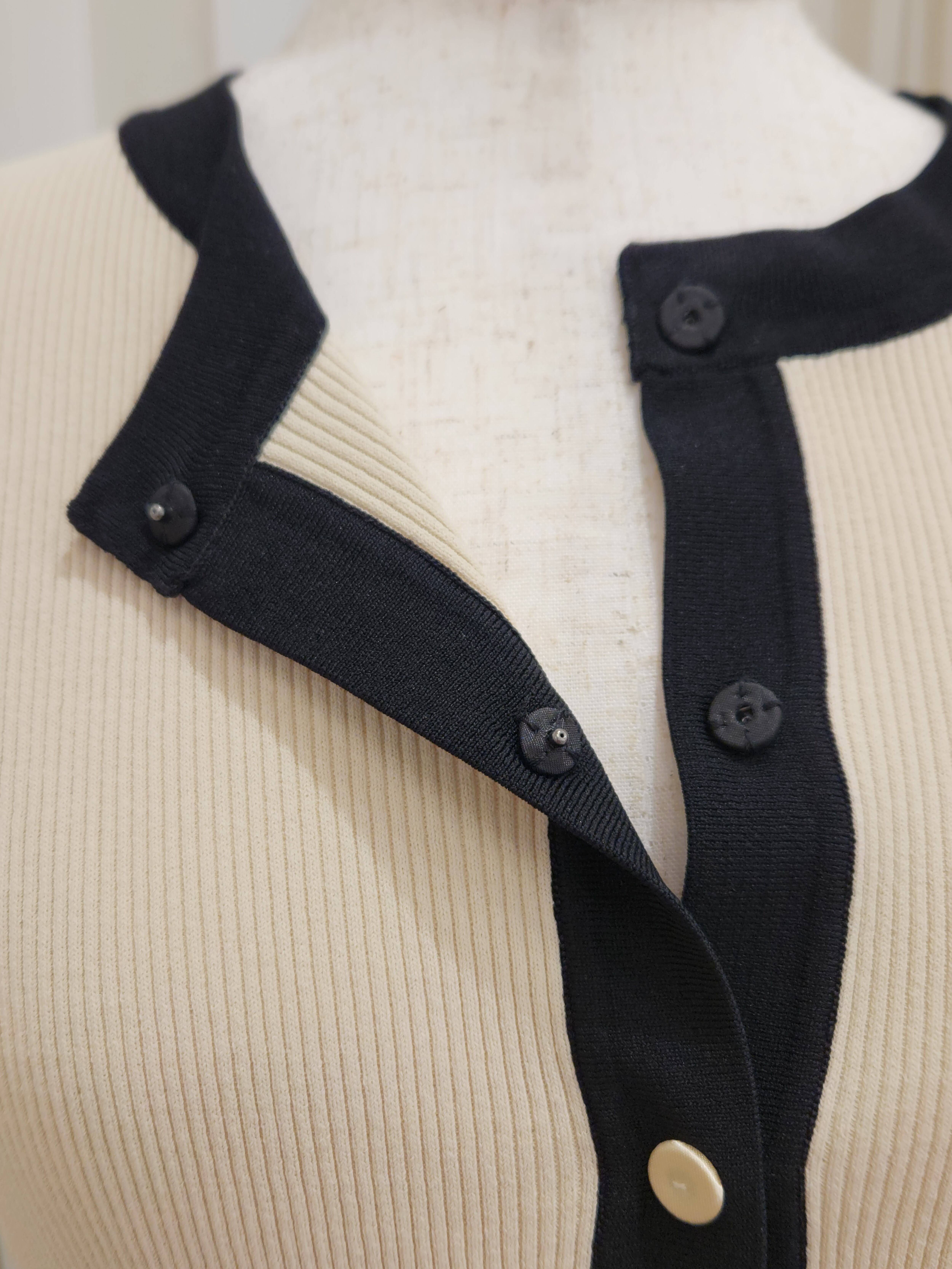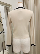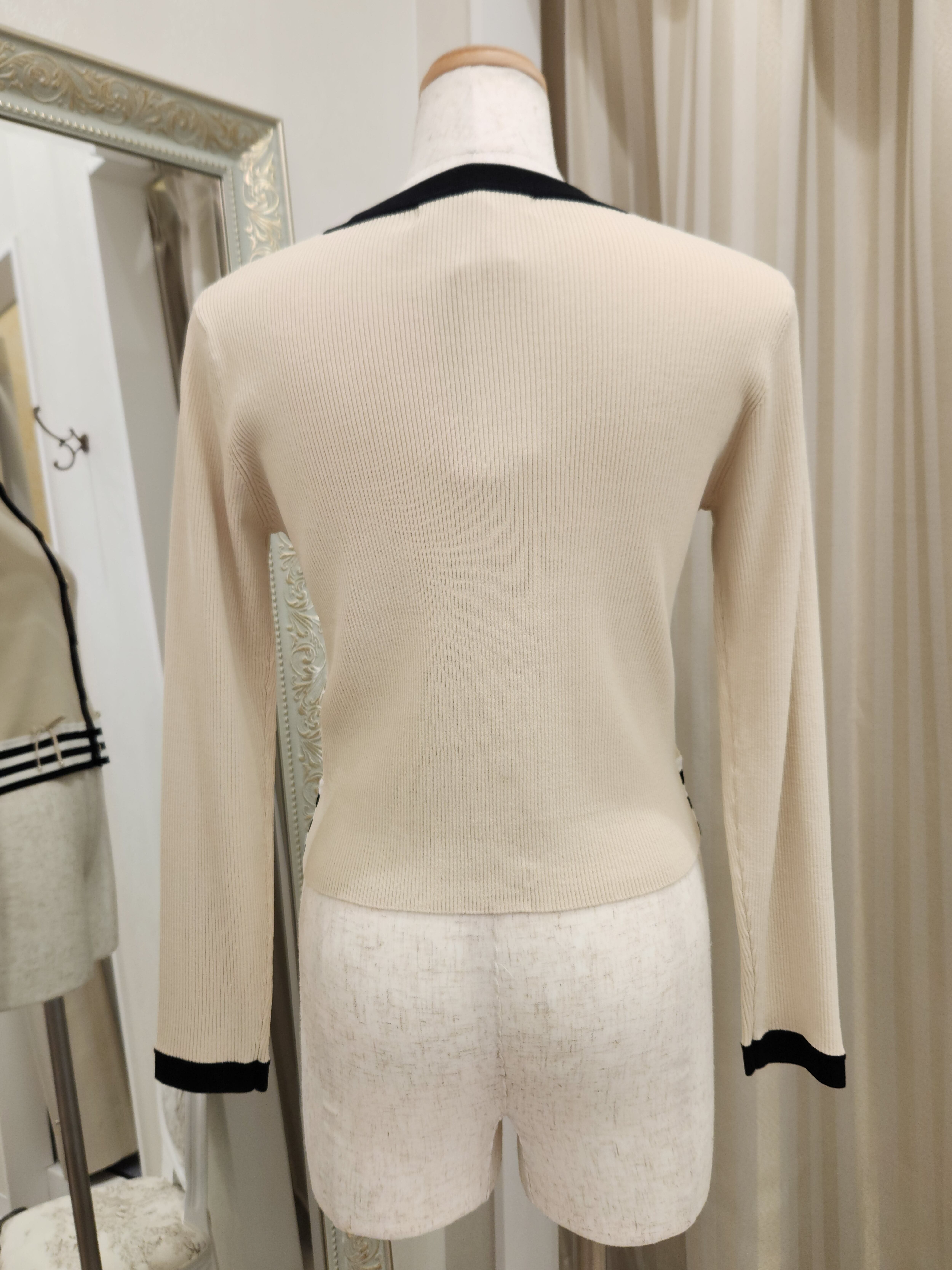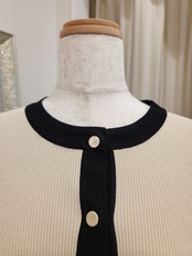 【Super Beauty / スーパービューティー★新作】ベージュ×ブラックの上品な配色カーディガン、ウエストパールを施した小さなリボンが大人可愛いらしさを演習!!