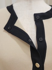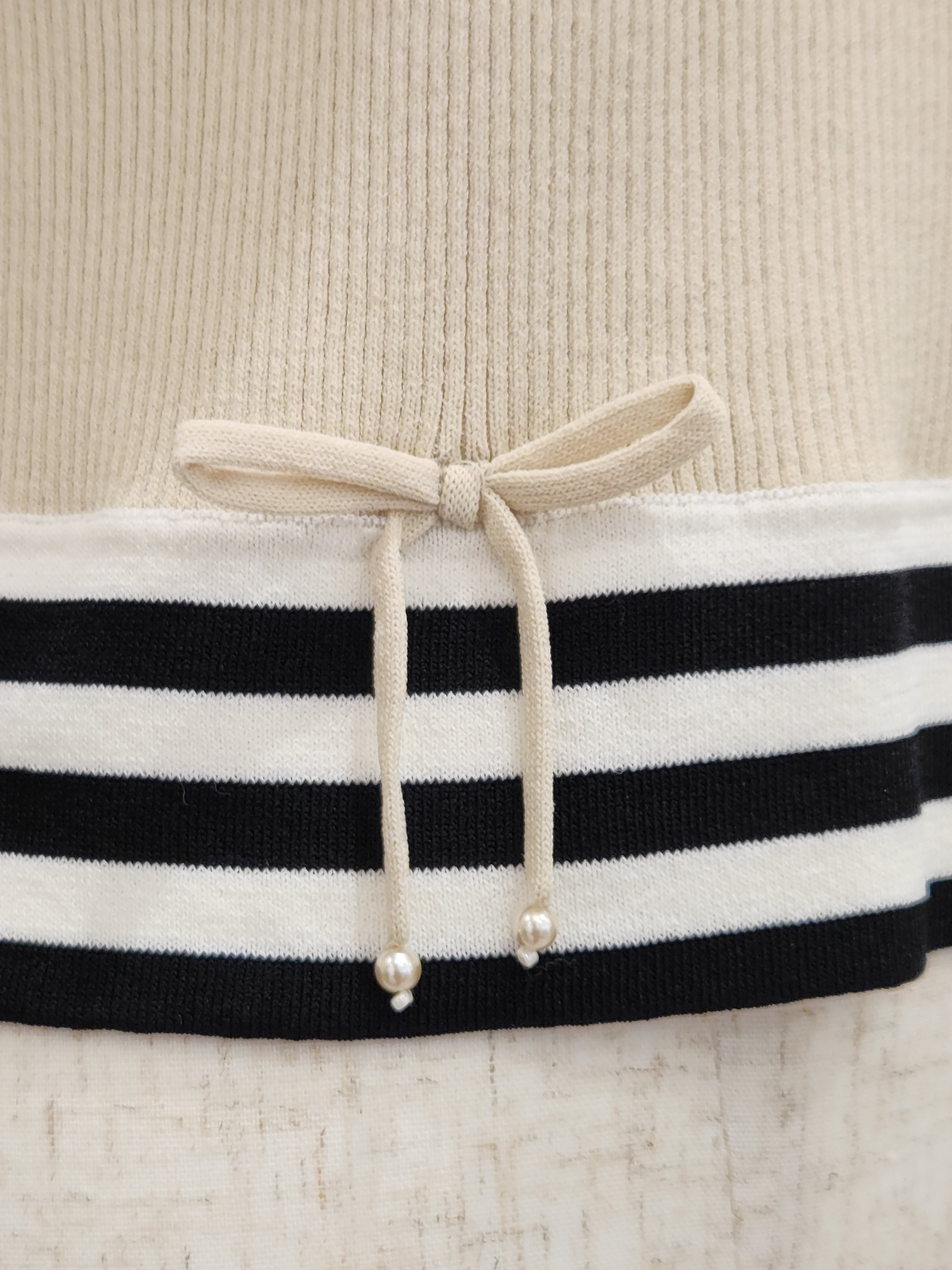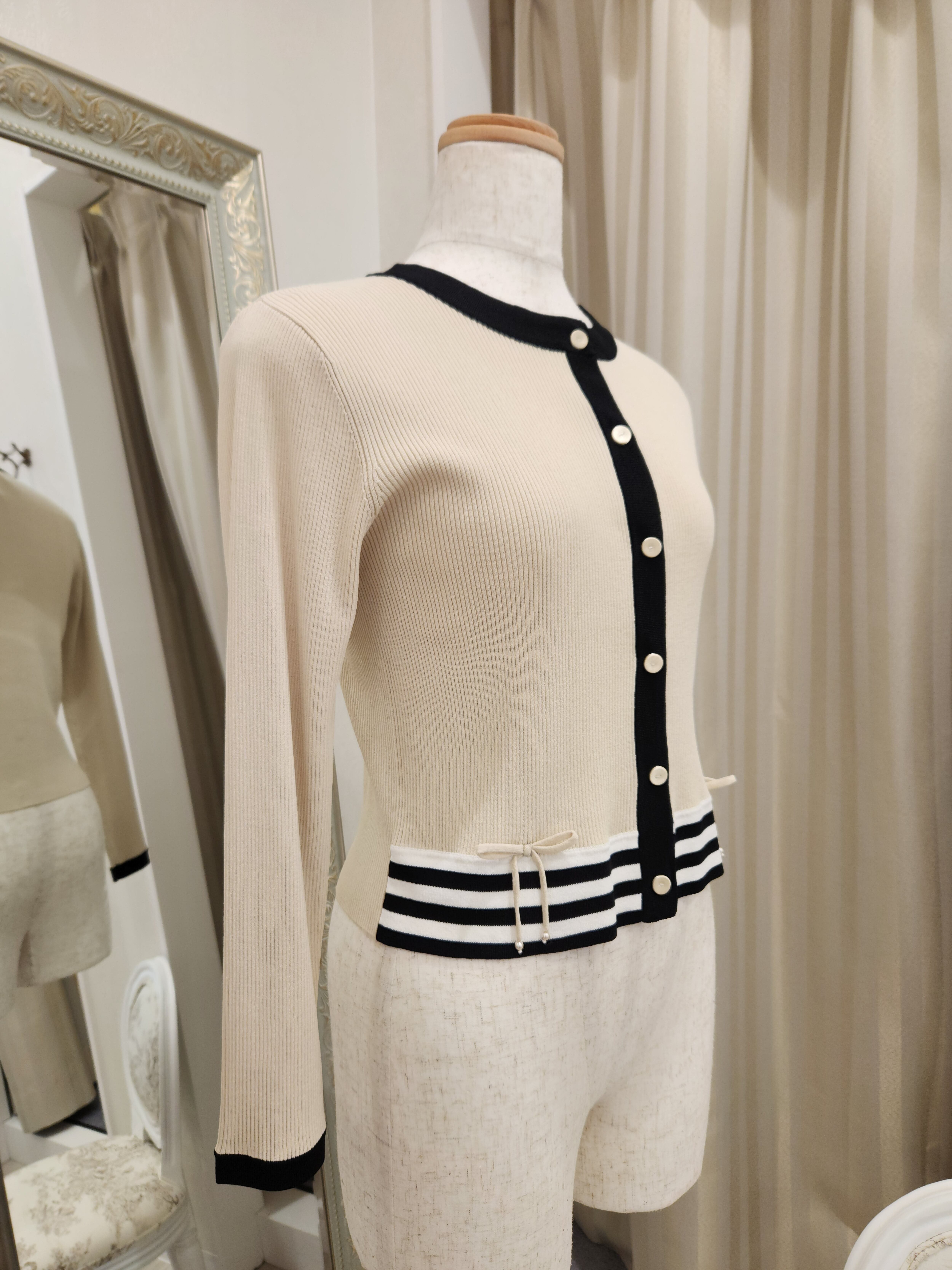 ベージュ×ブラックの上品な配色のカーディガン。ウエストのパール装飾と小さなリボンが、大人可愛いらしさを演出します!