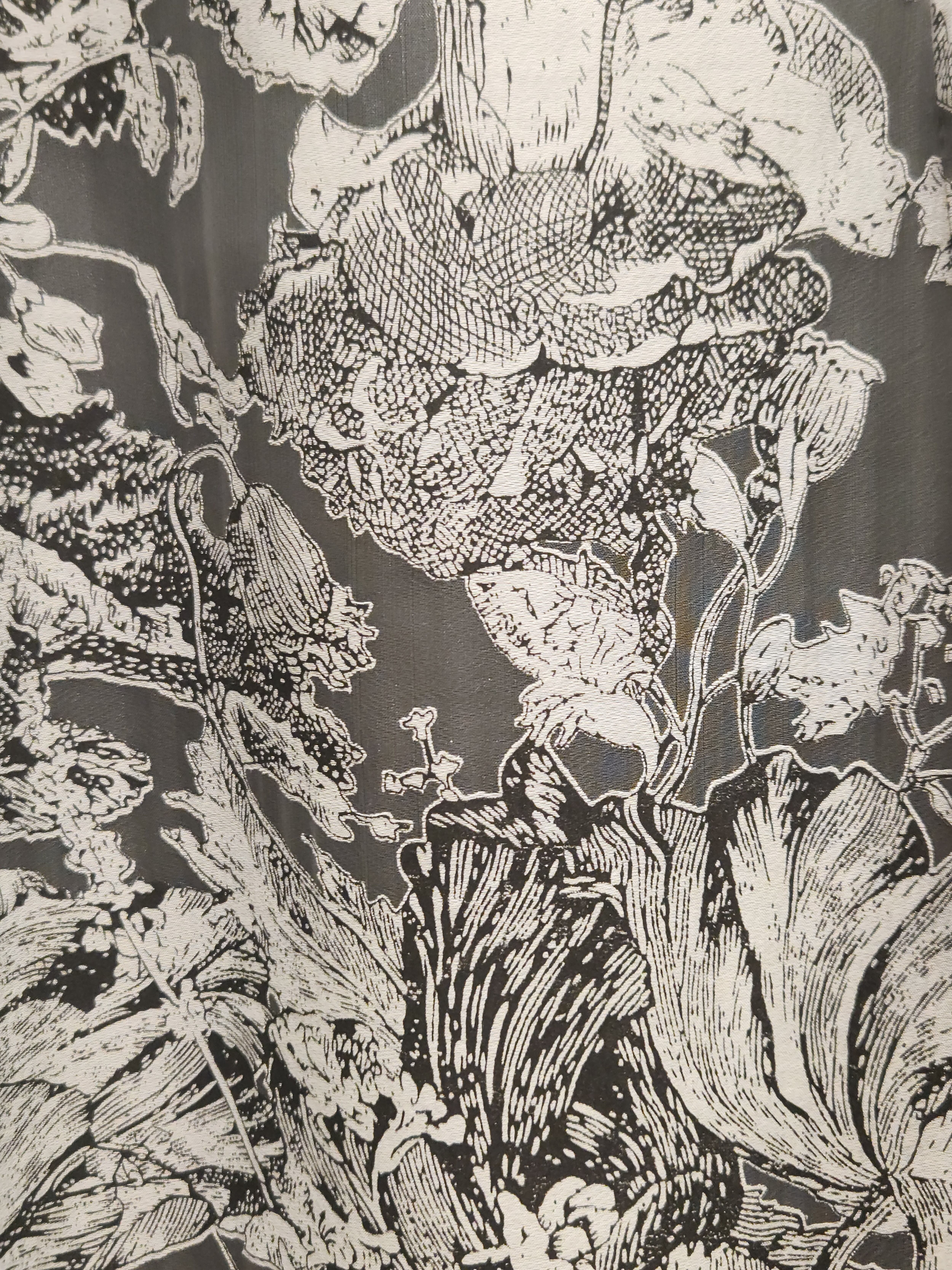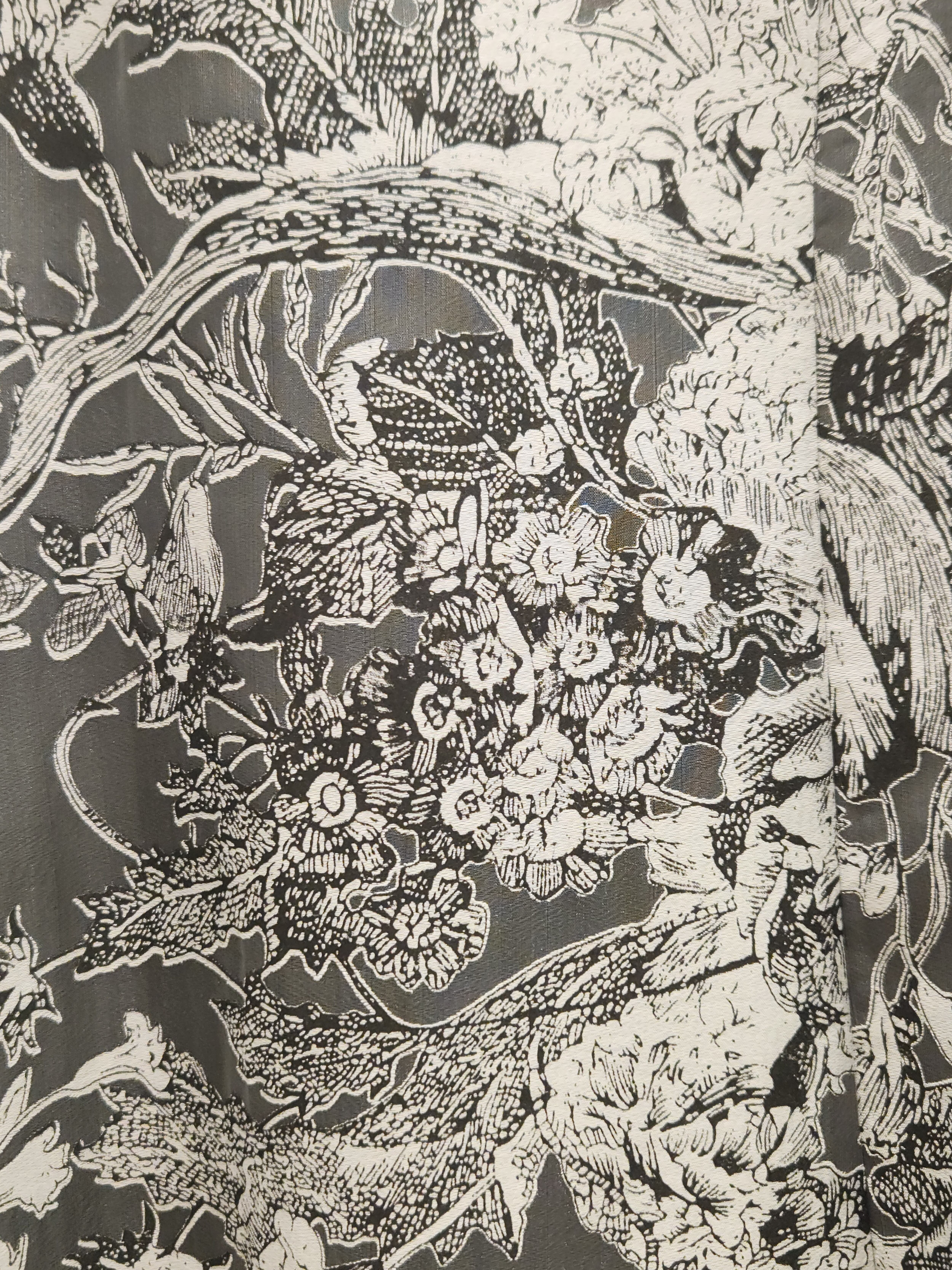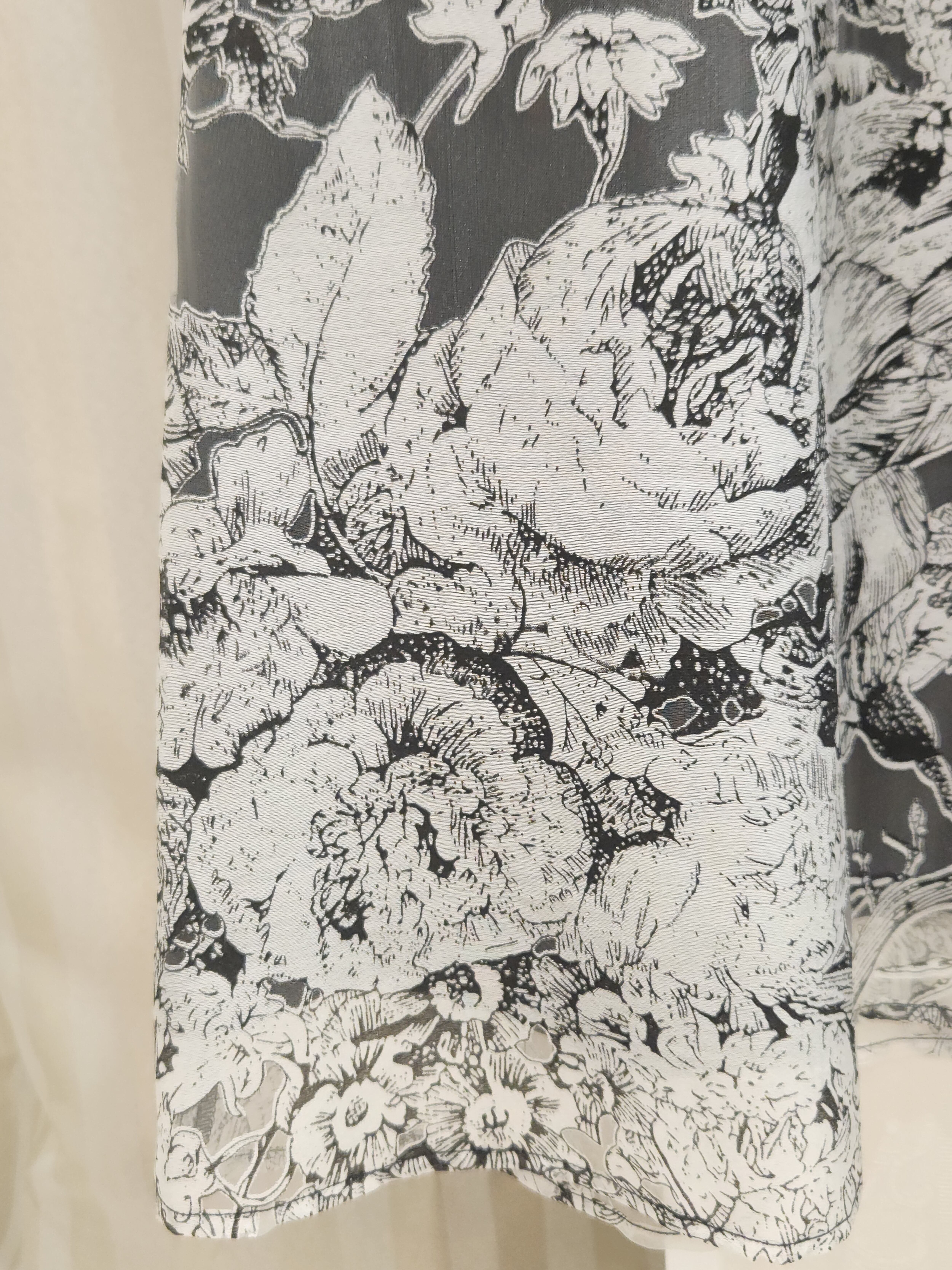 裏地はブラックで、透け感のあるオーガンジーと重なり、落ち着いた色合いに仕上がっています。