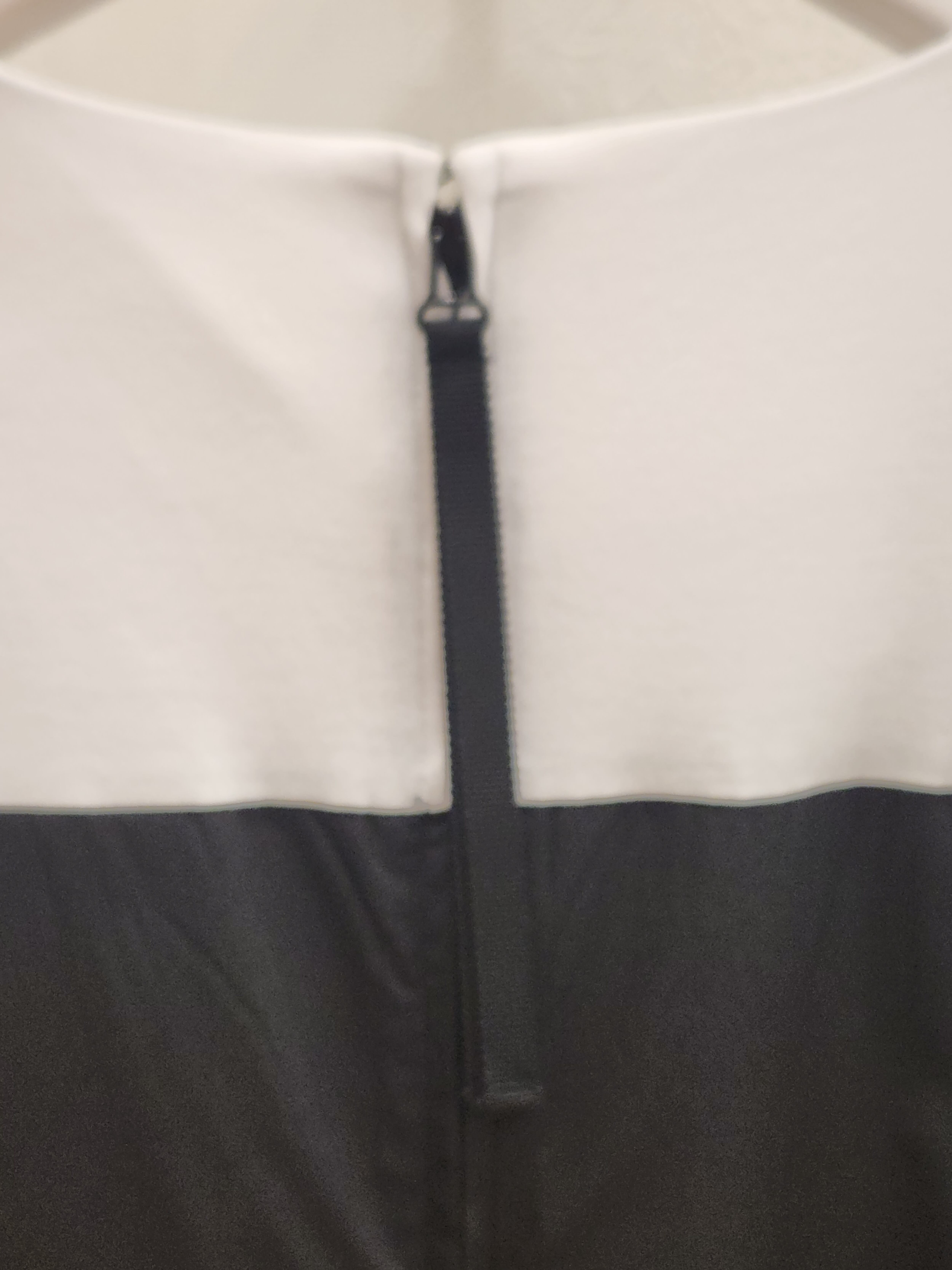 身ごろ丈夫のホワイト部分の生地はジャージ素材でストレッチ性があり、ブラック部分の脇にもストレッチ生地が使用され、着心地抜群のワンピース。