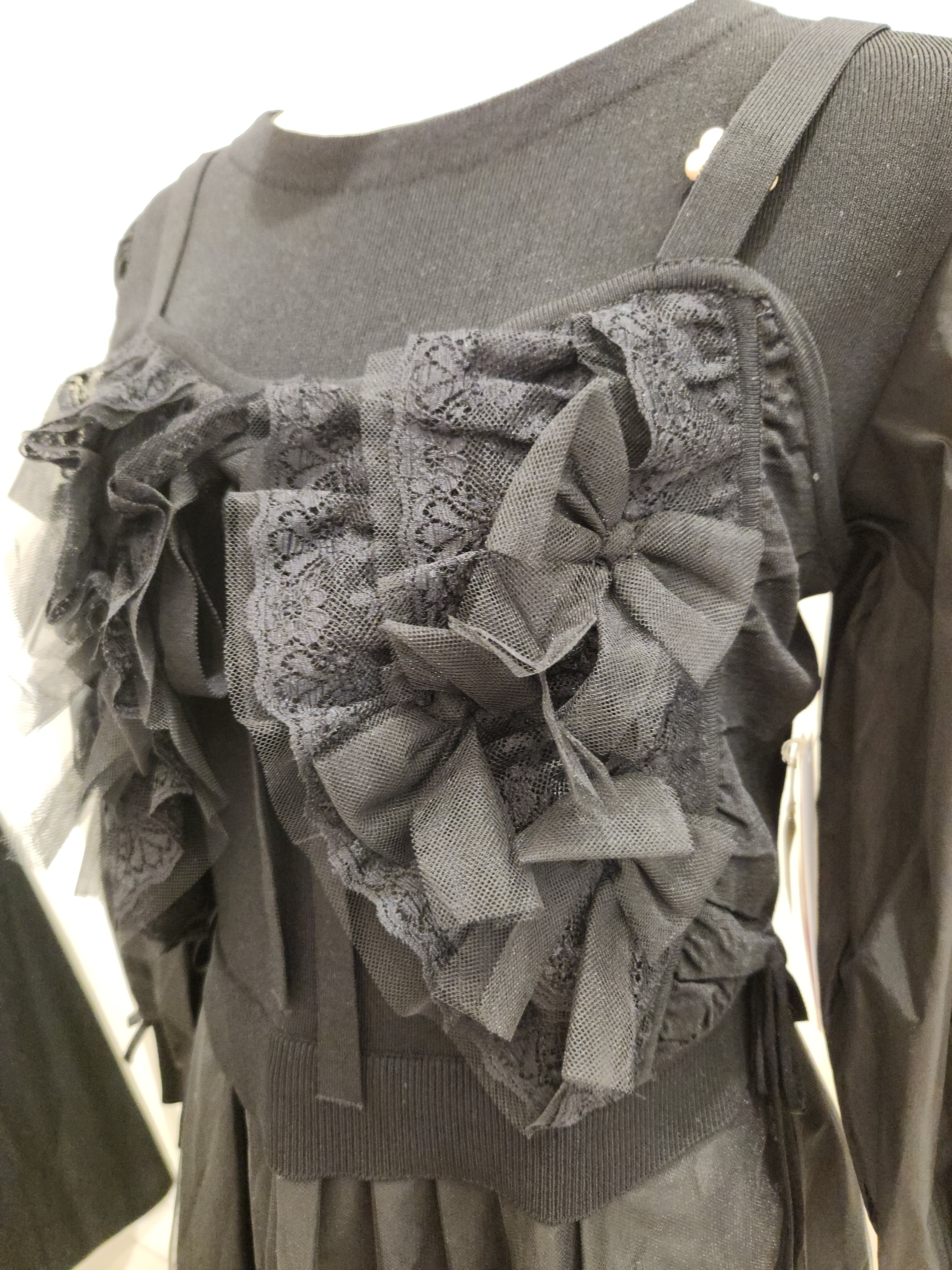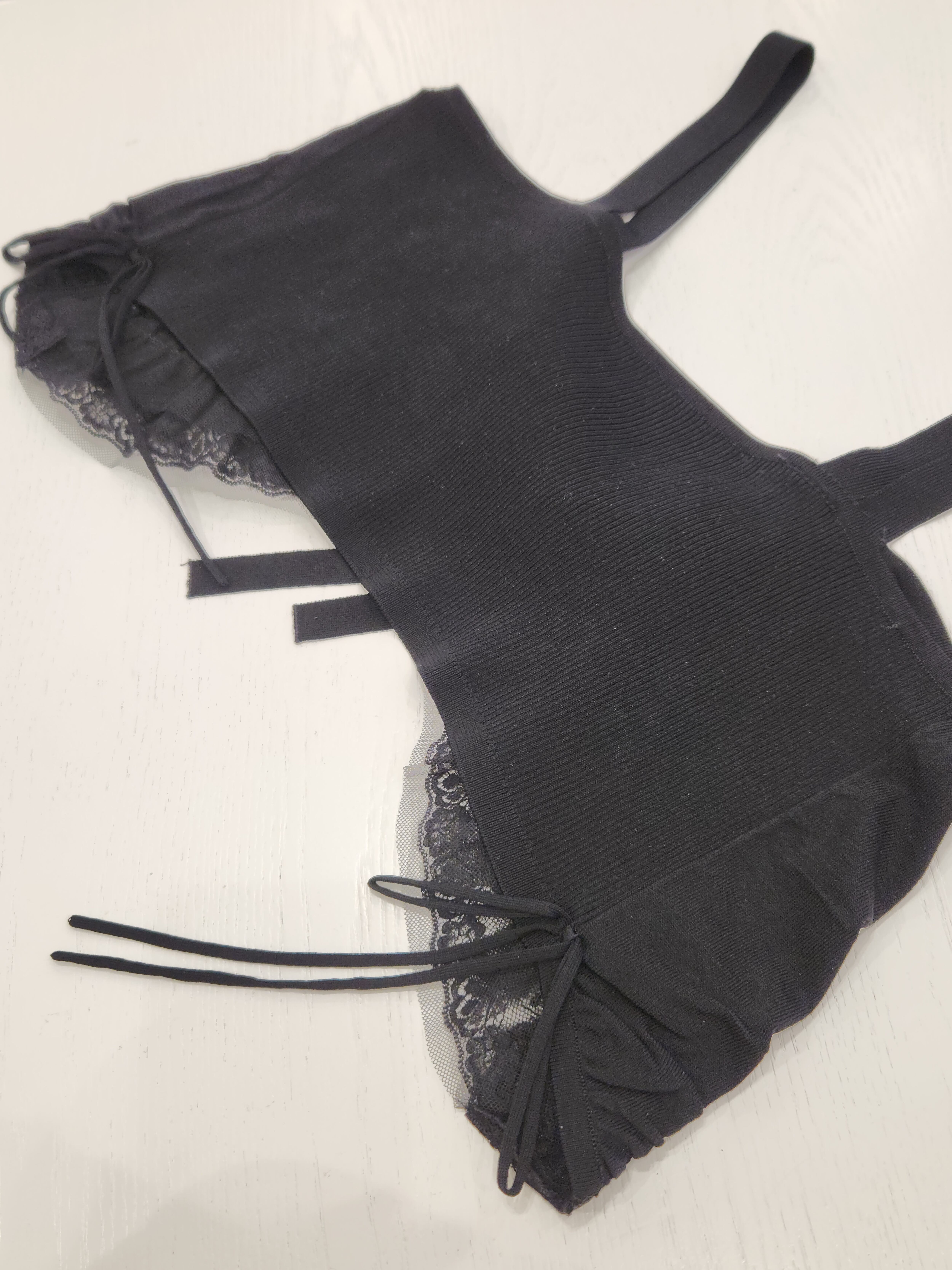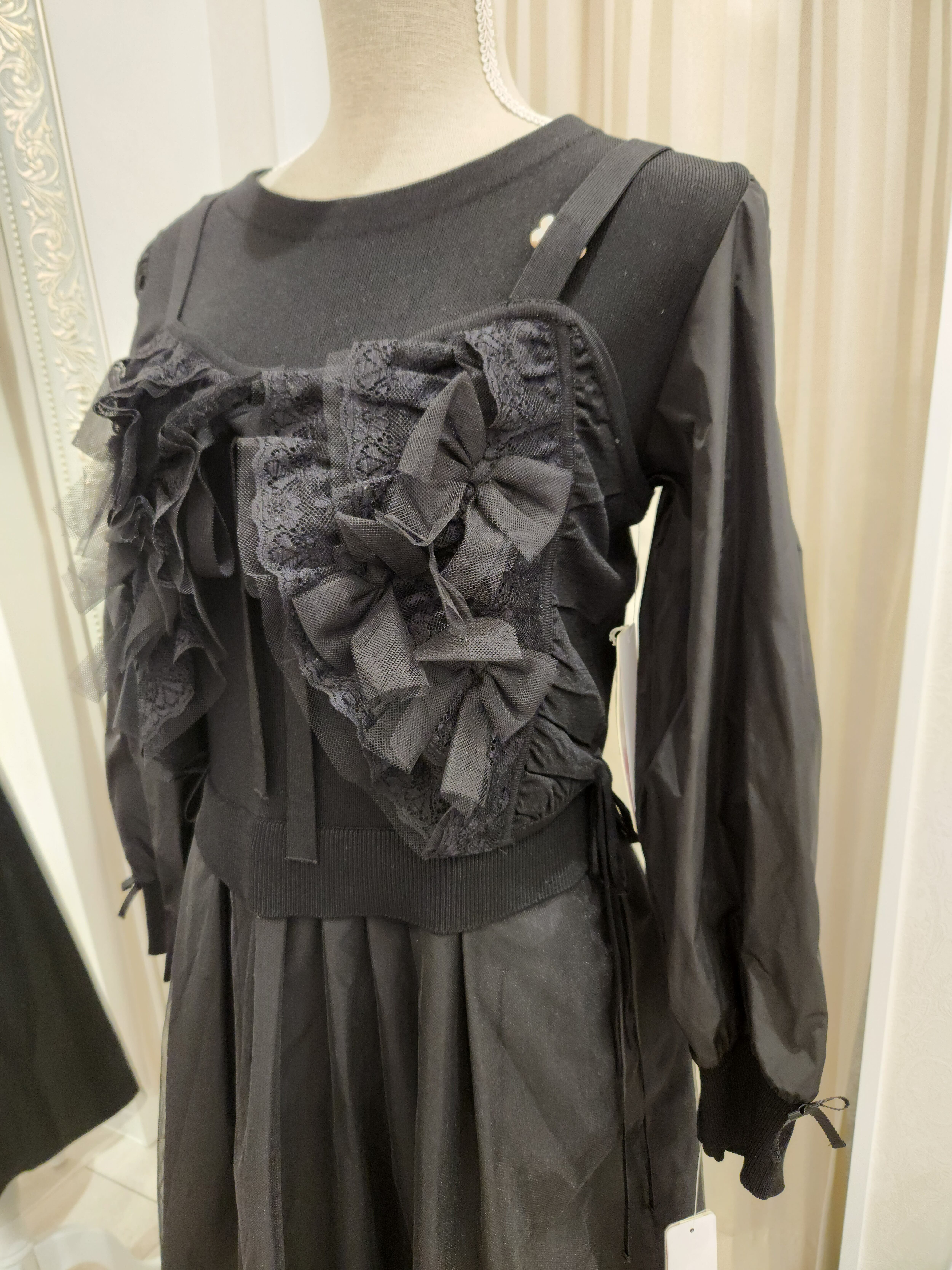 柔らかなソフトチュールと繊細なレースが絶妙に融合した、可愛らしいデザインの前開きニットキャミソールです。胸元には華やかにデザインされたリボンがあしらわれており、シンプルながらも女性らしさを引き立てます。