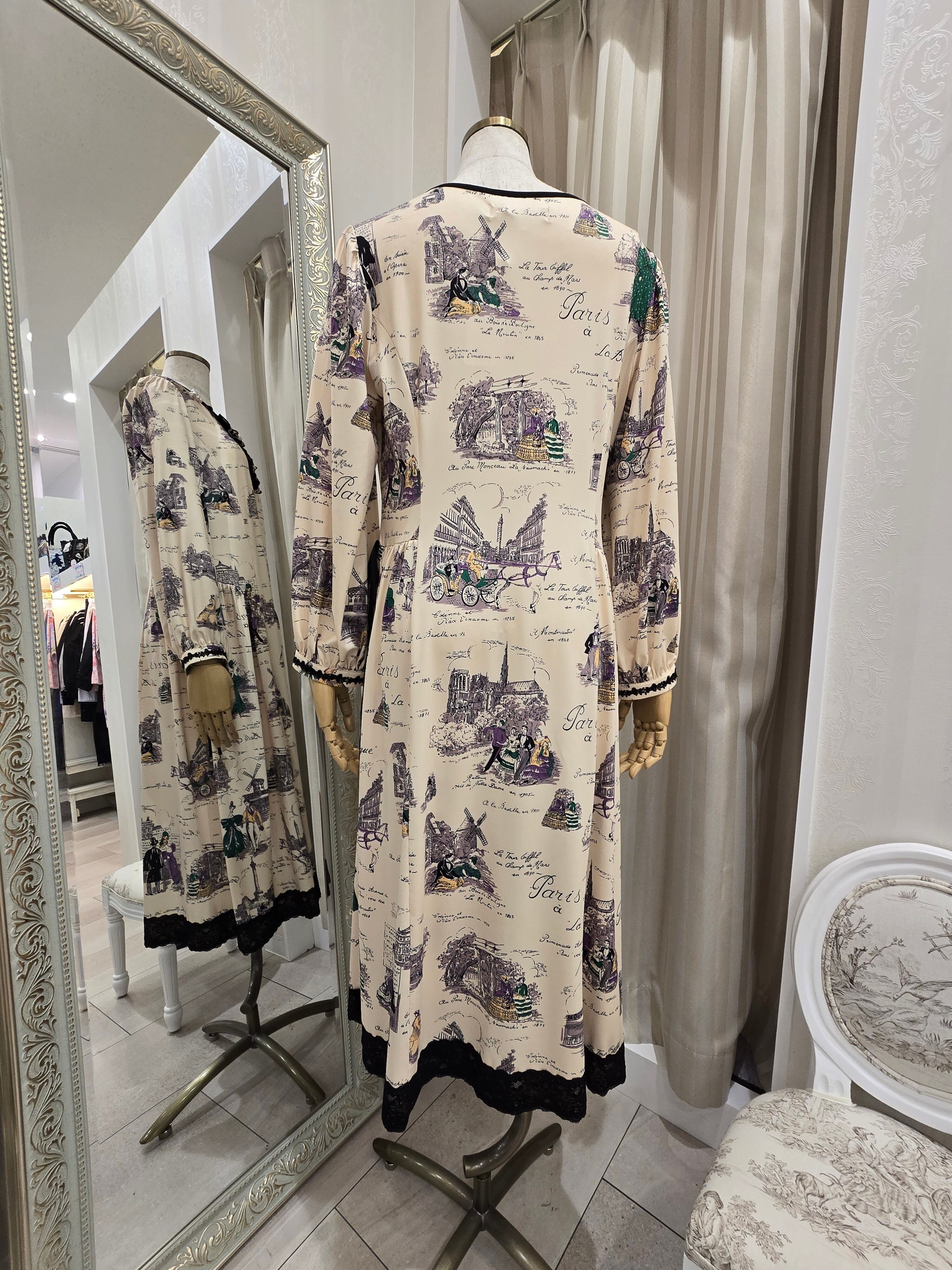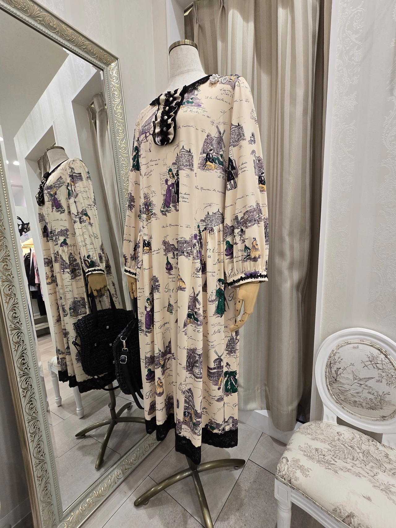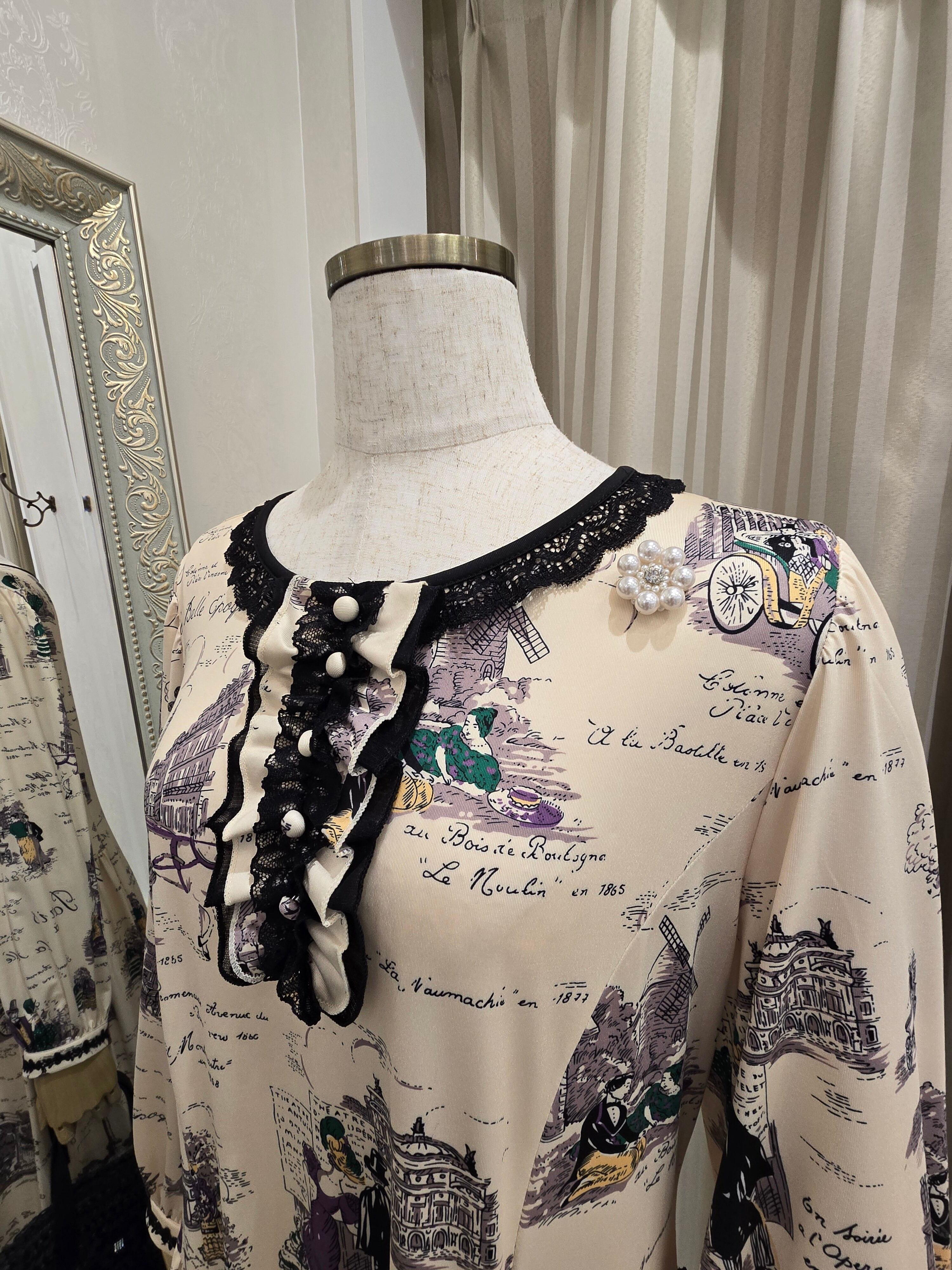 【Super Beauty / スーパービューティー★2025秋冬新作】胸元フリルとレース使いが優雅で大人可愛い着心地抜群パリ柄生地の長袖ワンピース