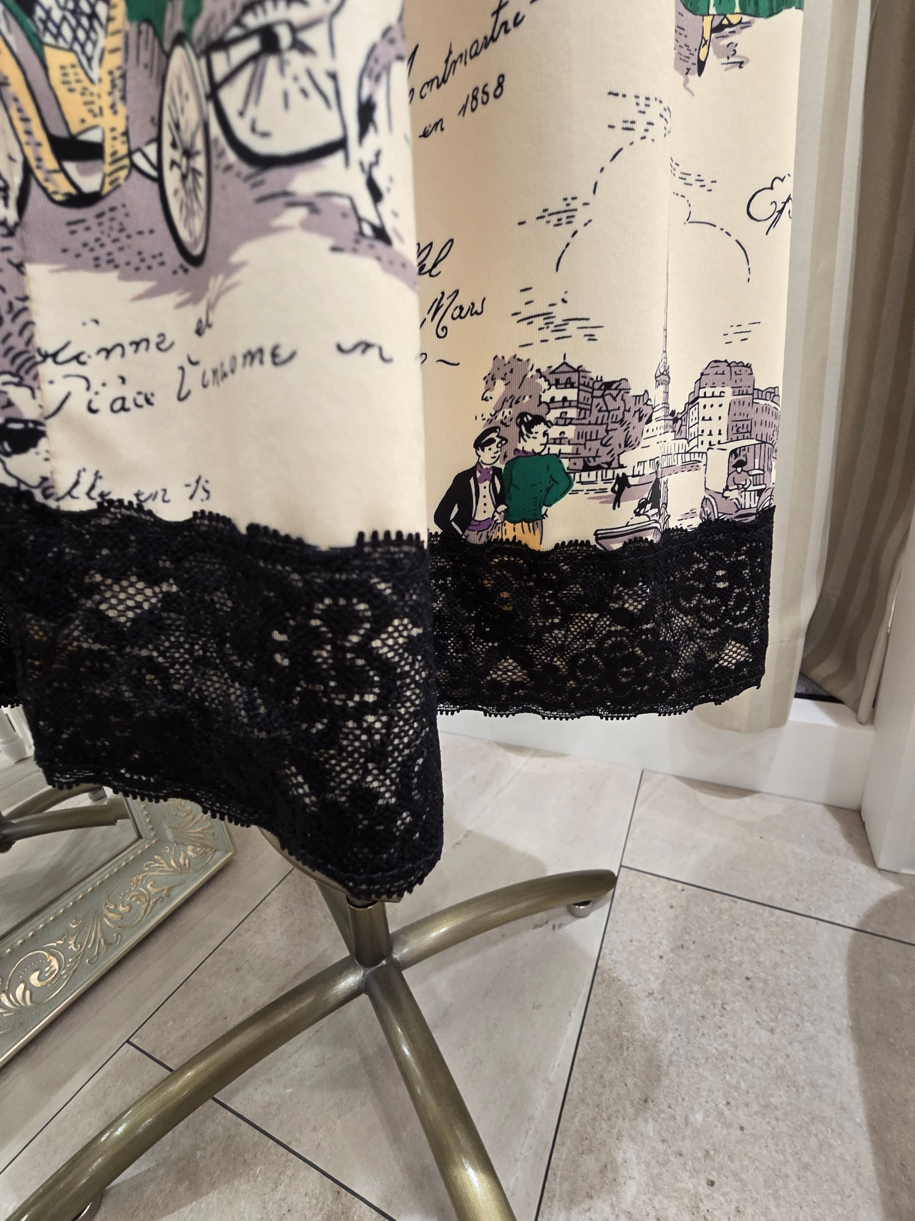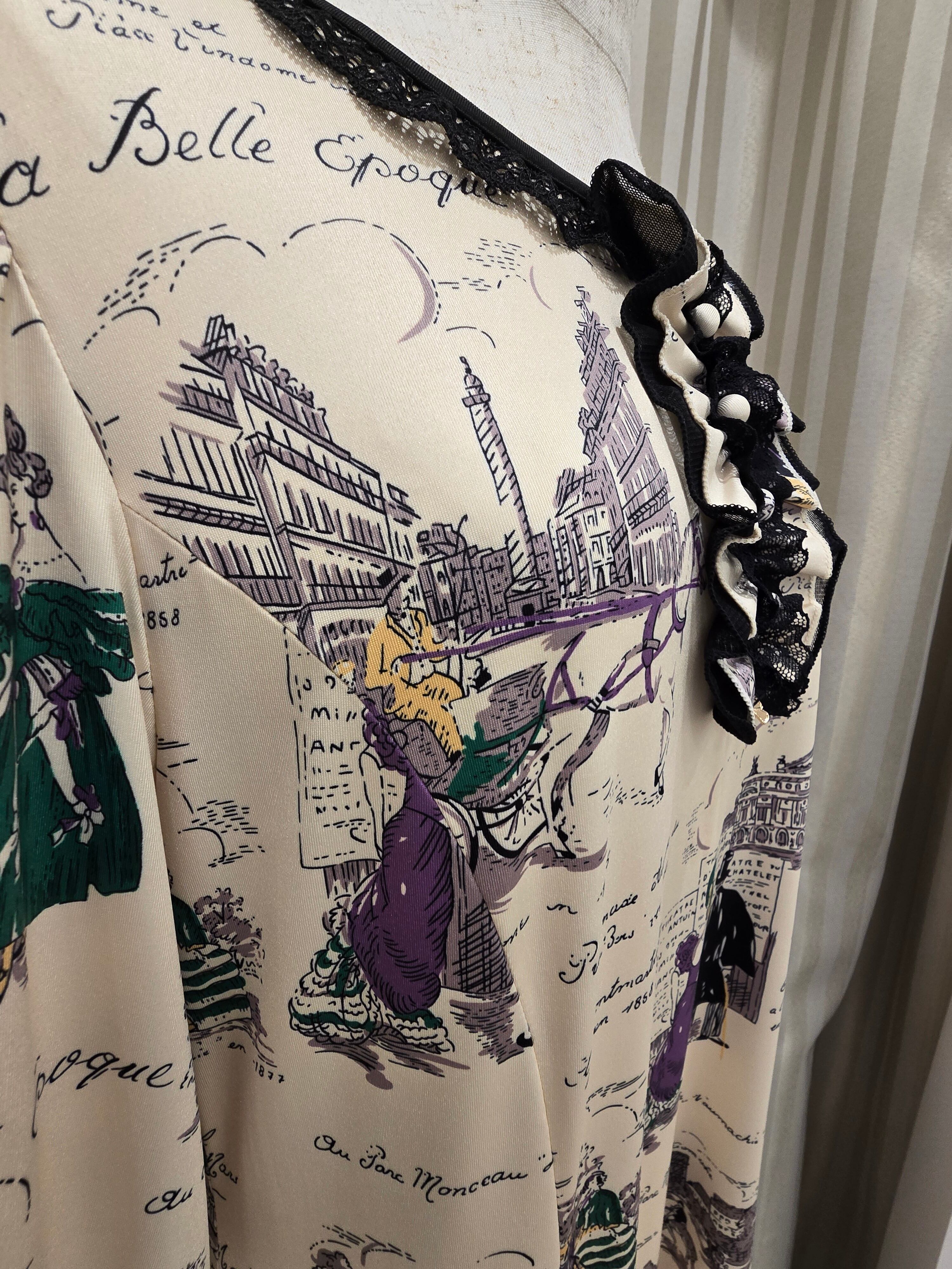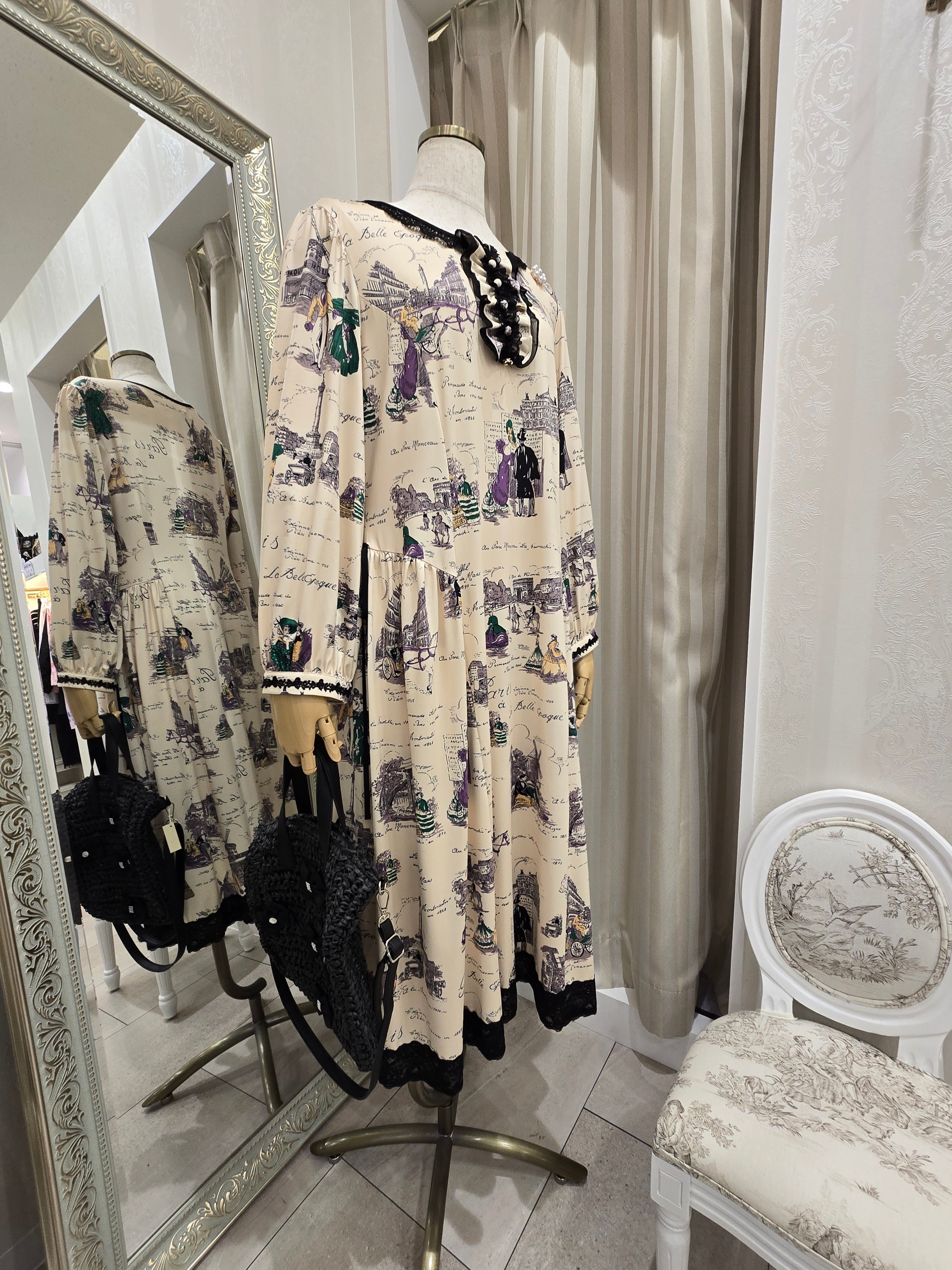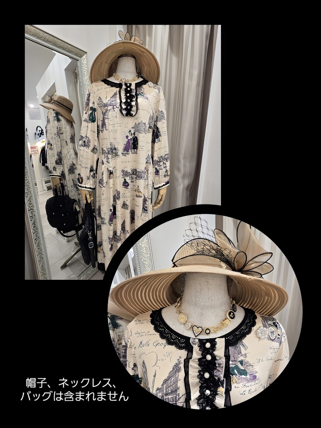 【Super Beauty / スーパービューティー★2025秋冬新作】胸元フリルとレース使いが優雅で大人可愛い着心地抜群パリ柄生地の長袖ワンピース