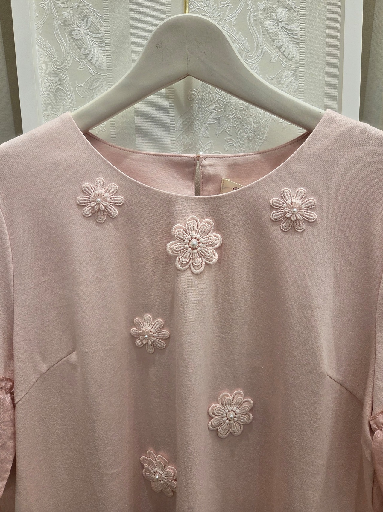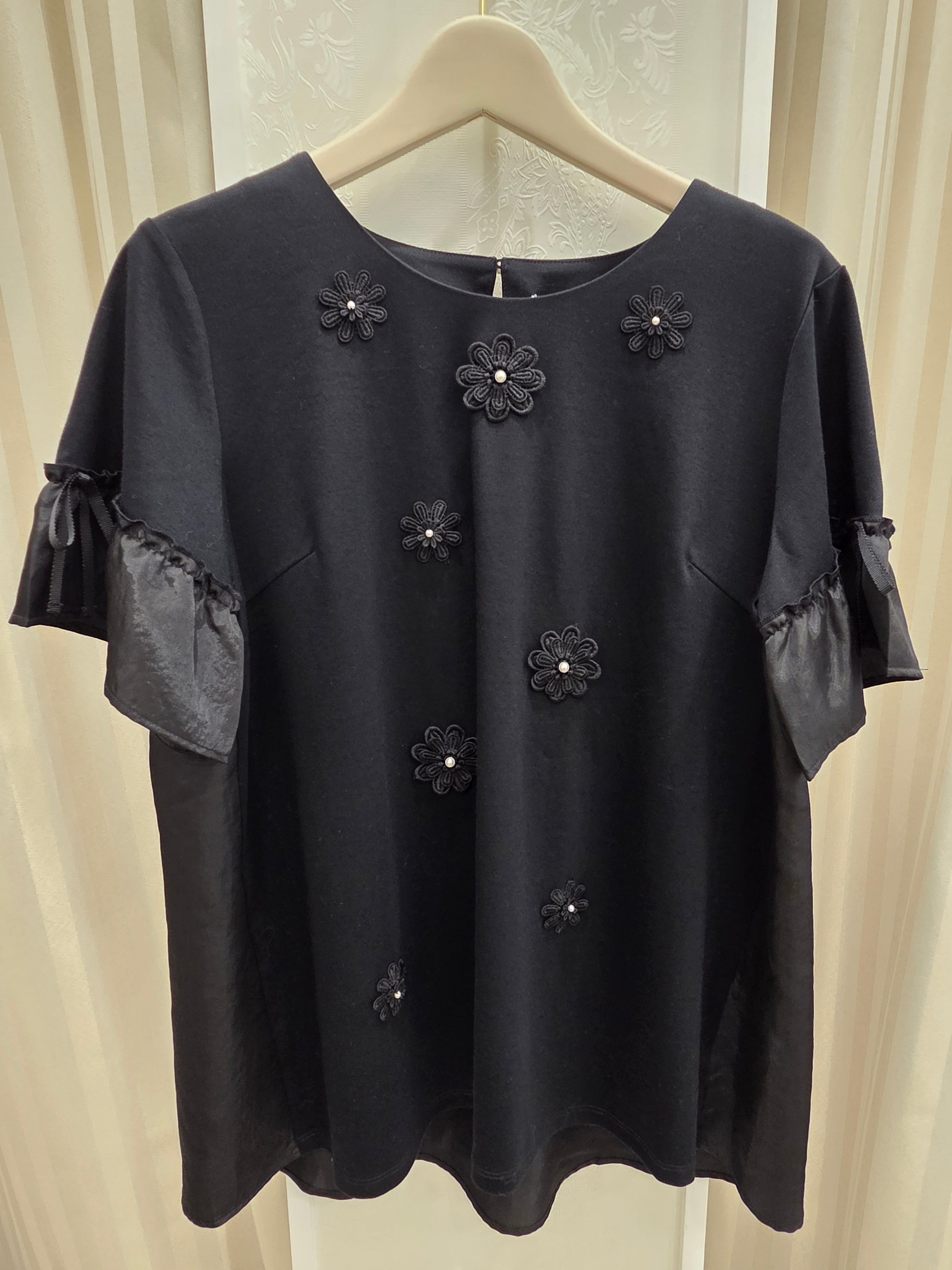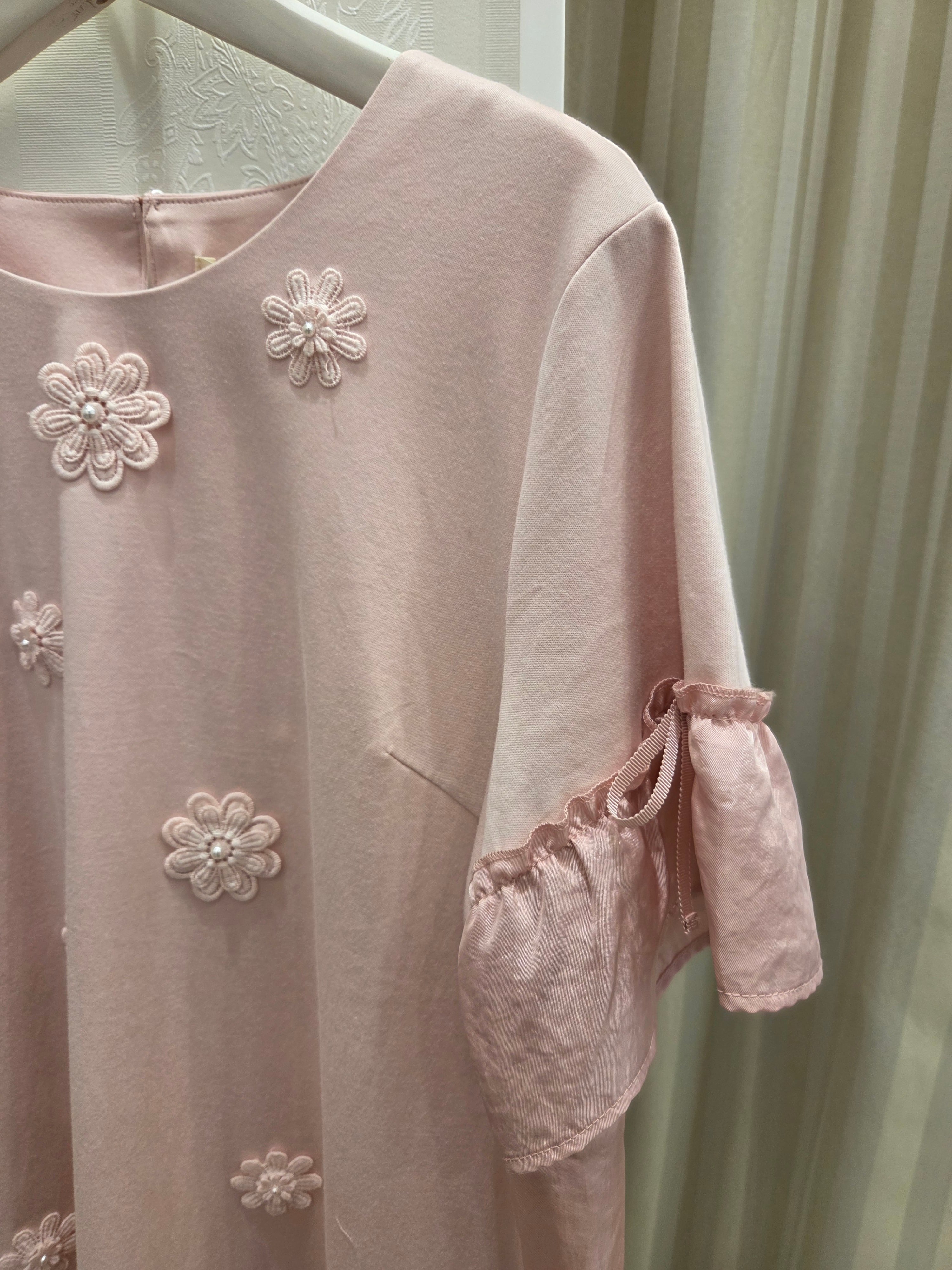 袖の切り替えフリルとリボンと、後ろもパールとリボンが上品な印象を与えます。