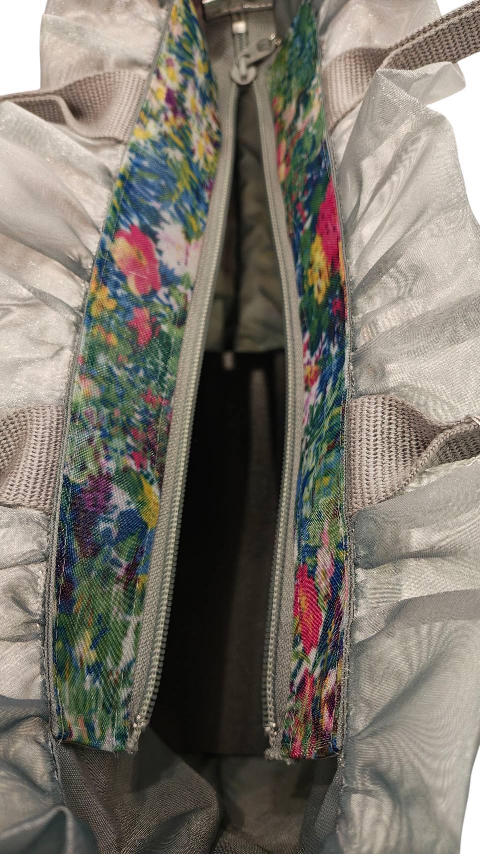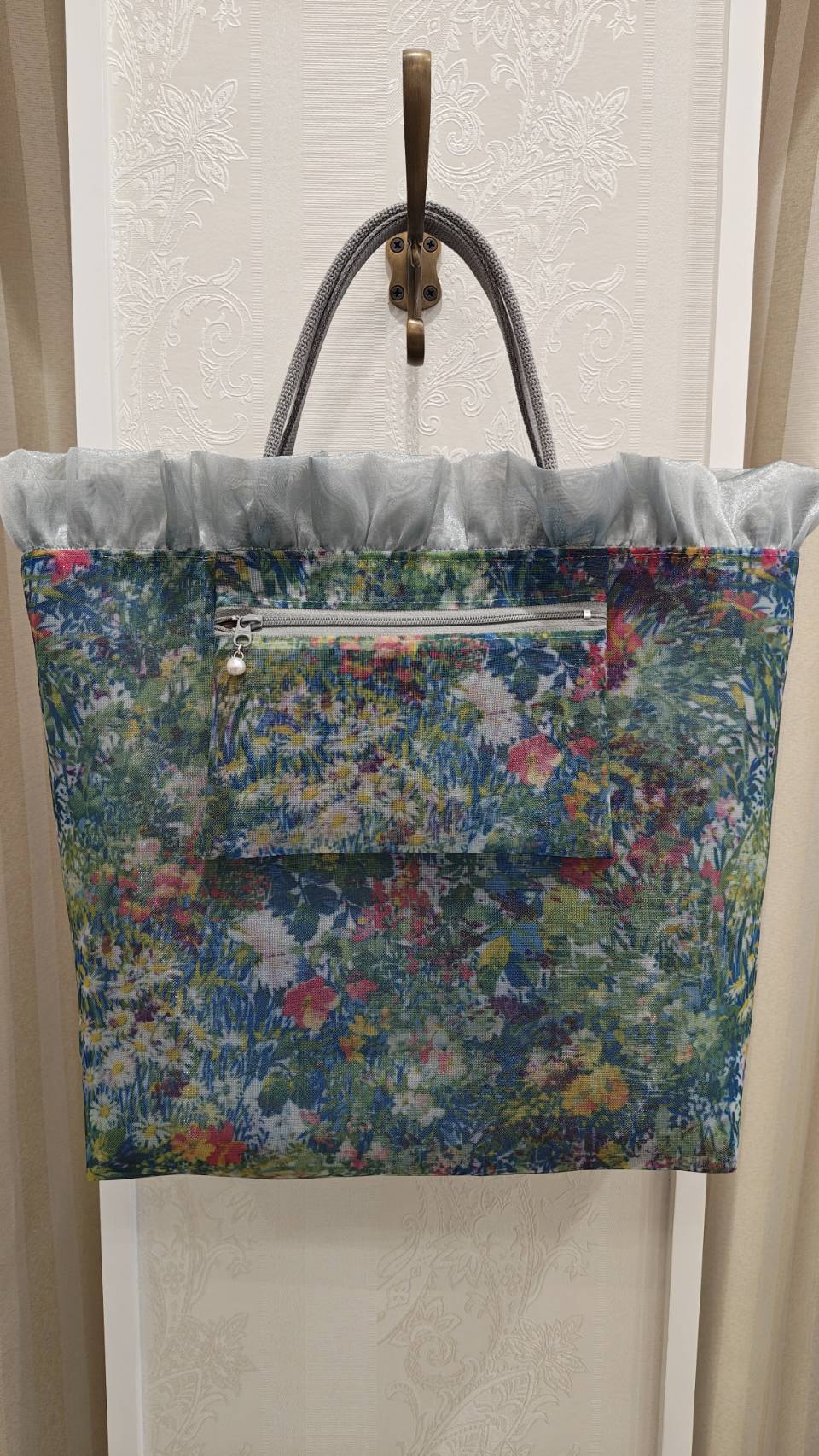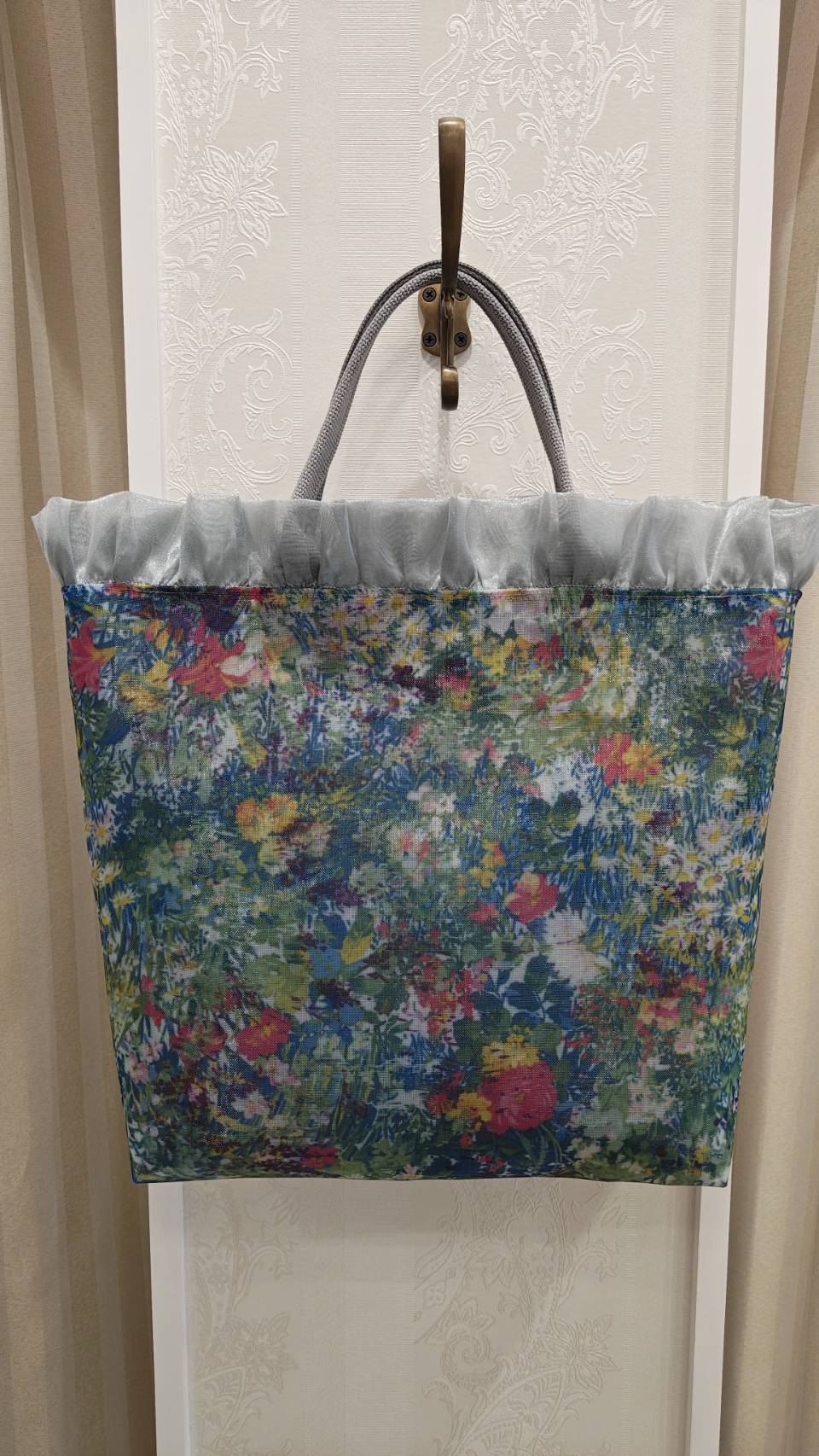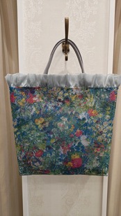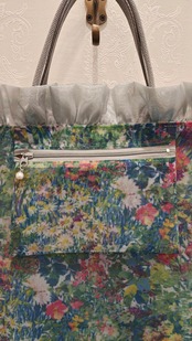 メッシュ素材なので、とても軽いトートバッグです。開口部の周りにフリルがあしらわれ、とてもエレガントなデザイン。