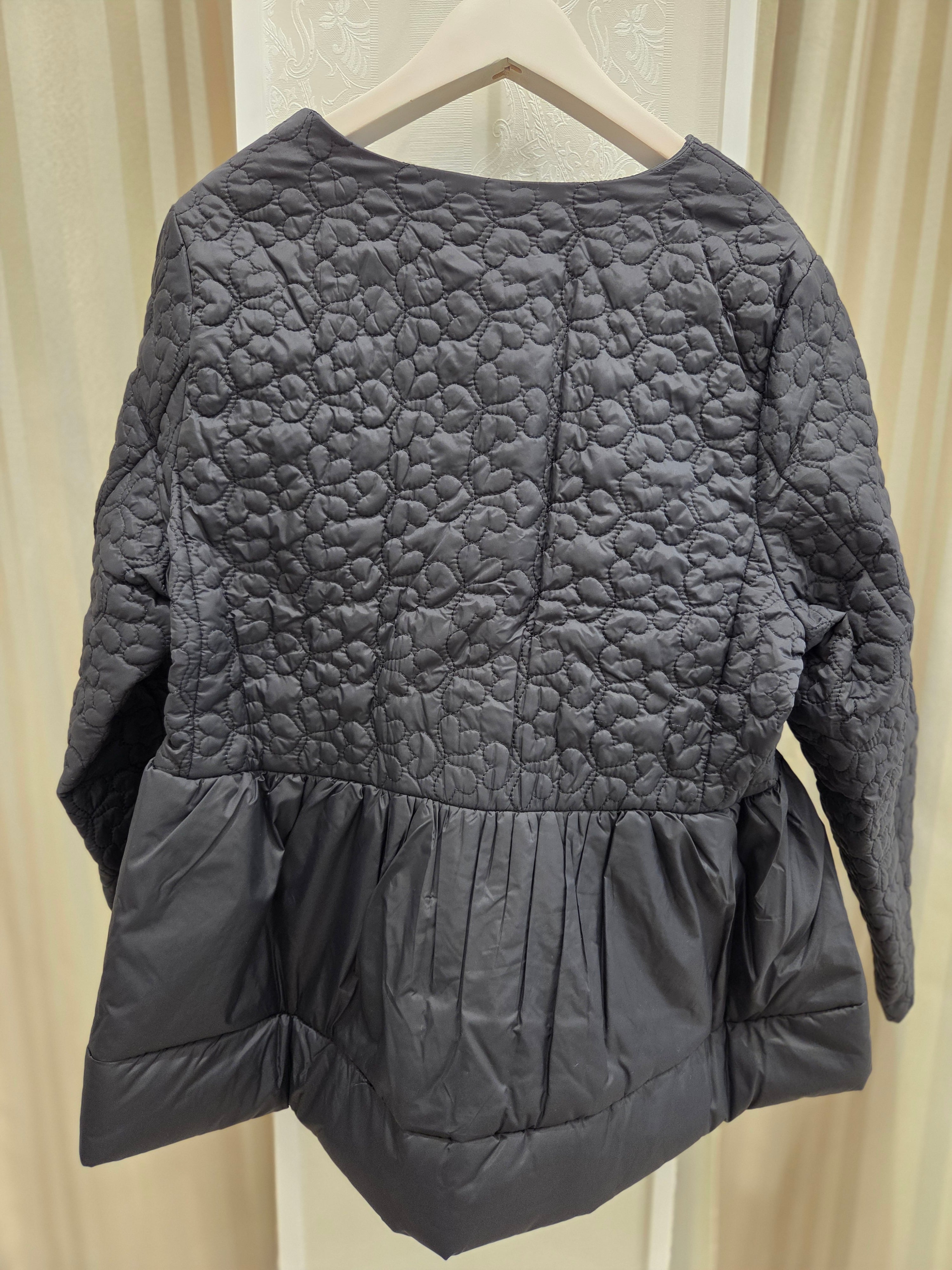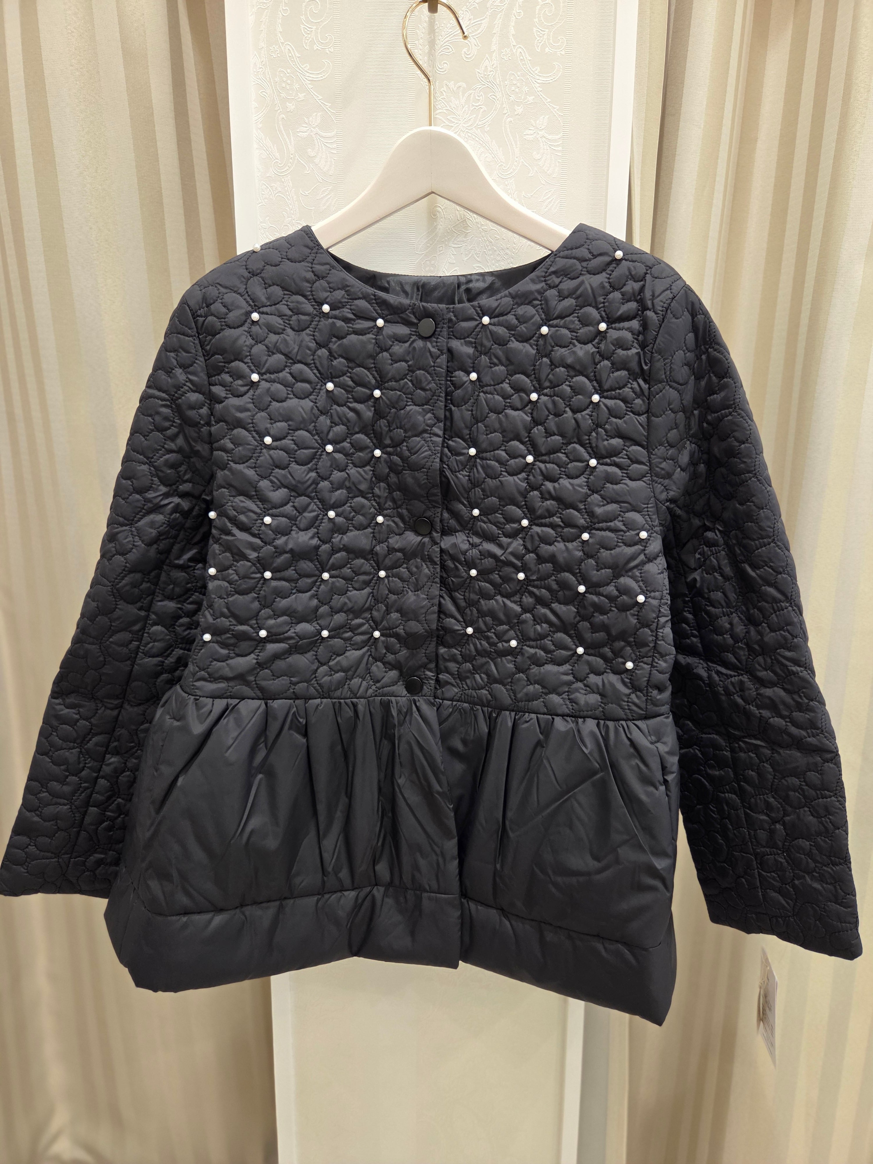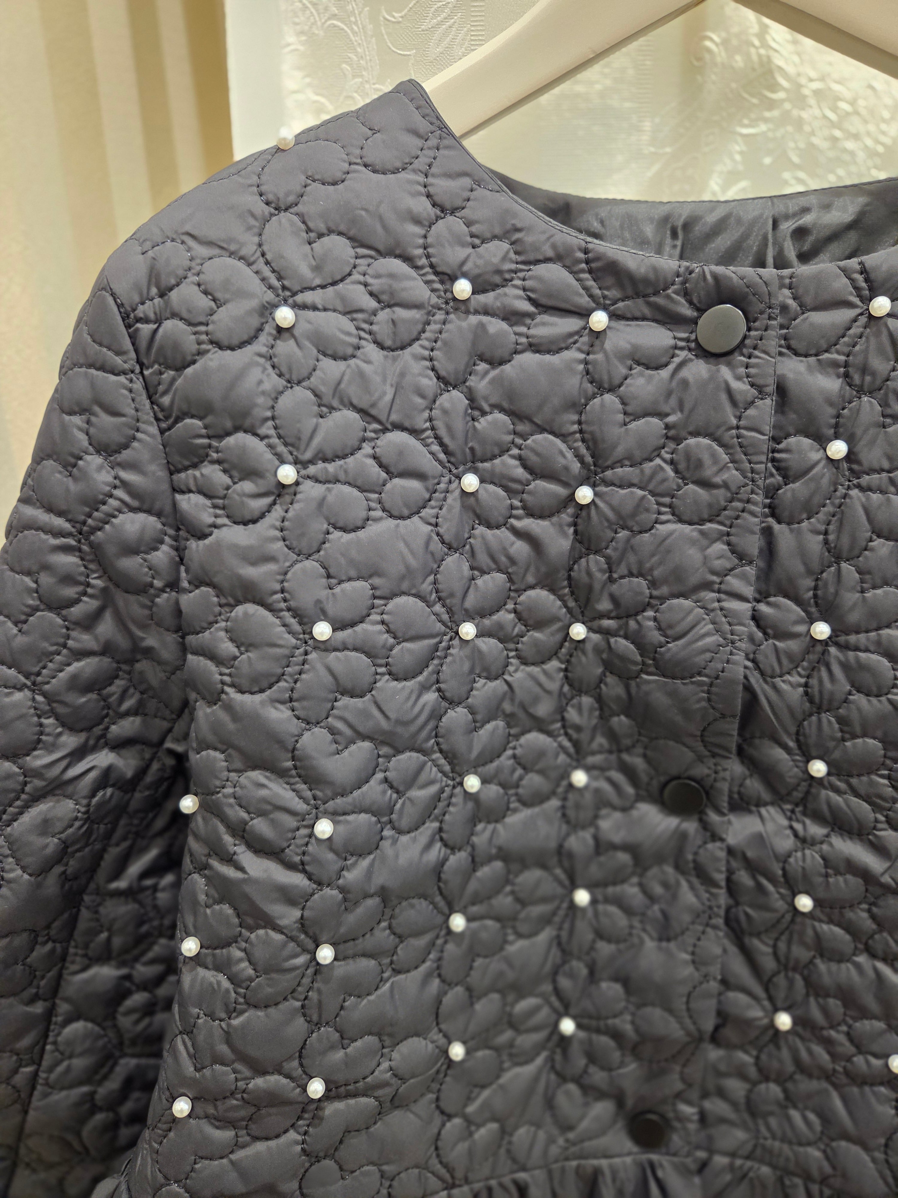 ハートのキルティングにパールのデコレーション 腰周り切替ふんわり薄手のジャケット(ブラック)