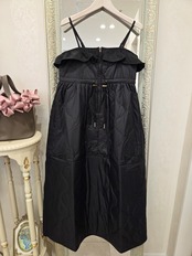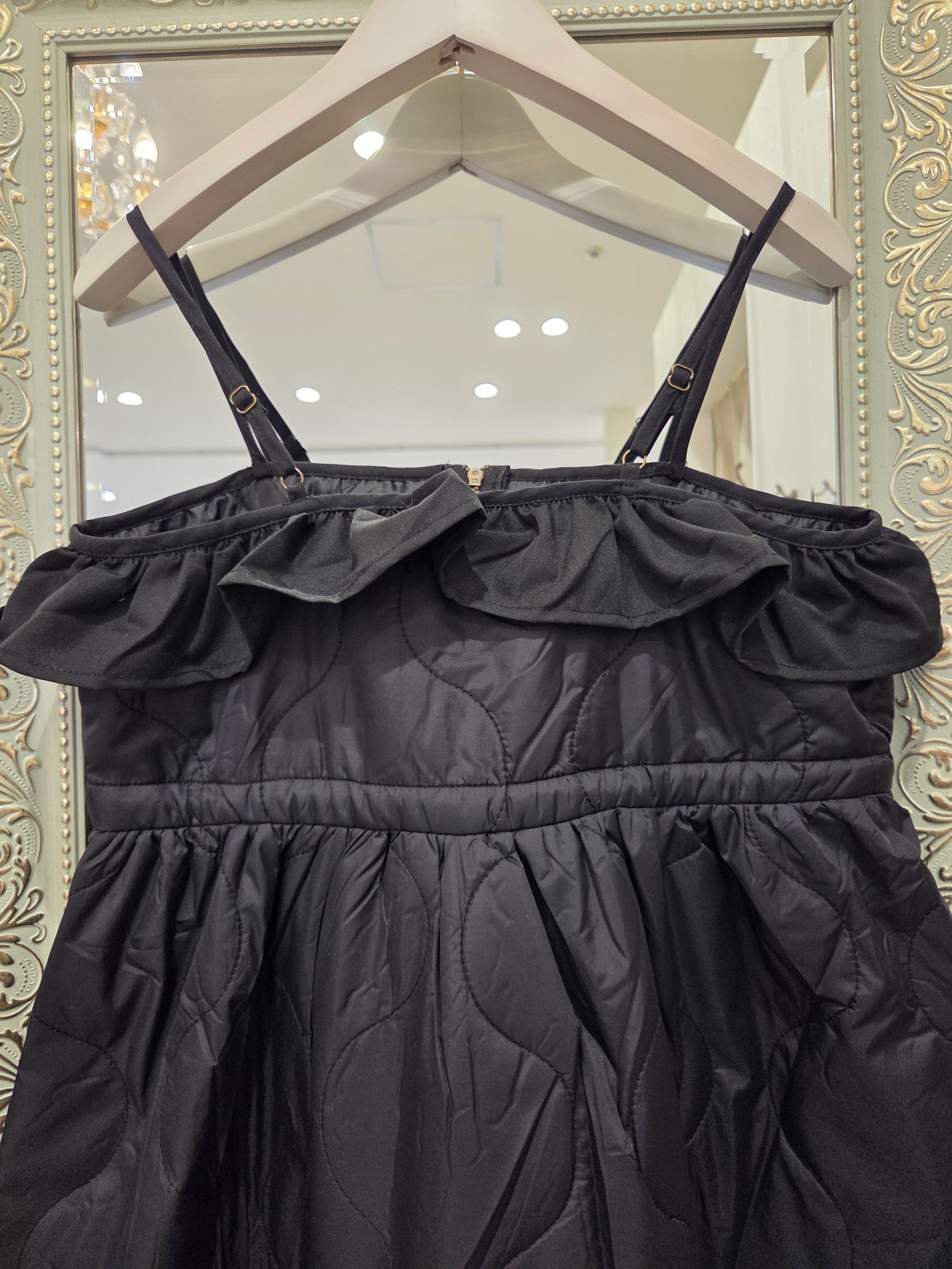 胸元フリルのキルティング キャミソール膝下ワンピース ブラック