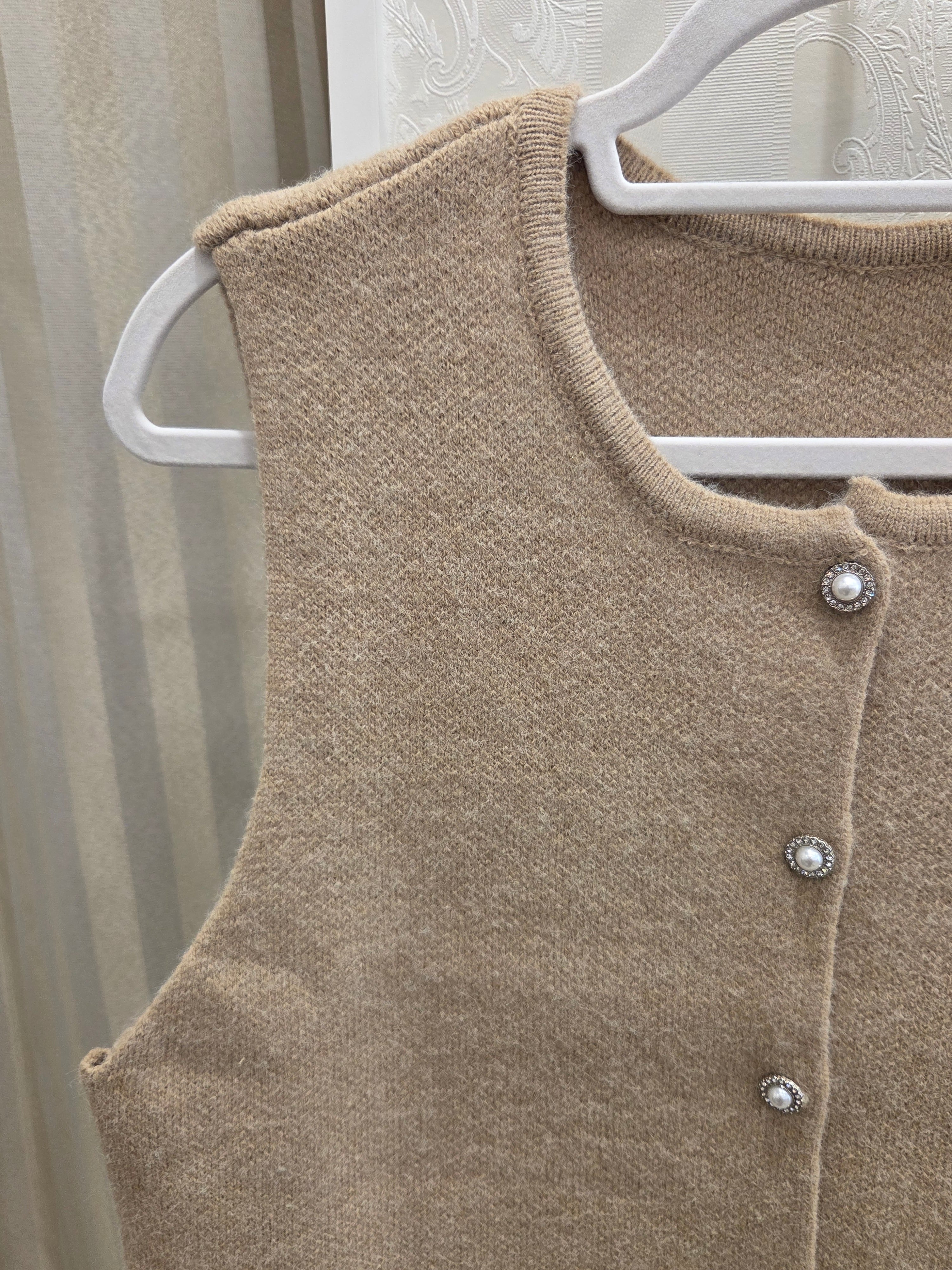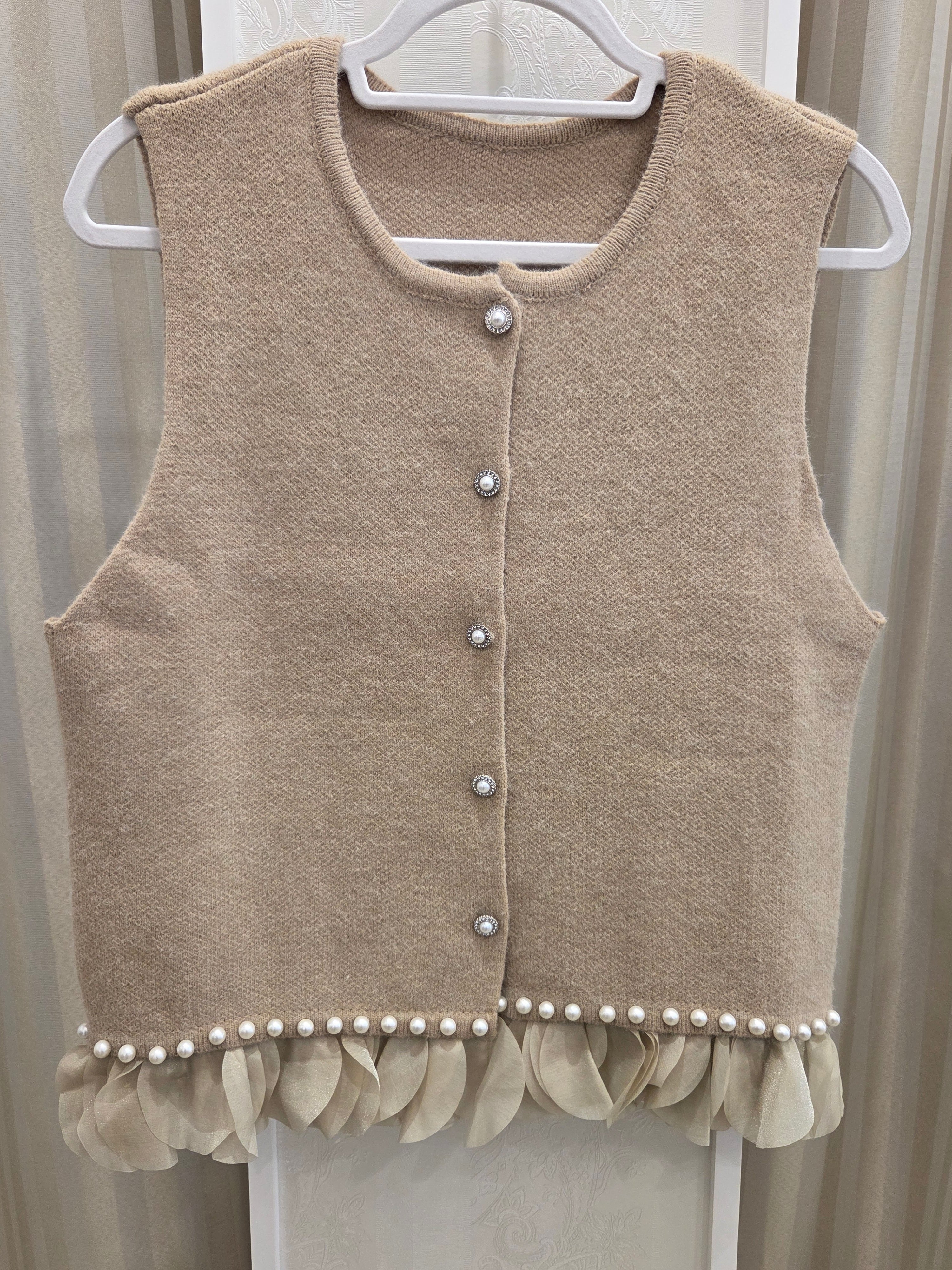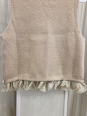 裾フリル パール キラキラボタン ニットベスト ベージュ