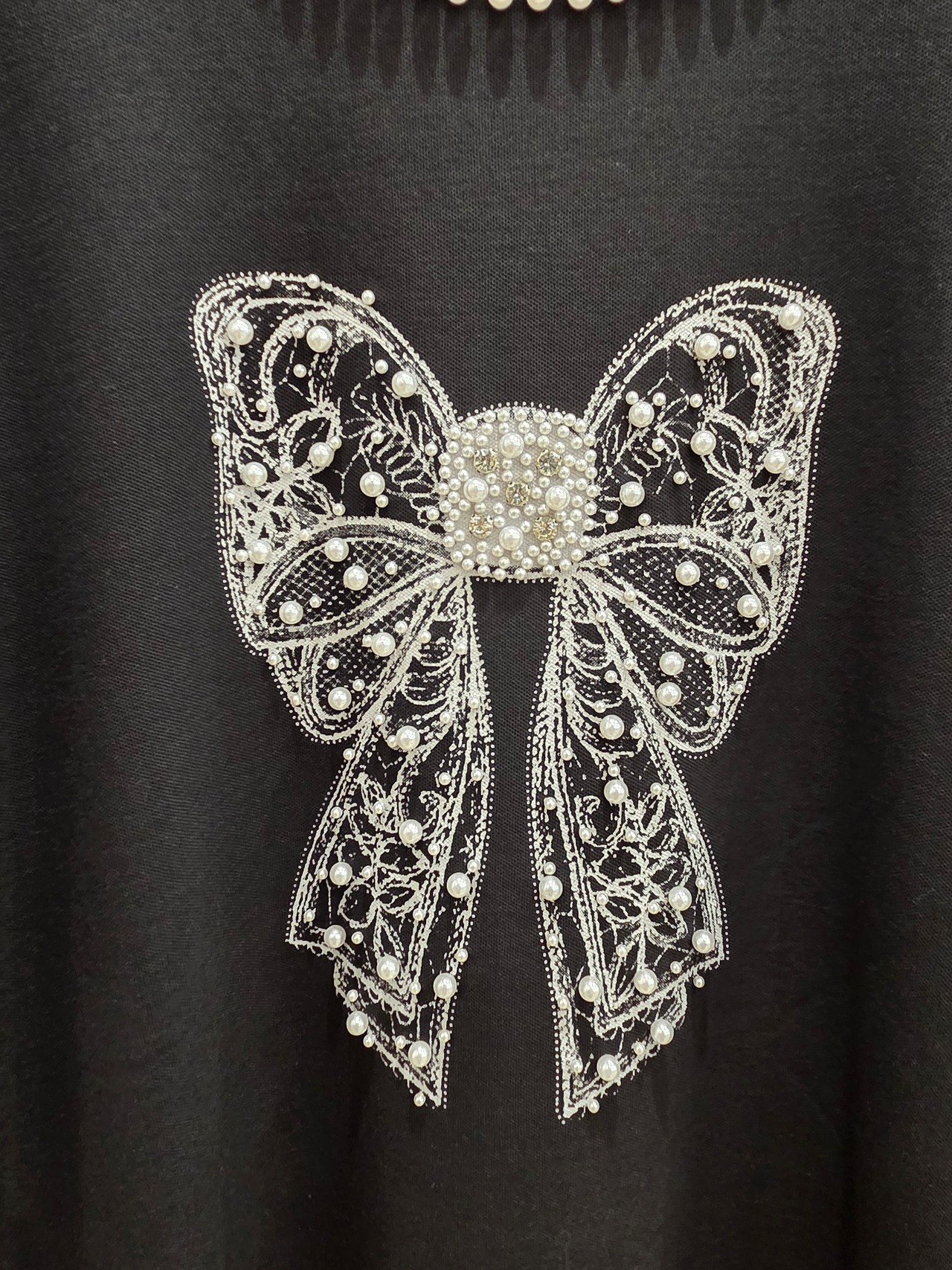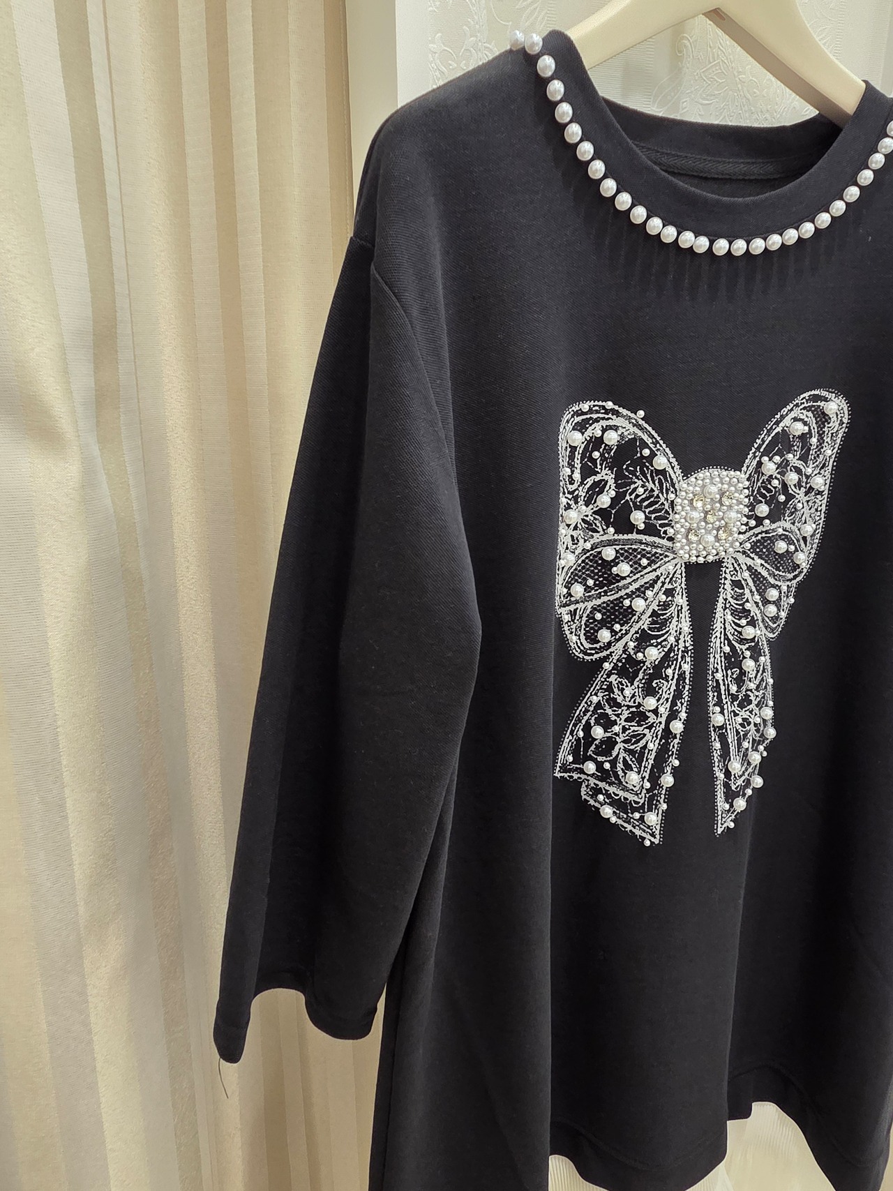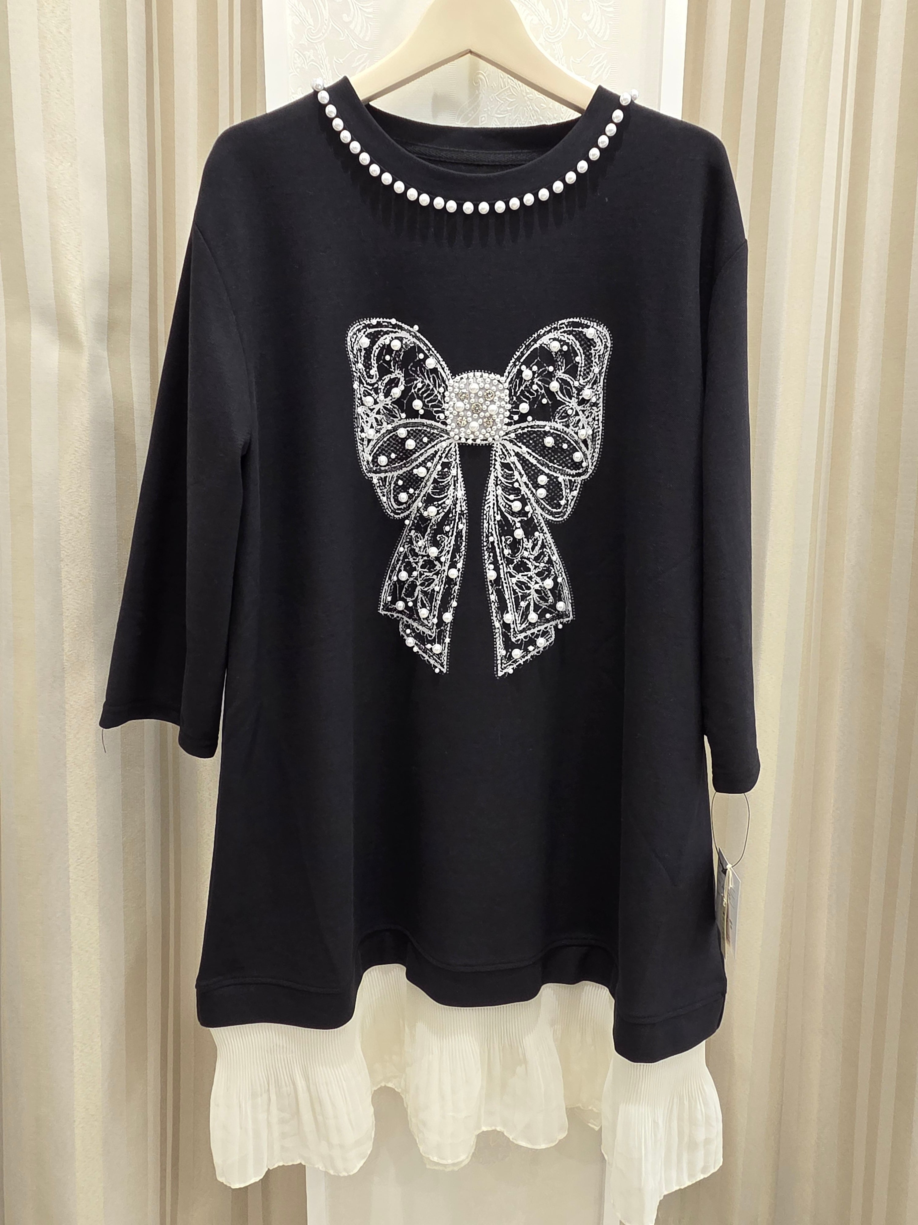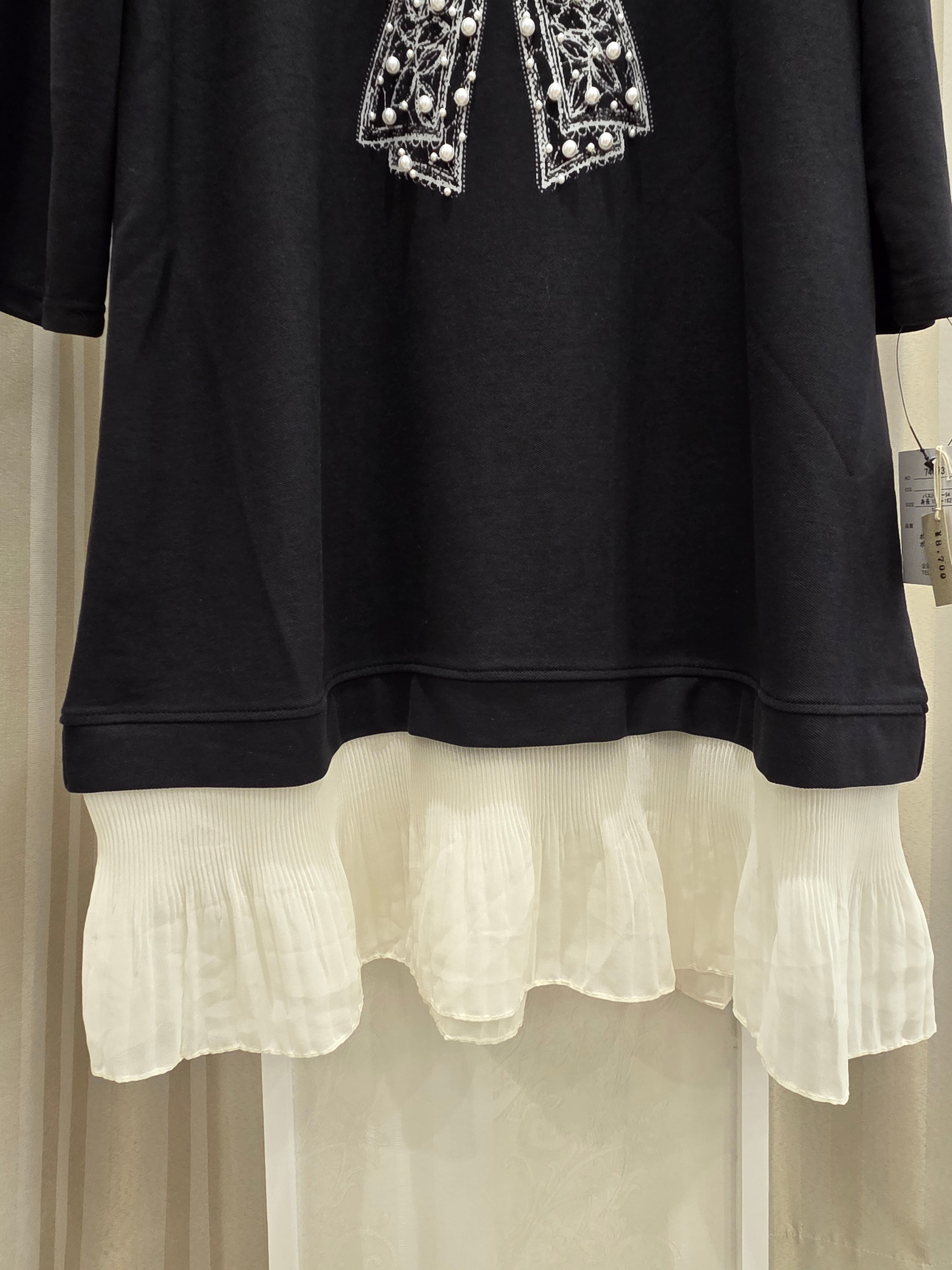 リボンがポイントのパールビジューデコレーション 裾切替ふんわりシフォン チュニック 七分袖(ブラック×ホワイト)