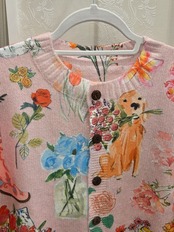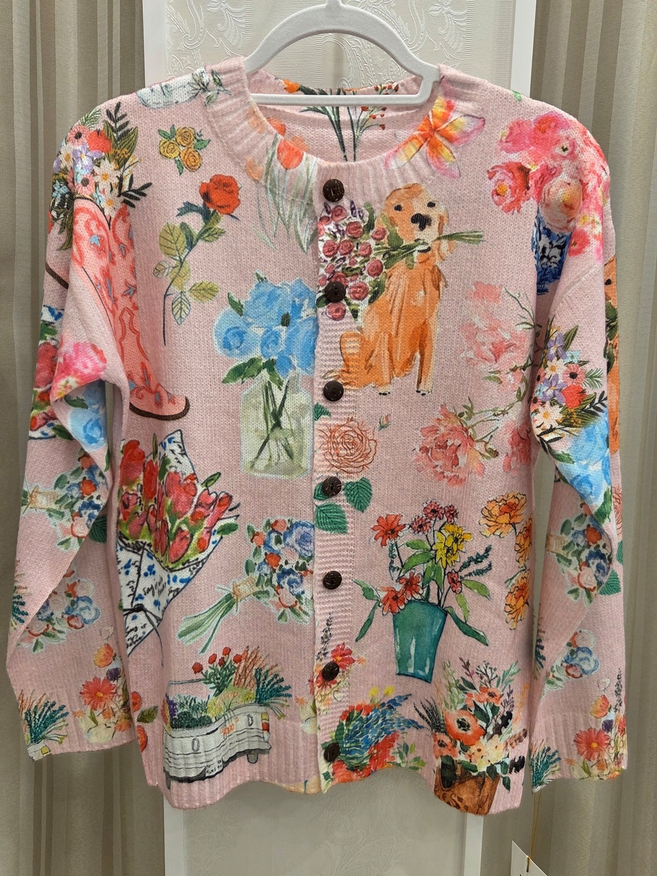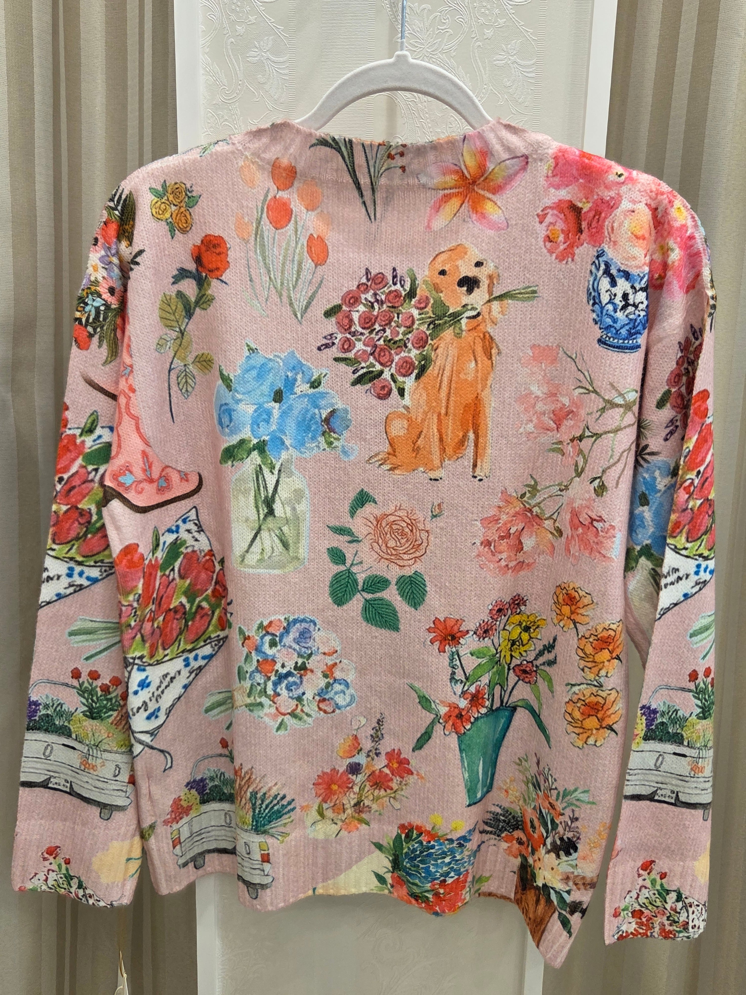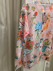 ゴールデンレトリバーと花柄の薄手のニットカーディガンになります。