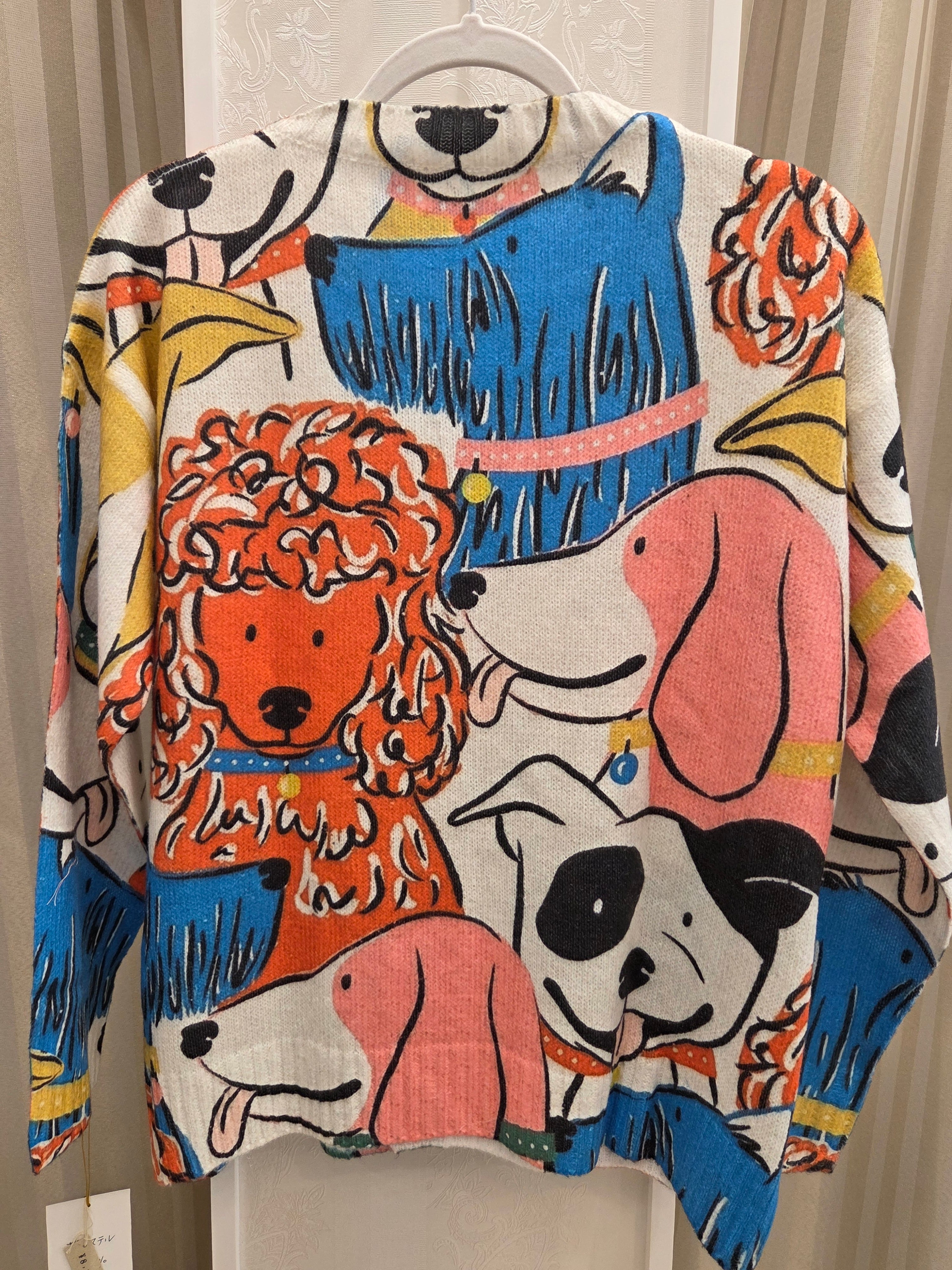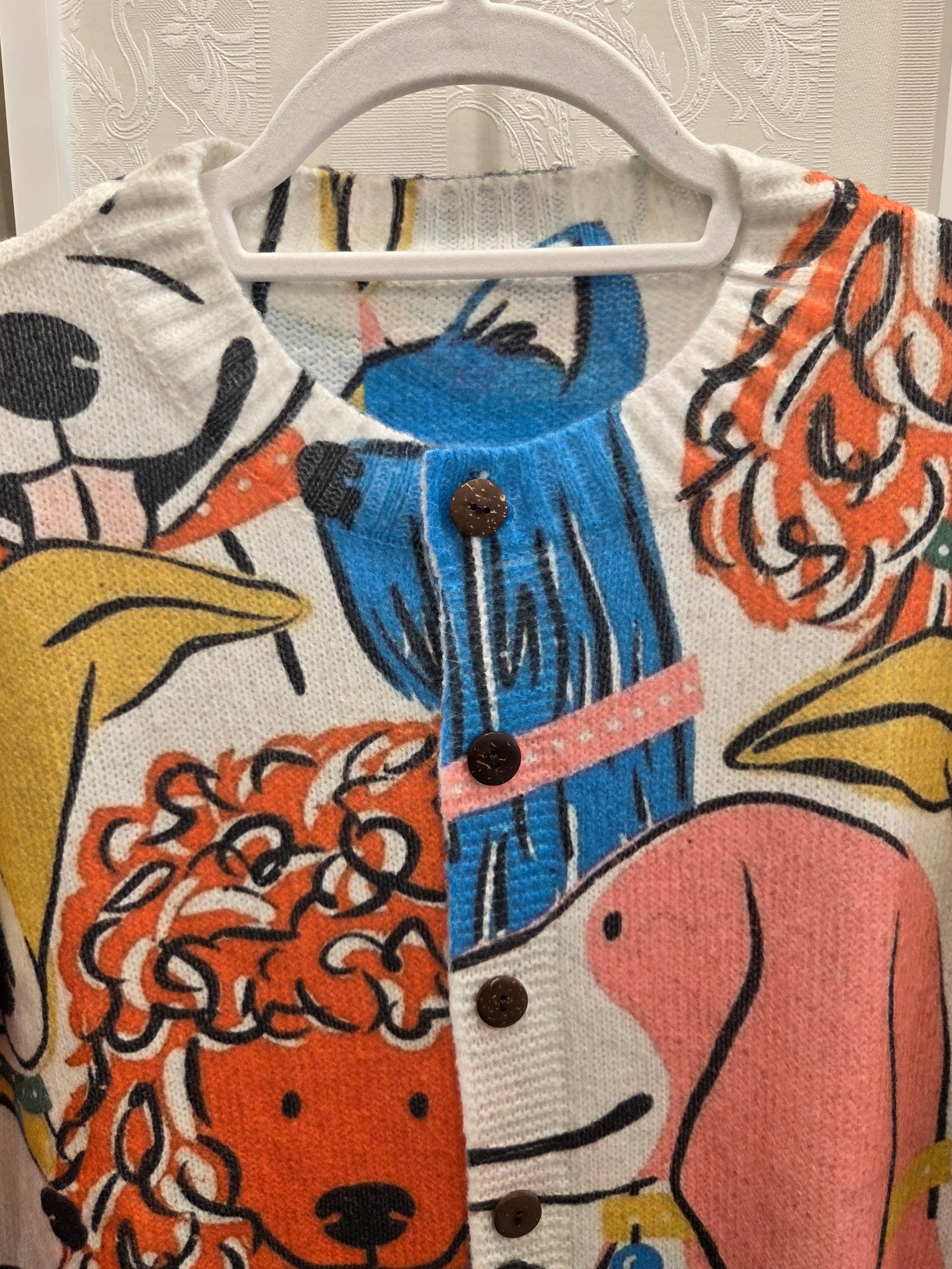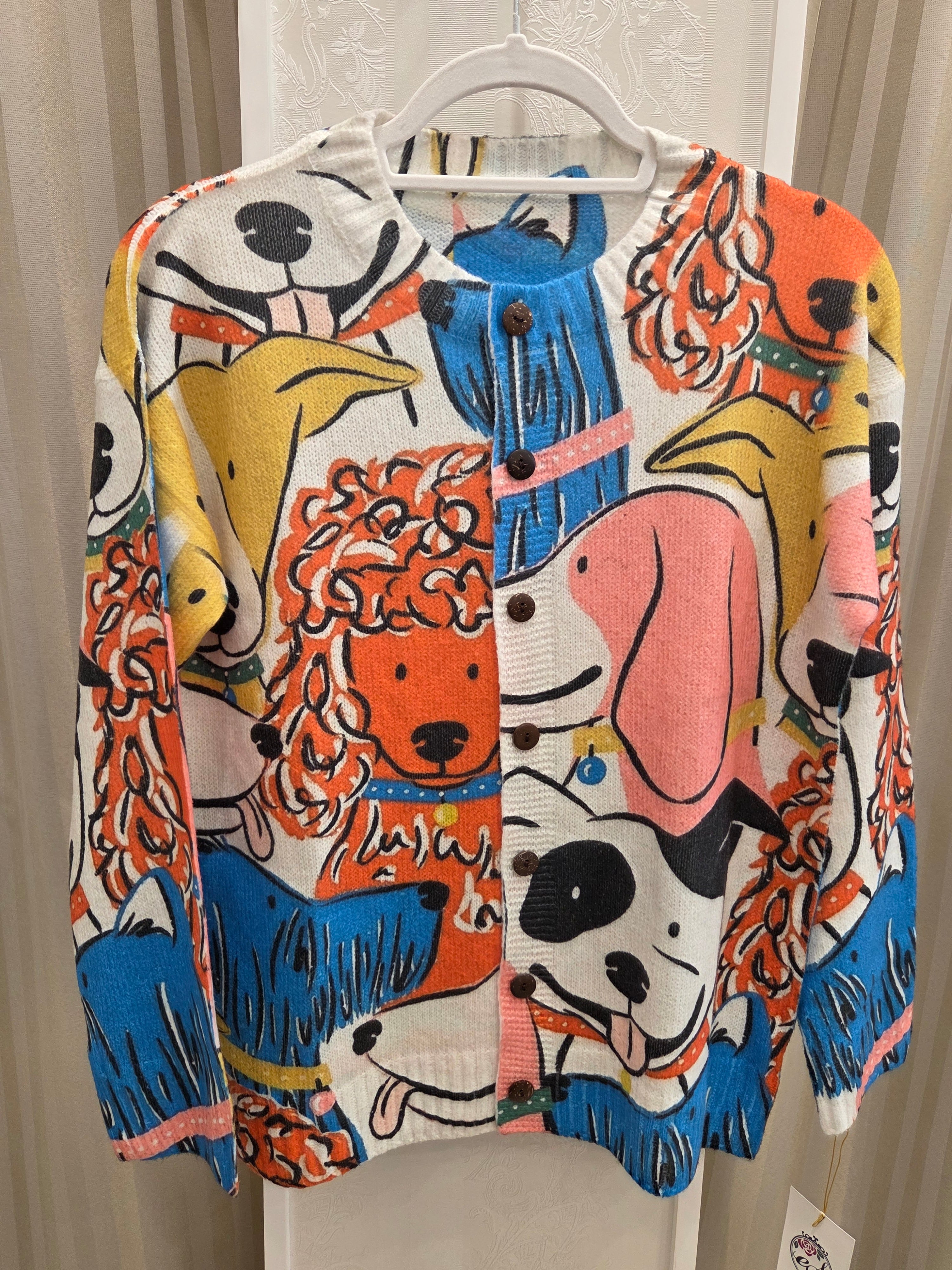 いろんな犬柄 薄手の丸首ニットカーディガン(白ベース)