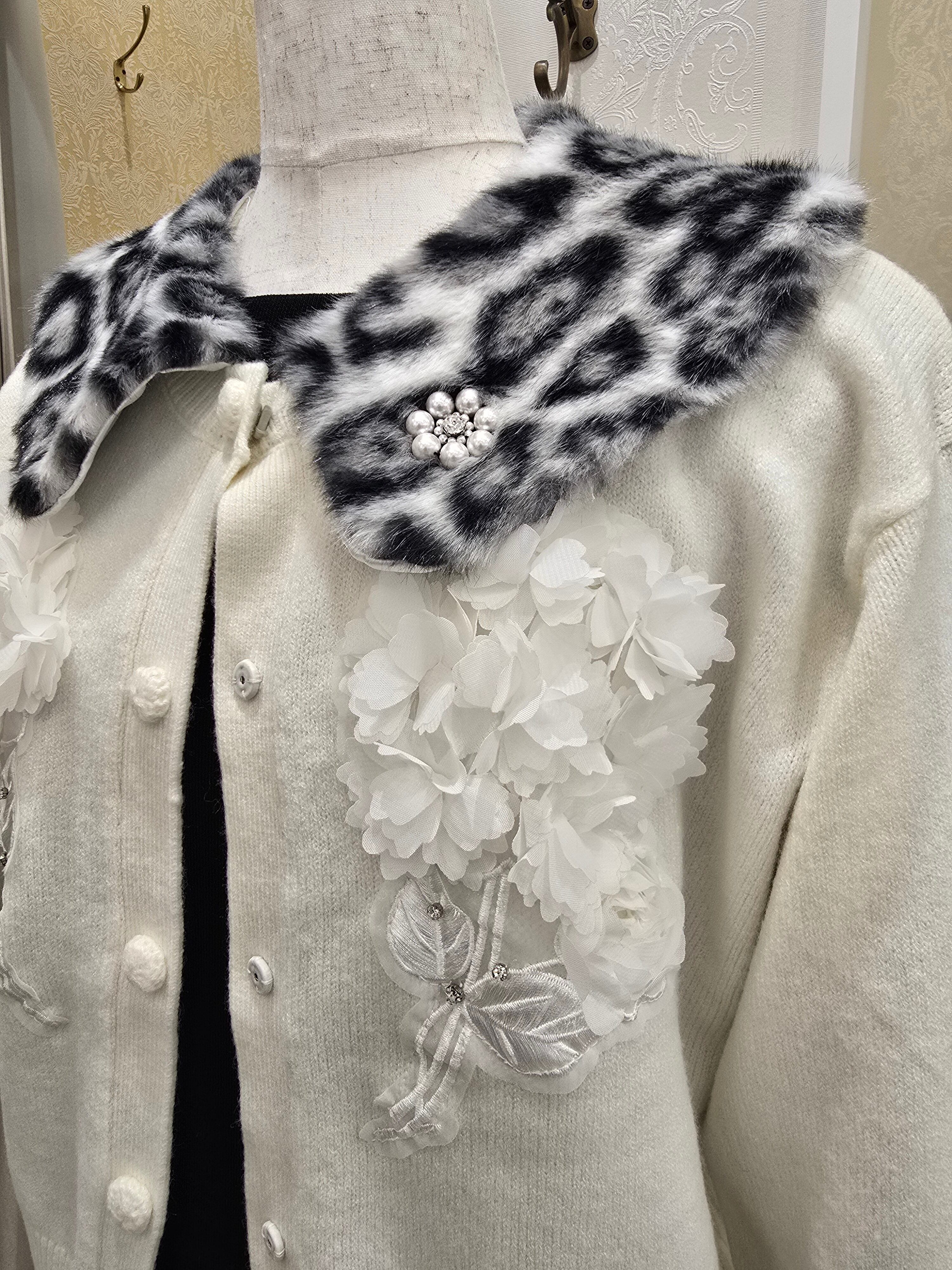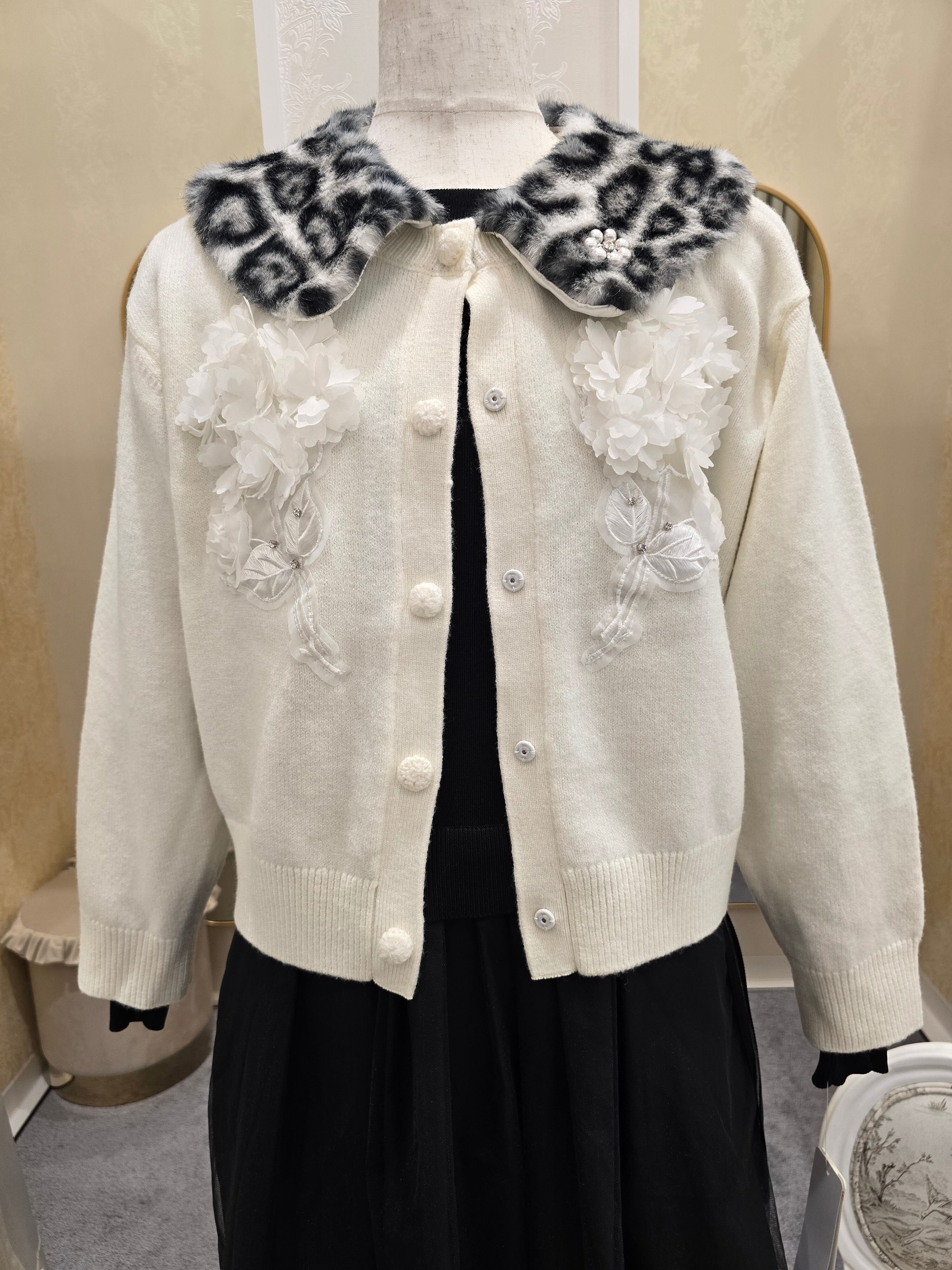 【Super Beauty / スーパービューティー★2025秋冬新作】アニマル柄の襟取り外し可能な胸元立体お花装飾がゴージャスなカーディガン