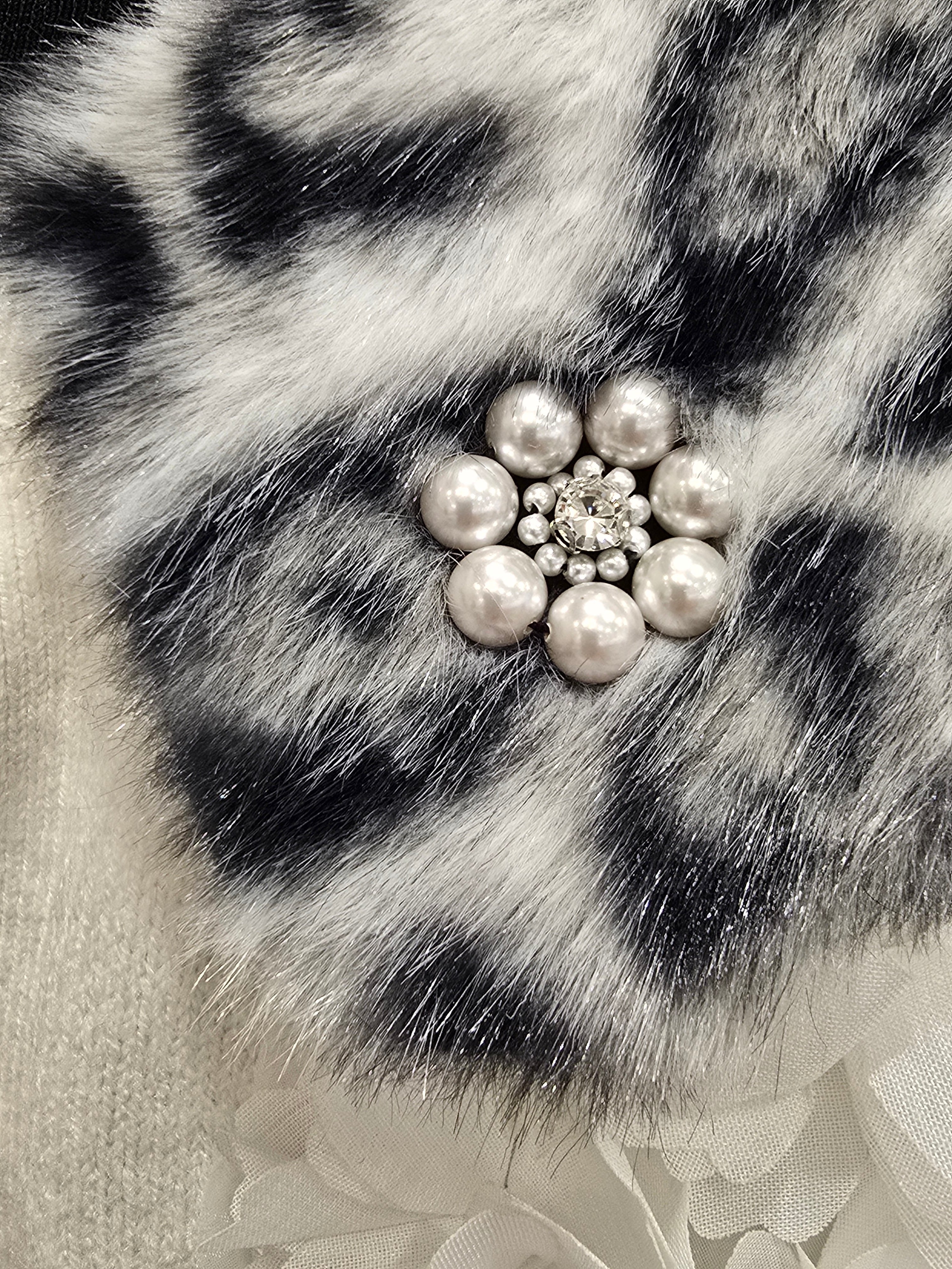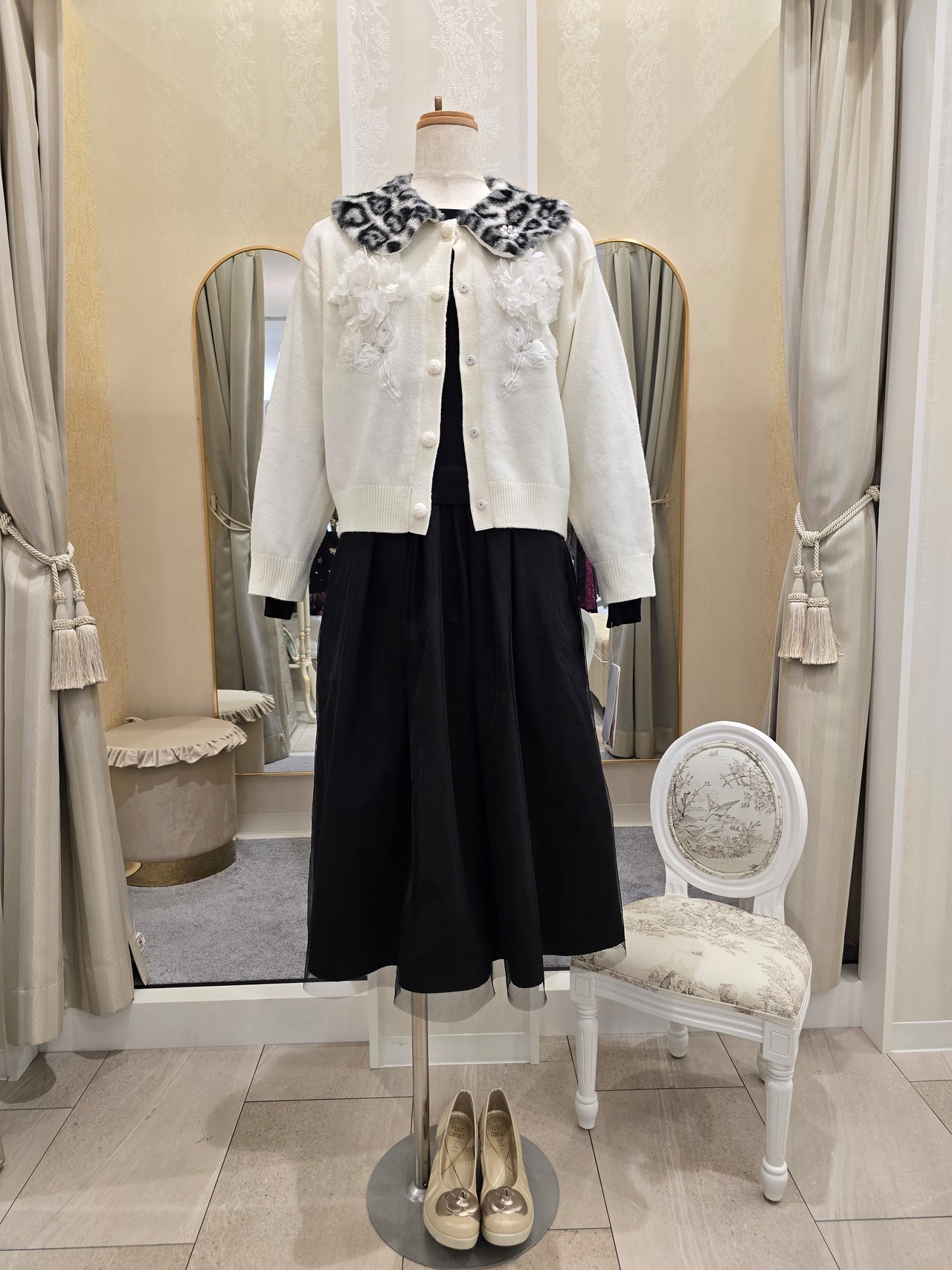 トレンドを押さえたアニマル柄と、取り外し可能な襟が特徴で、シーンに応じて楽しめるデザインになります。胸元には立体的なお花装飾が施され、華やかさを引き立てます。