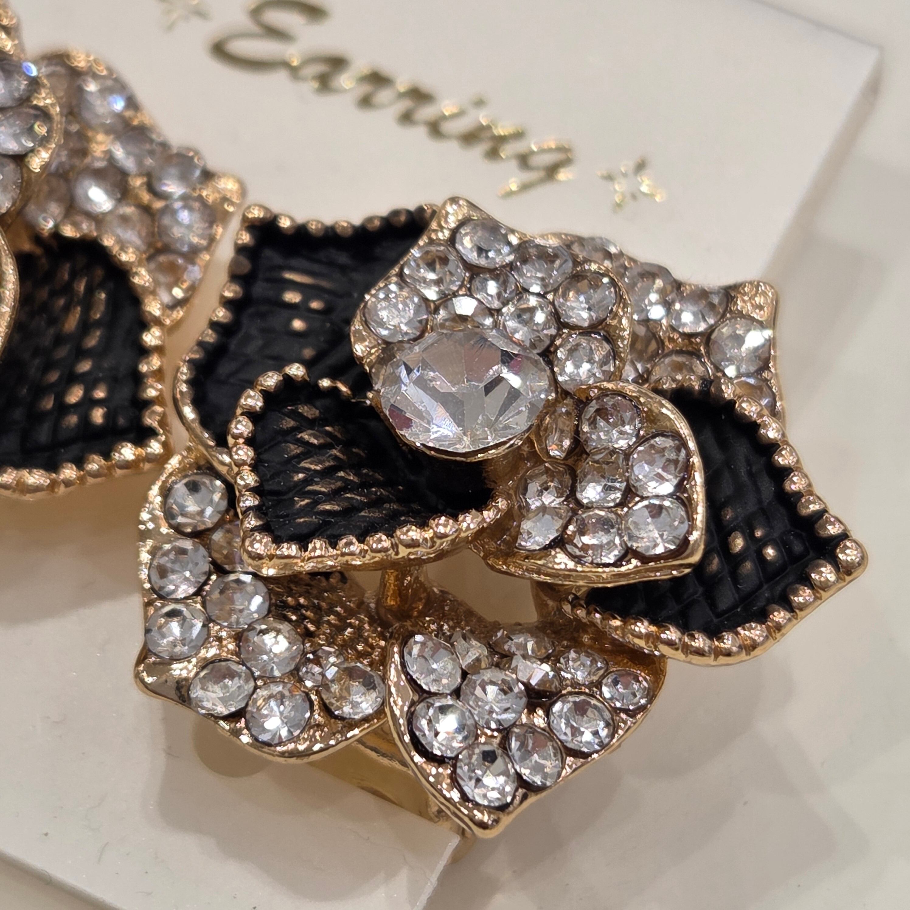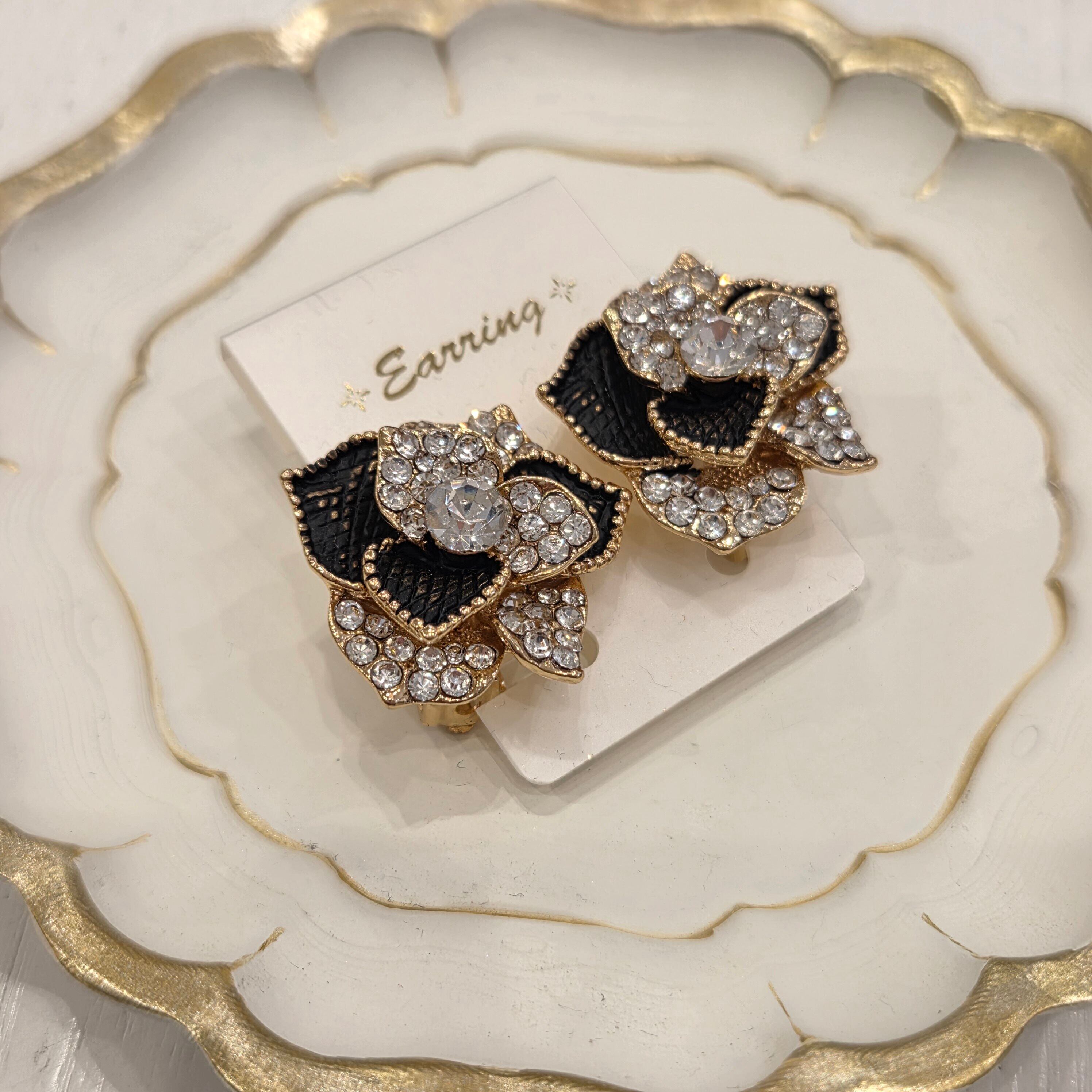 【キラキラビジュー イヤリング】☆花 ブラック エレガント