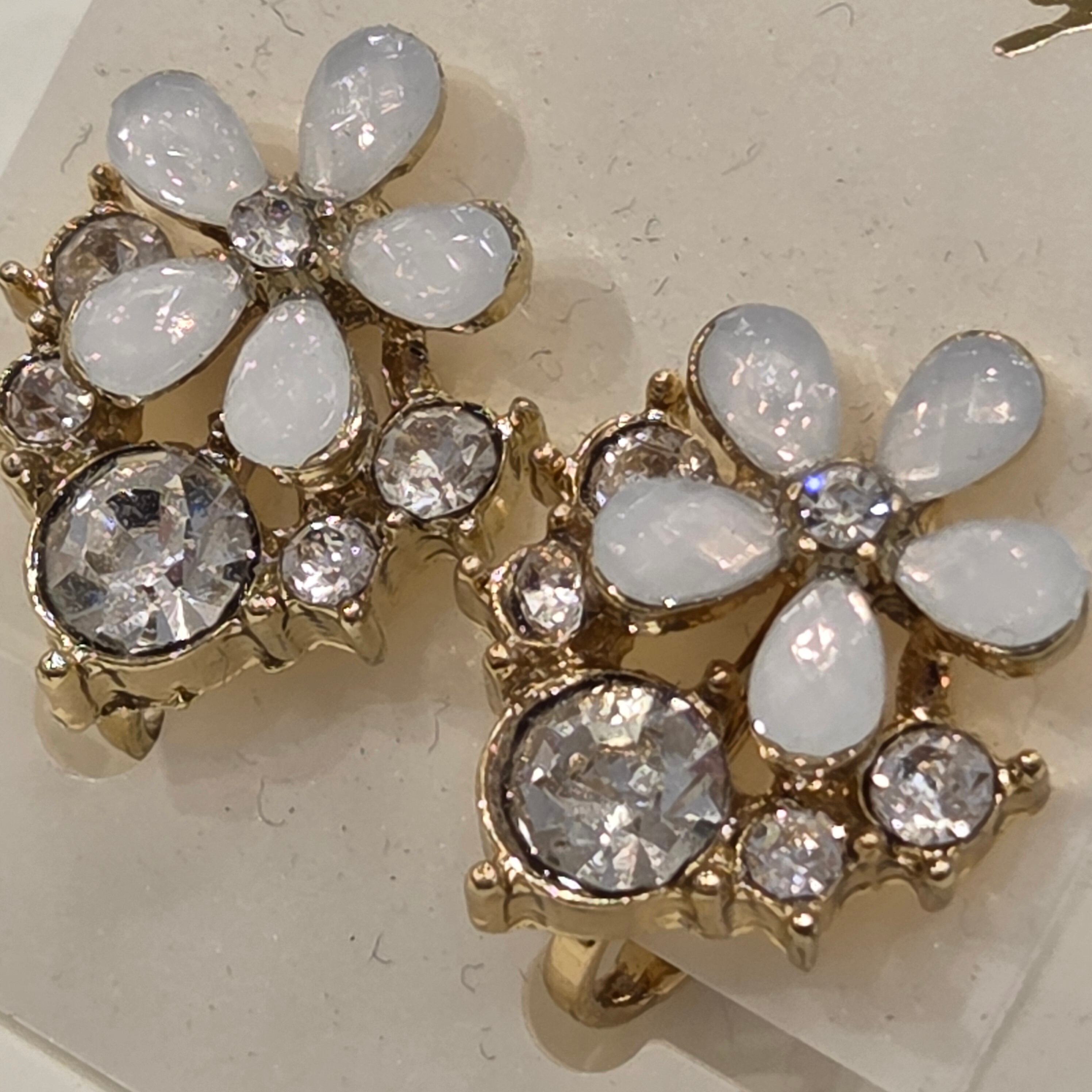 ホワイトの花デザインが印象的なこのイヤリングは、繊細に施されたビジューが美しく輝き、あらゆるシーンで大人かわいいスタイルを演出します。特別な日のお出かけや、カジュアルな日常使いに最適なアイテムです。