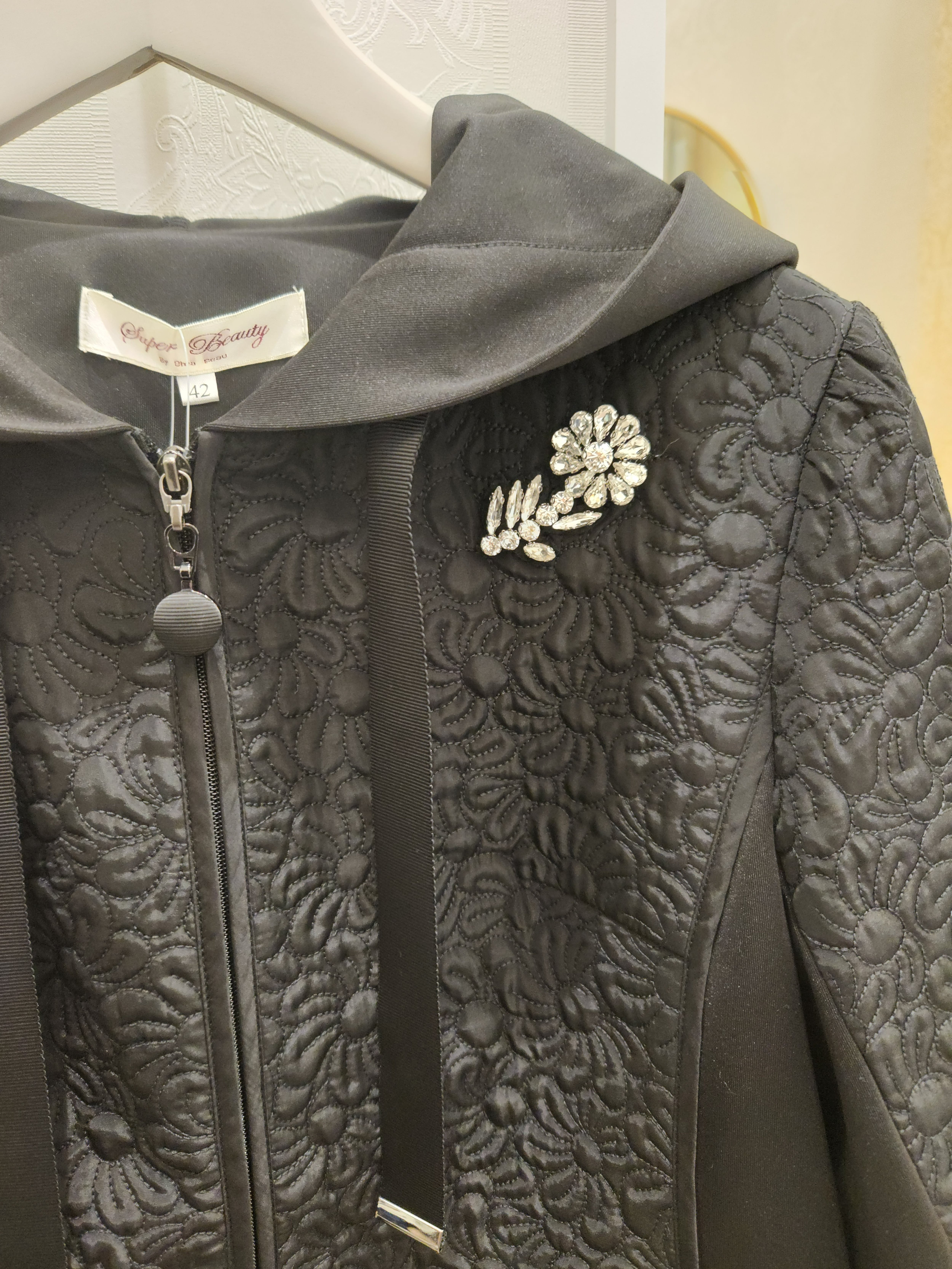 胸元のブローチを付けたようなビジューでかたどられたお花の装飾とお花の形の高級感溢れるふくれ織りの生地が特徴のフード付きジャケット
