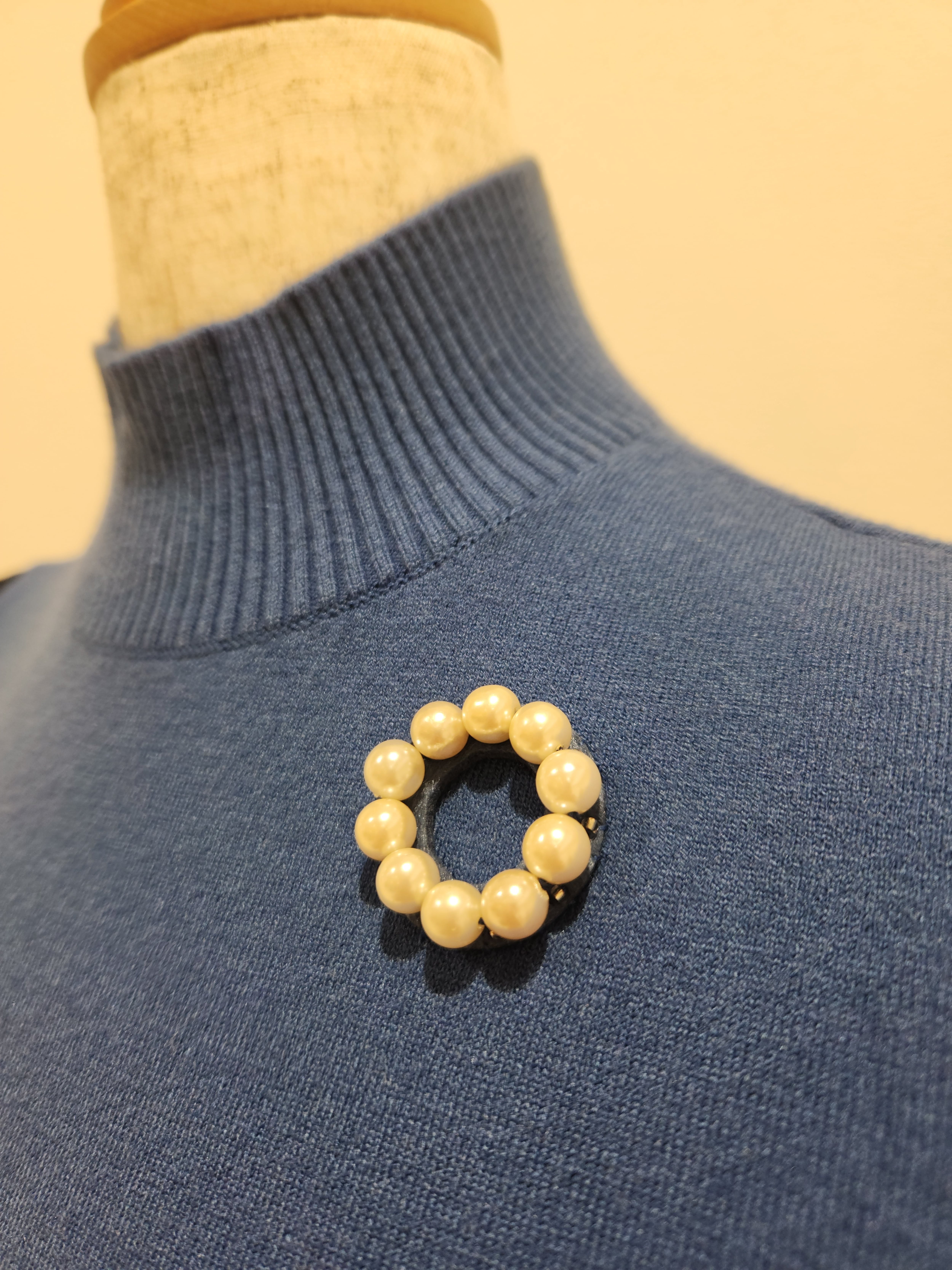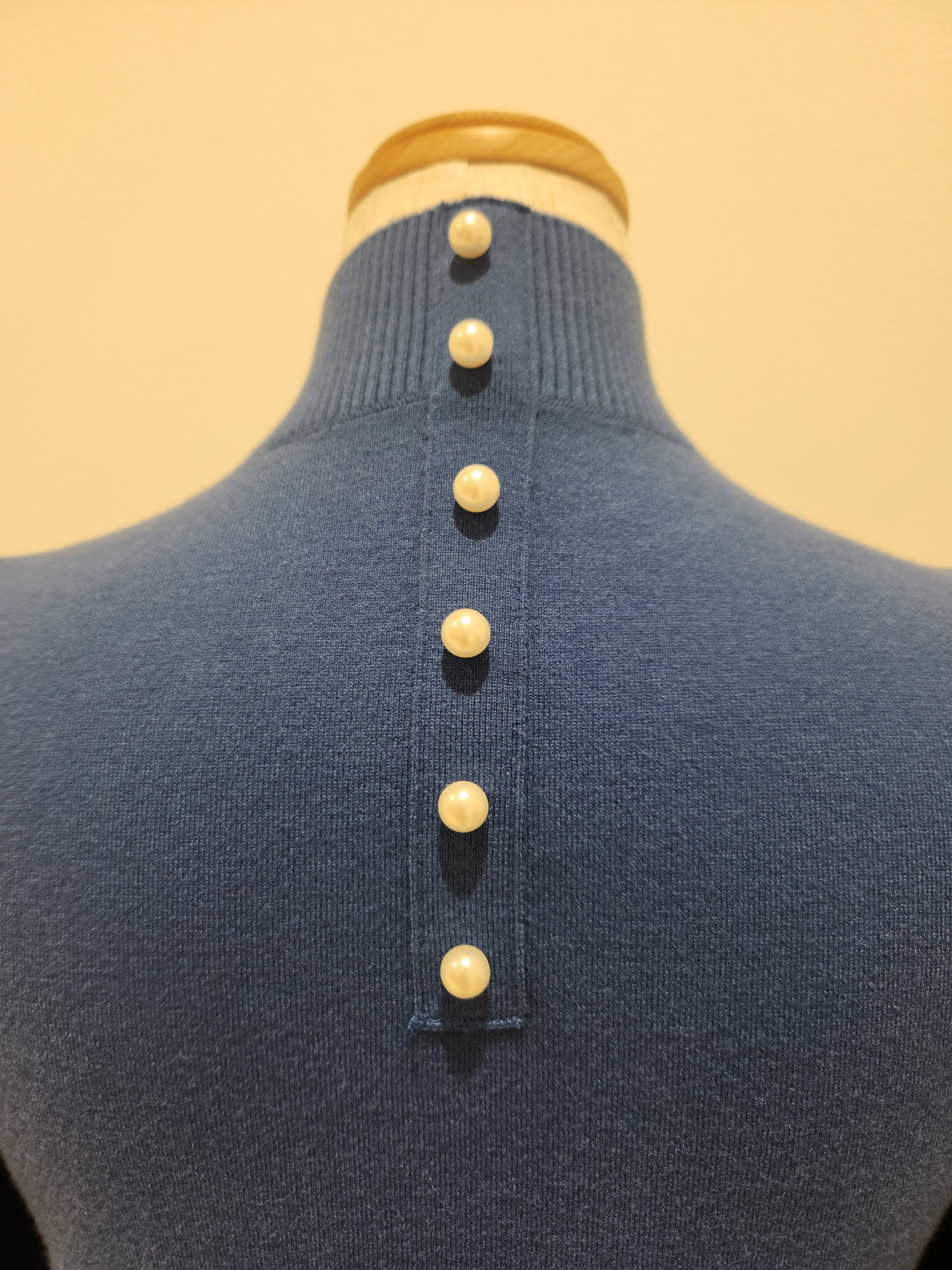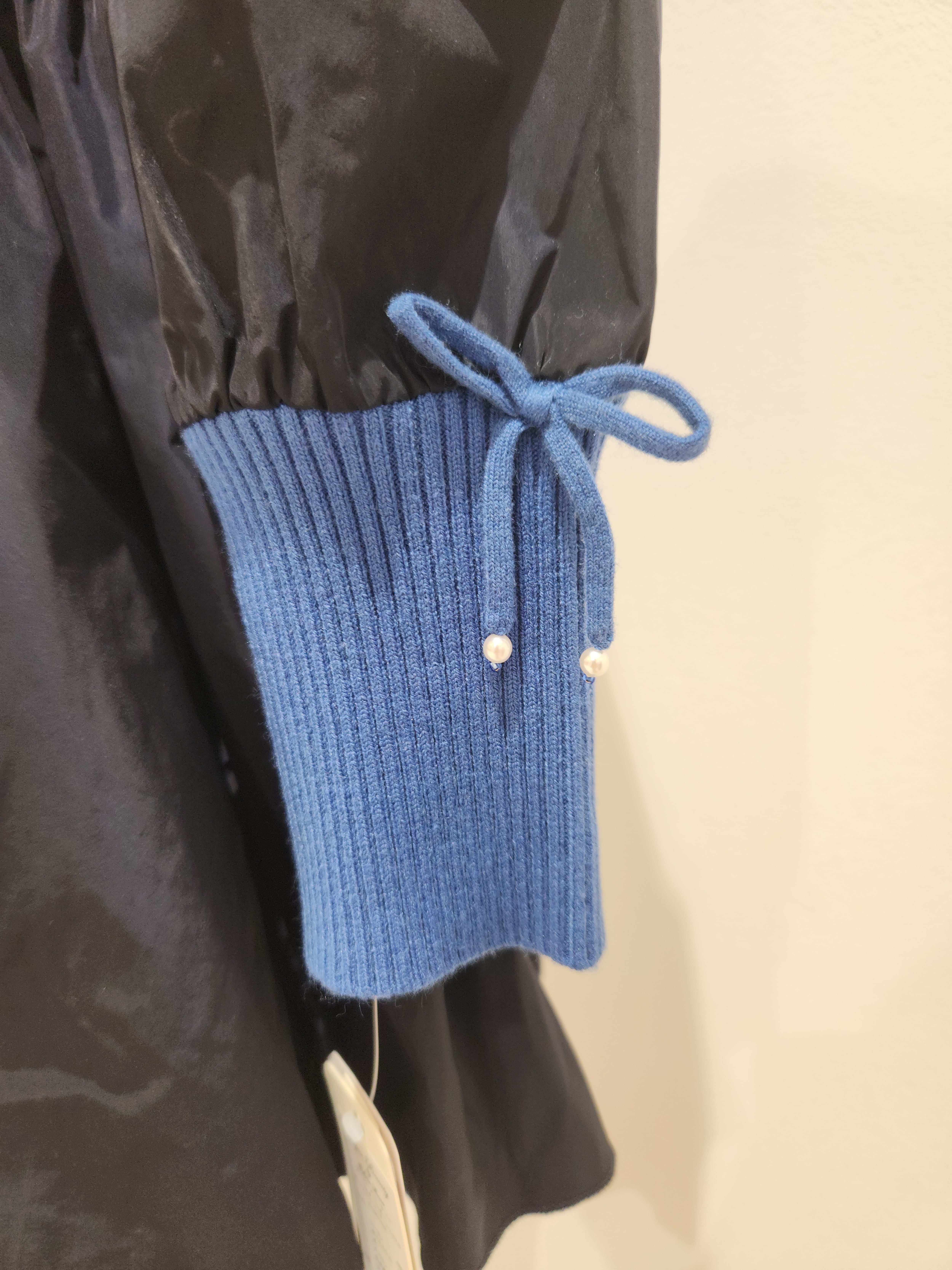 胸元と首の後ろにはパール装飾、ウエスト辺りと袖口には上品なリボン装飾があしらわれて、とてもフェミニンな印象