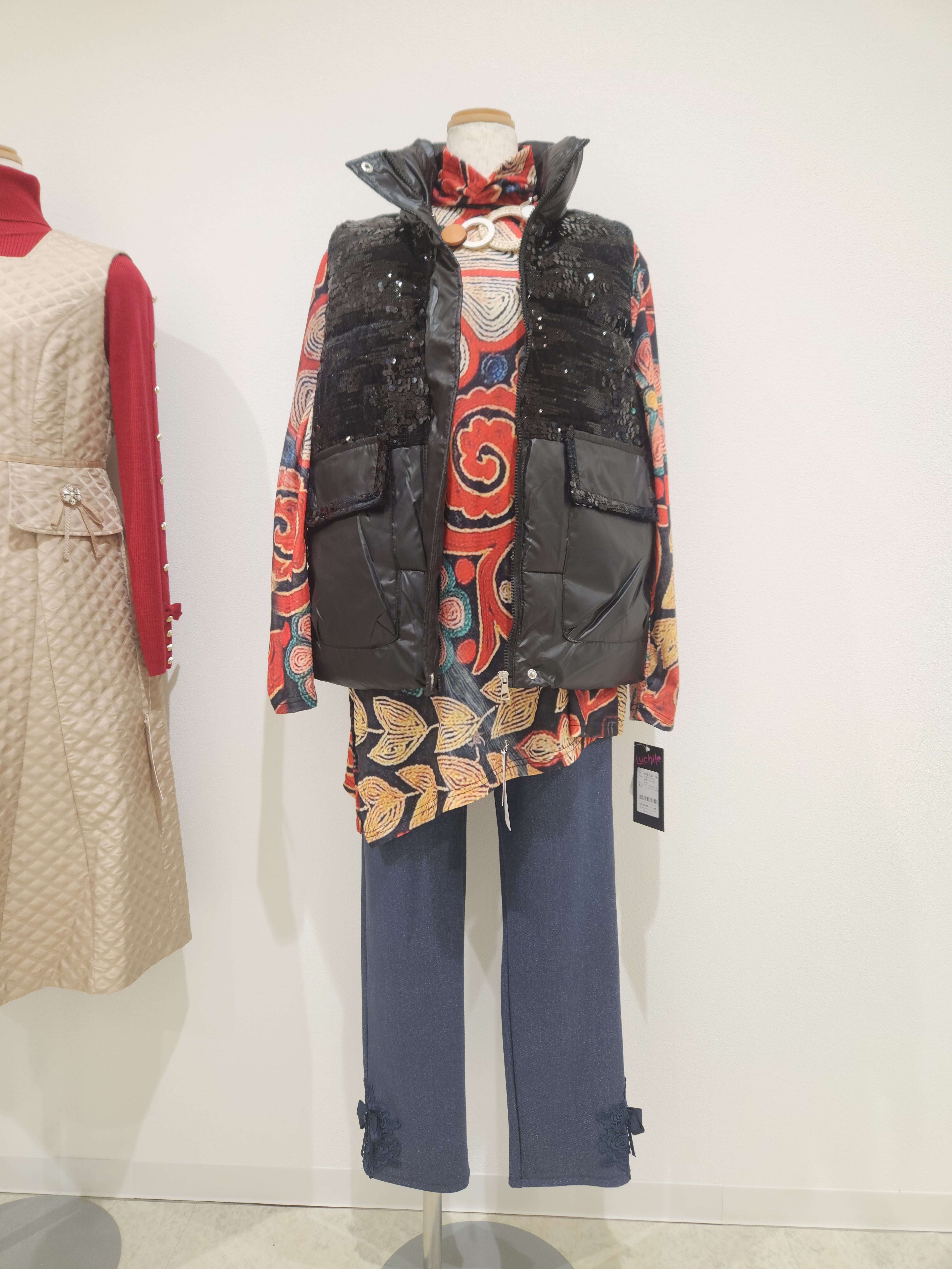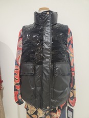 ブラックの中綿ベストは沢山溢れていますが、エコソーレで扱う商品は一味違う個性的でゴージャスな一品です。