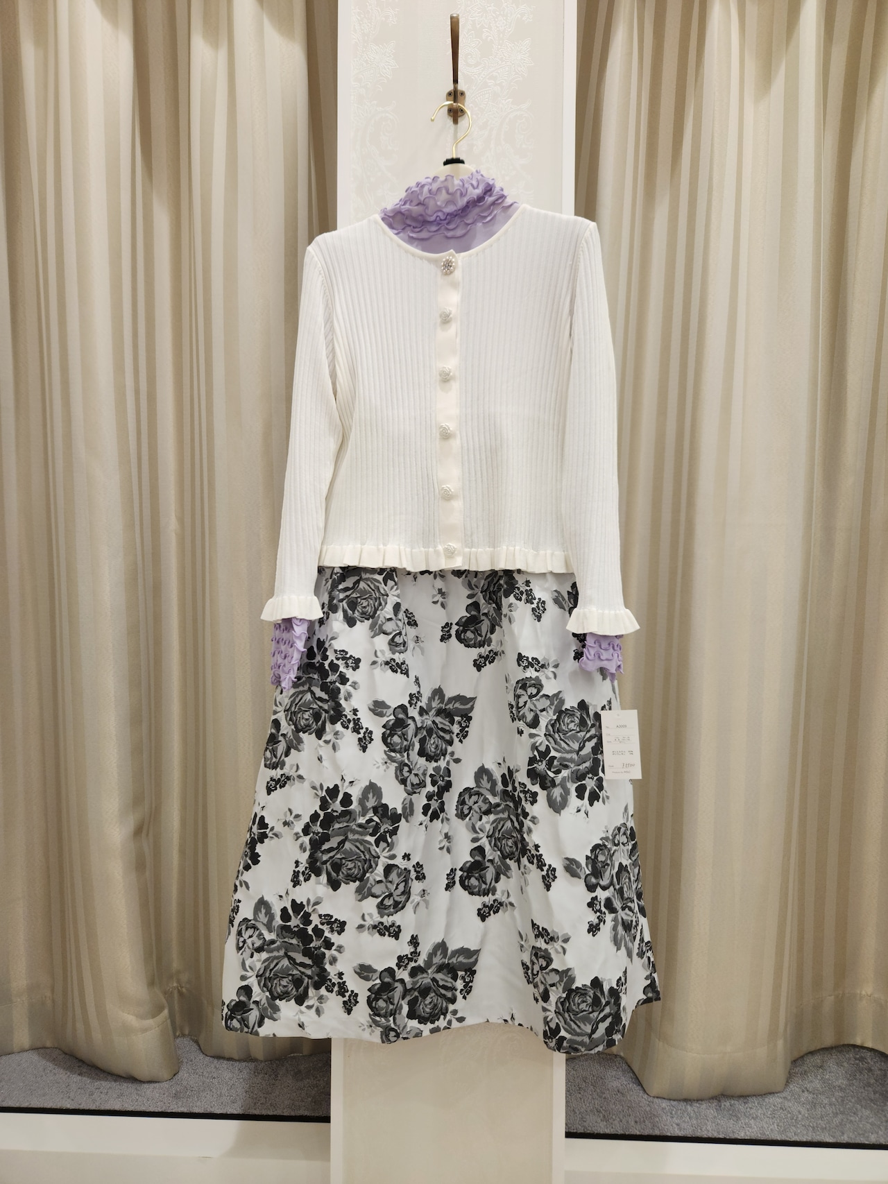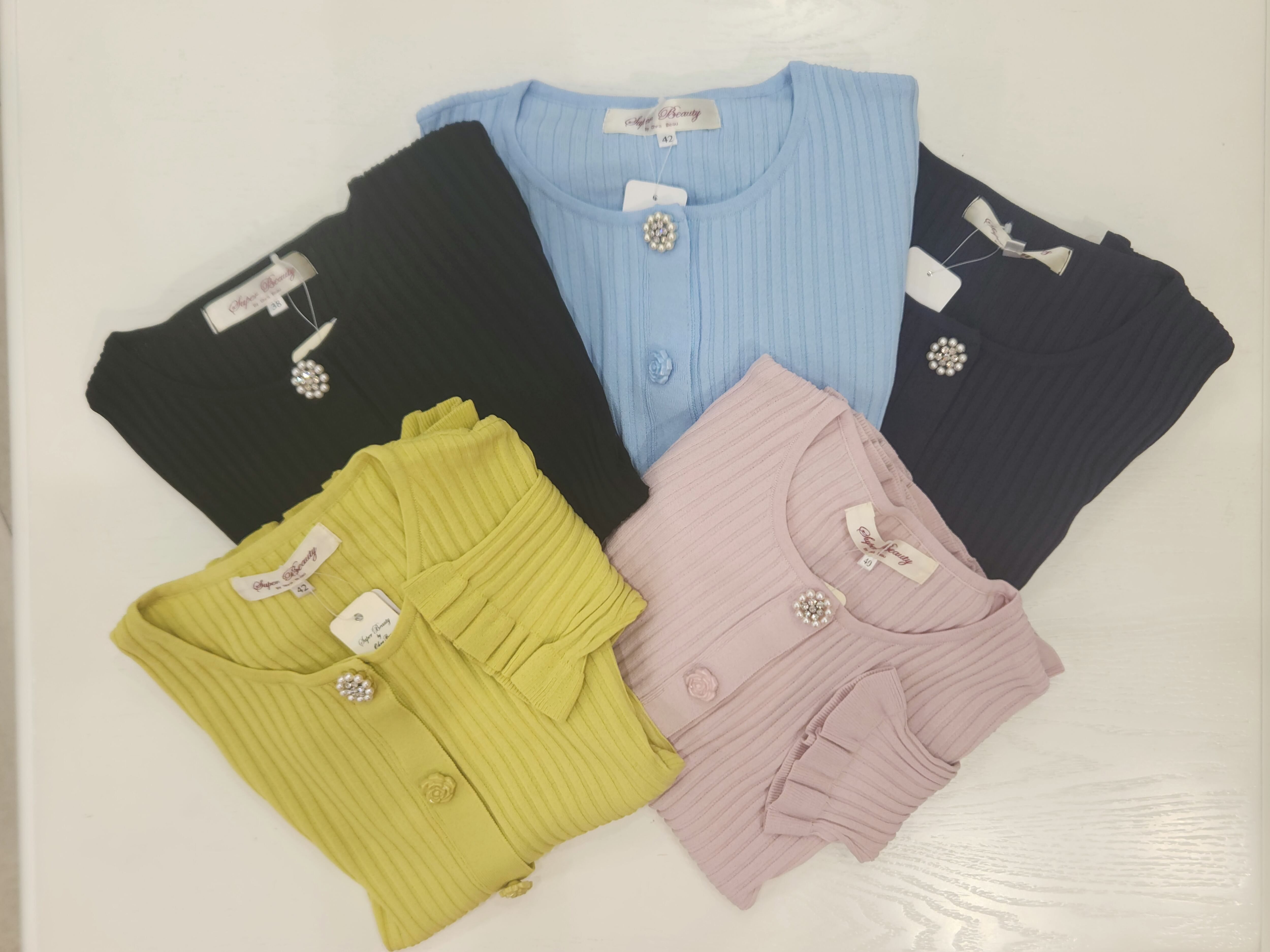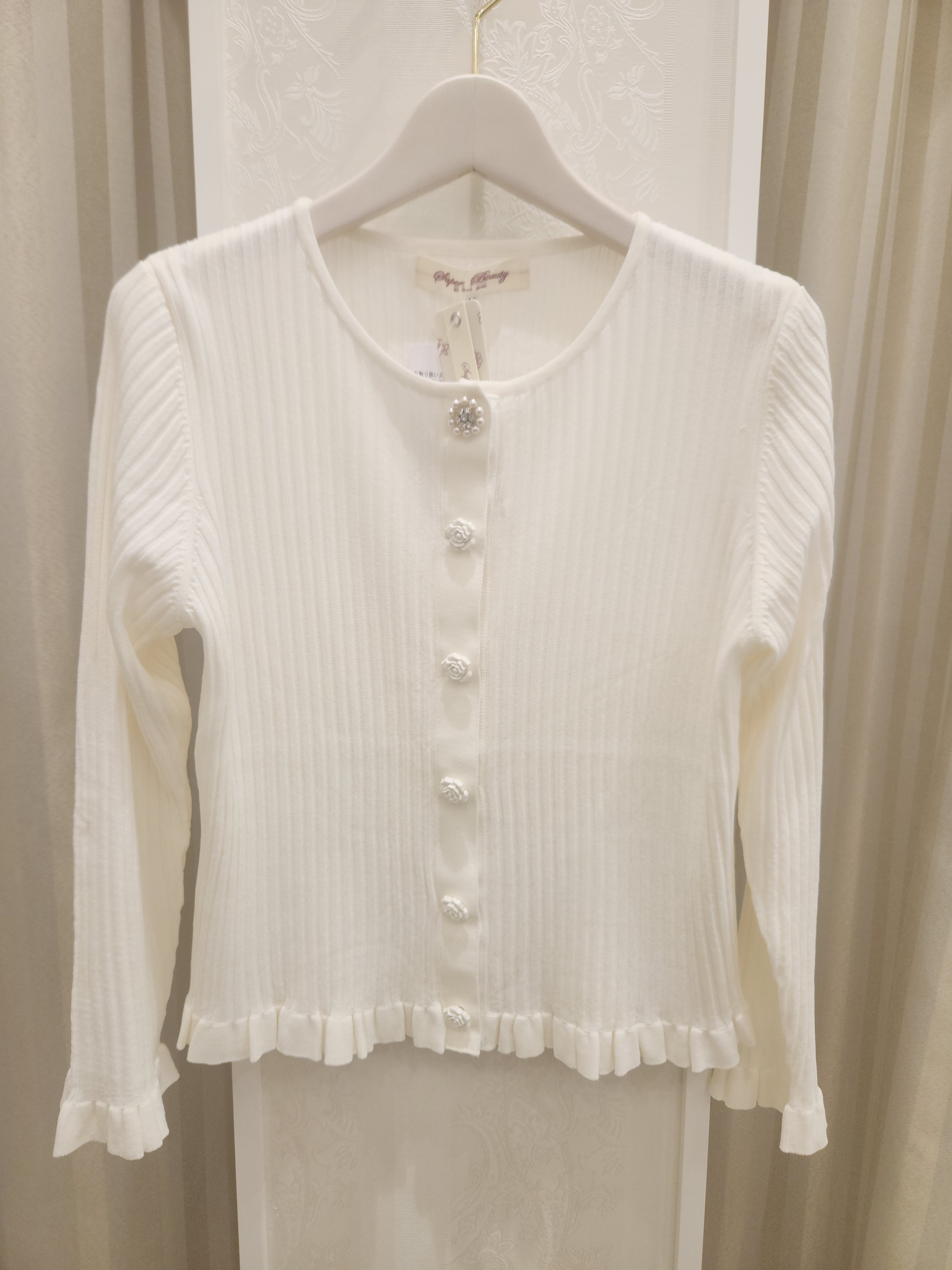 【Super Beauty★新作】パール×ピジューと薔薇ボタンのフリル・リブニットカーディガン