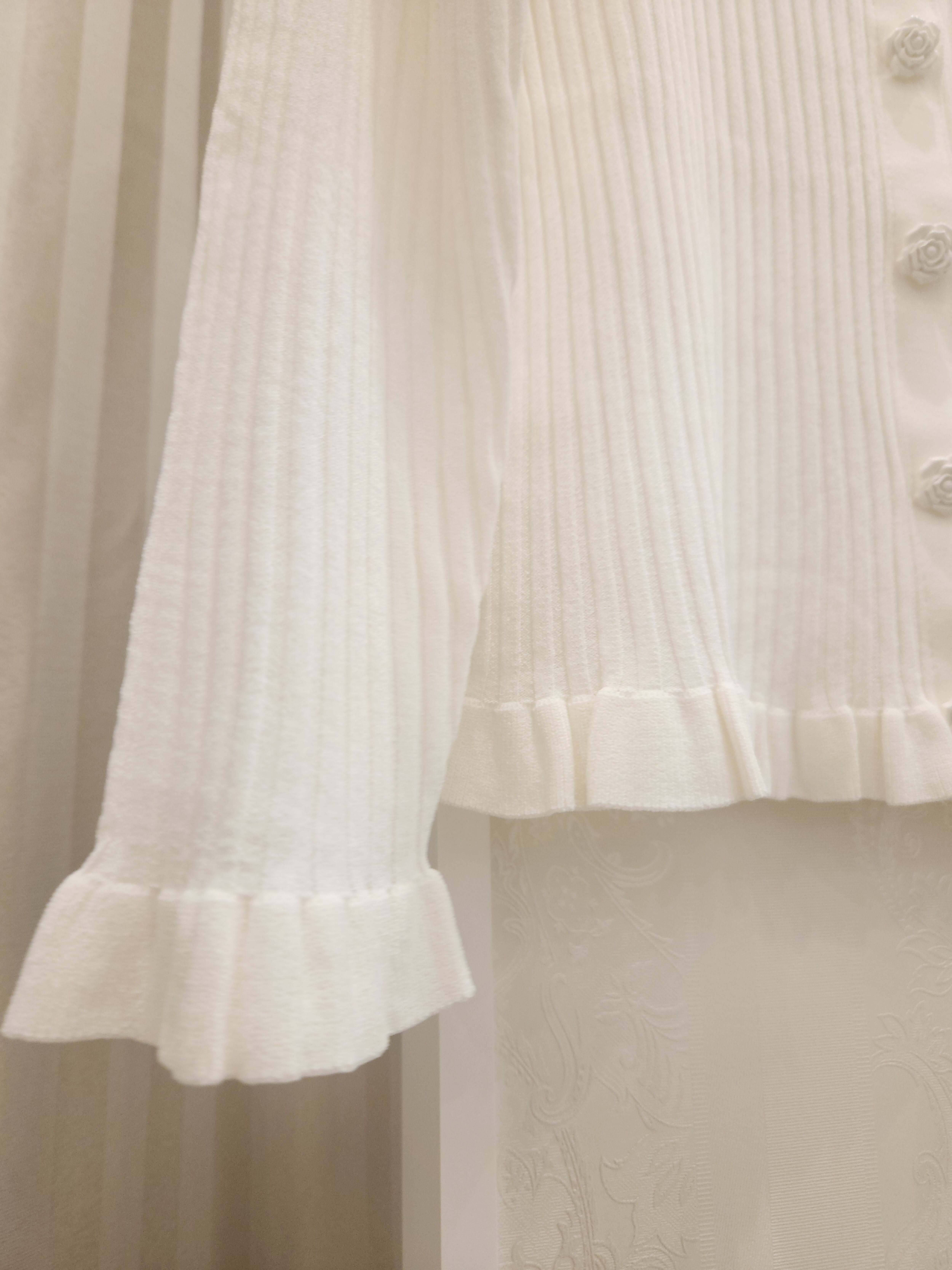 お袖と裾フリルが女性らしいリブニットカーディガンです。