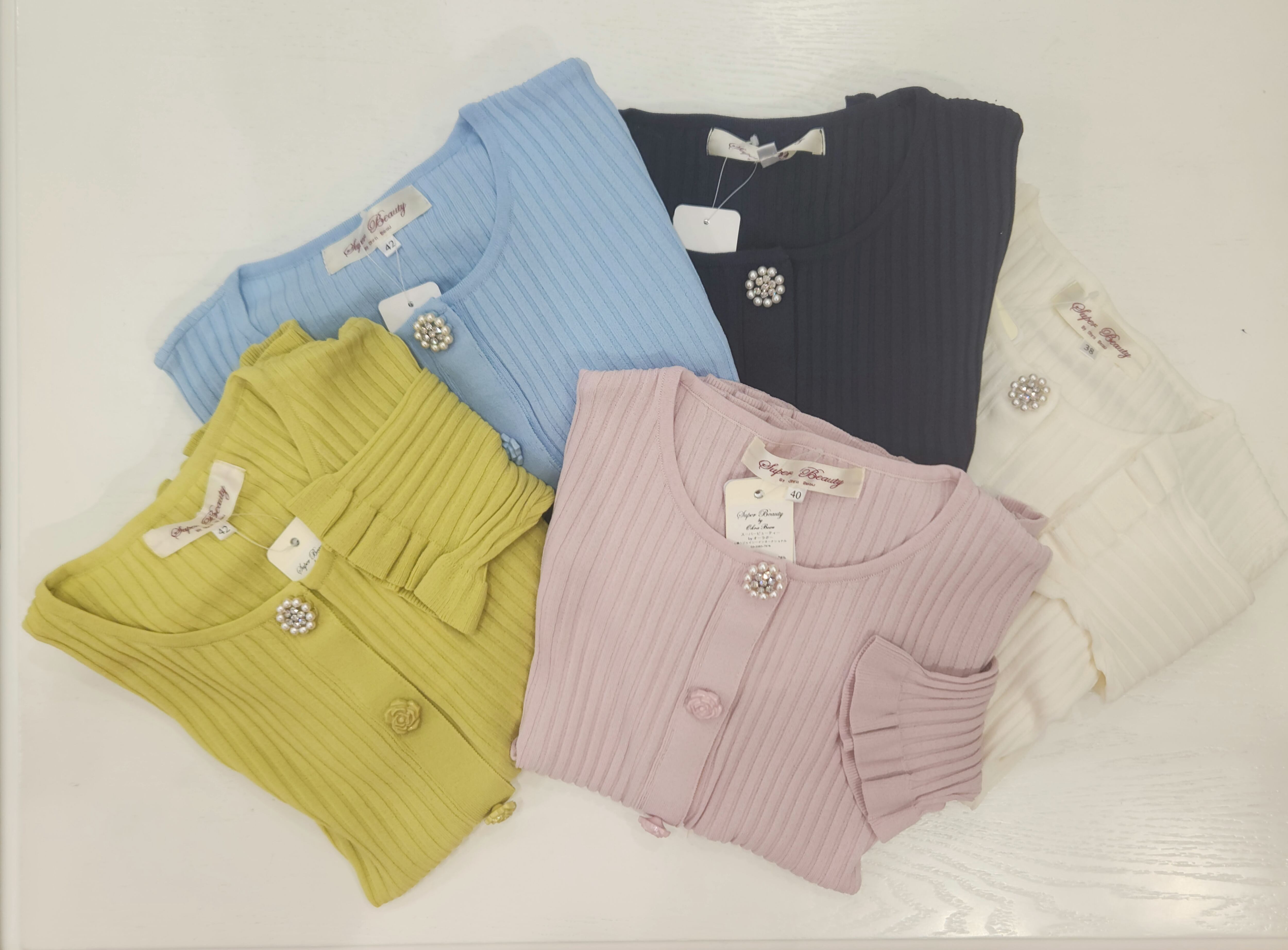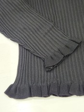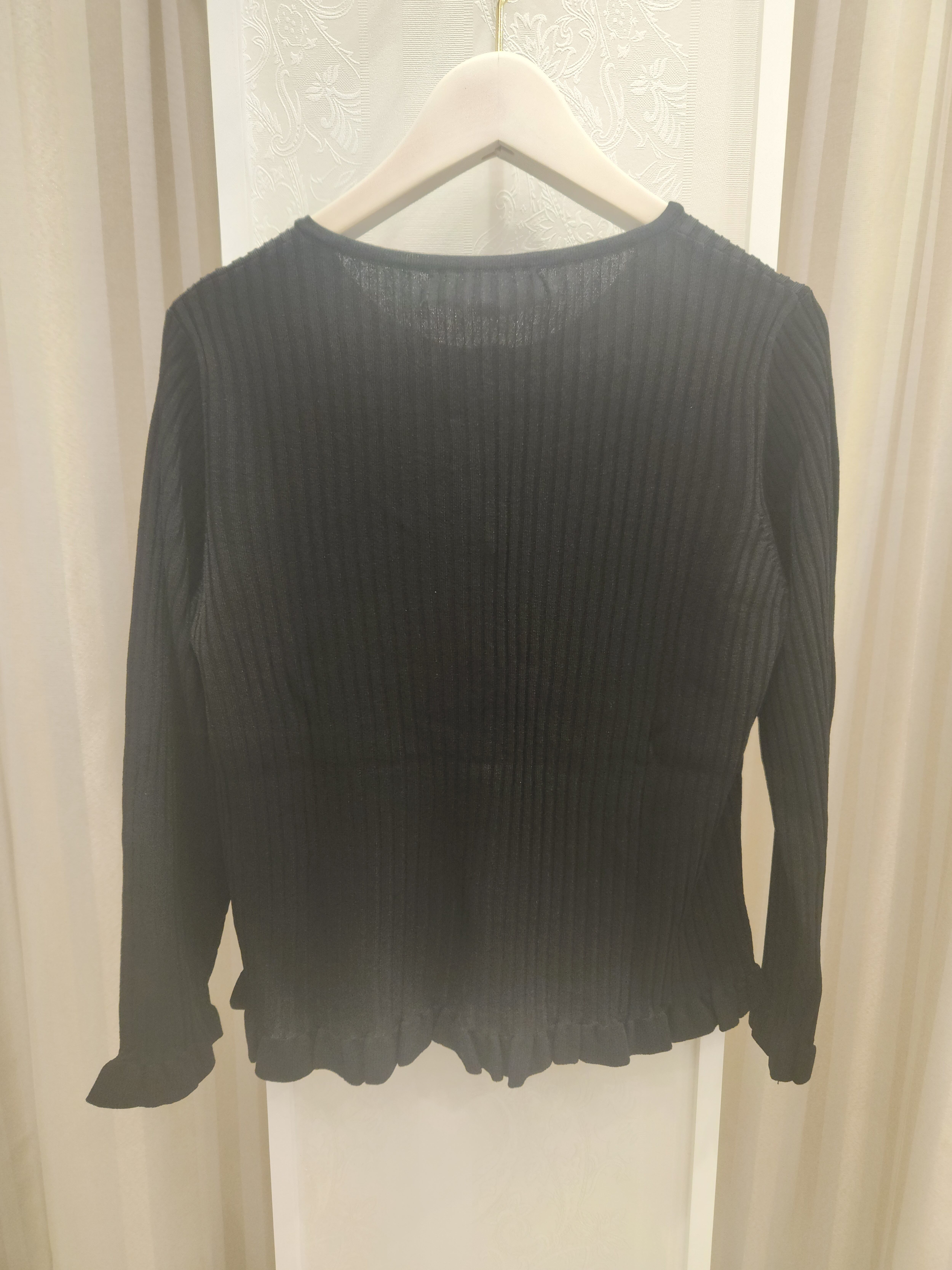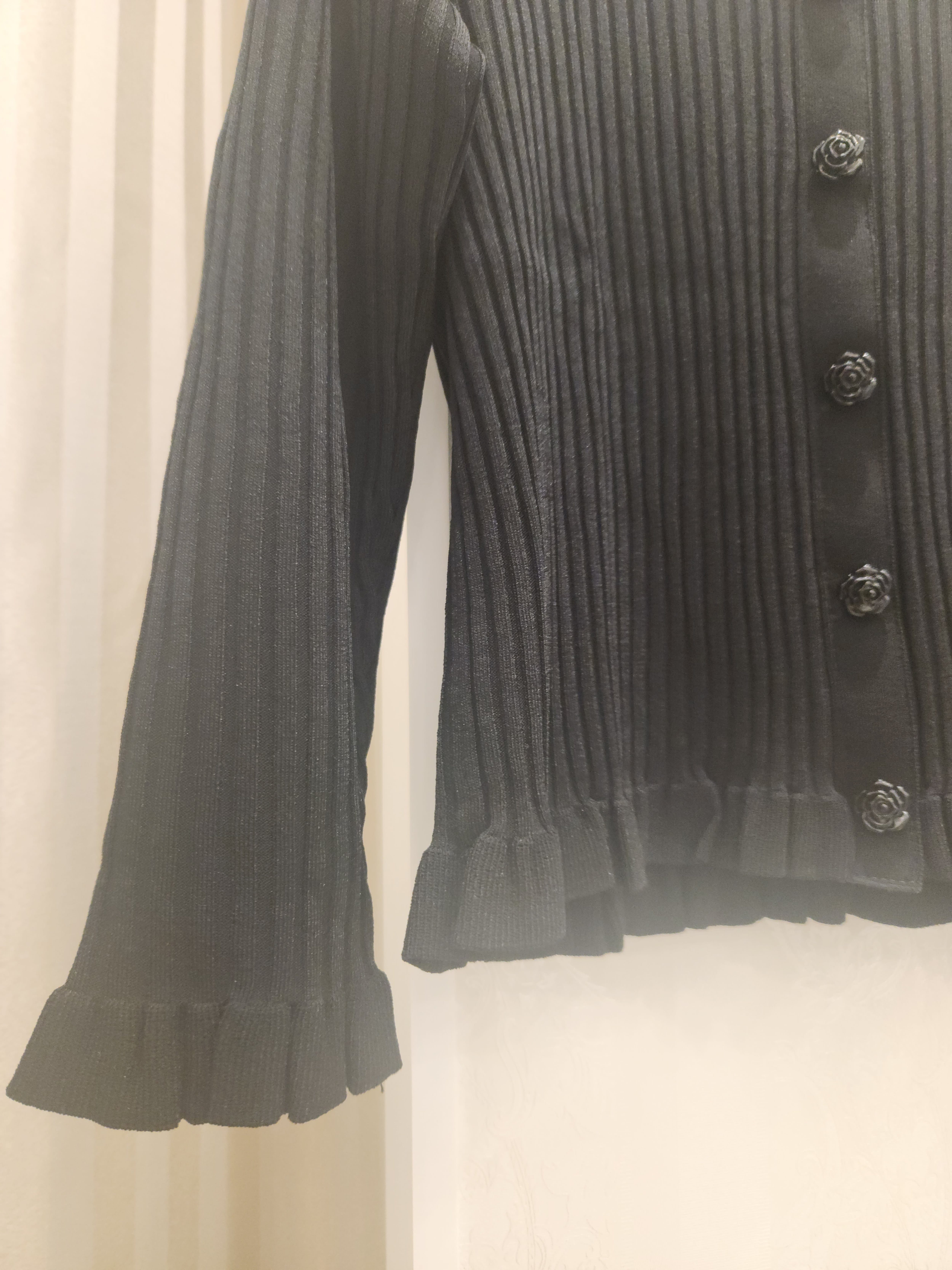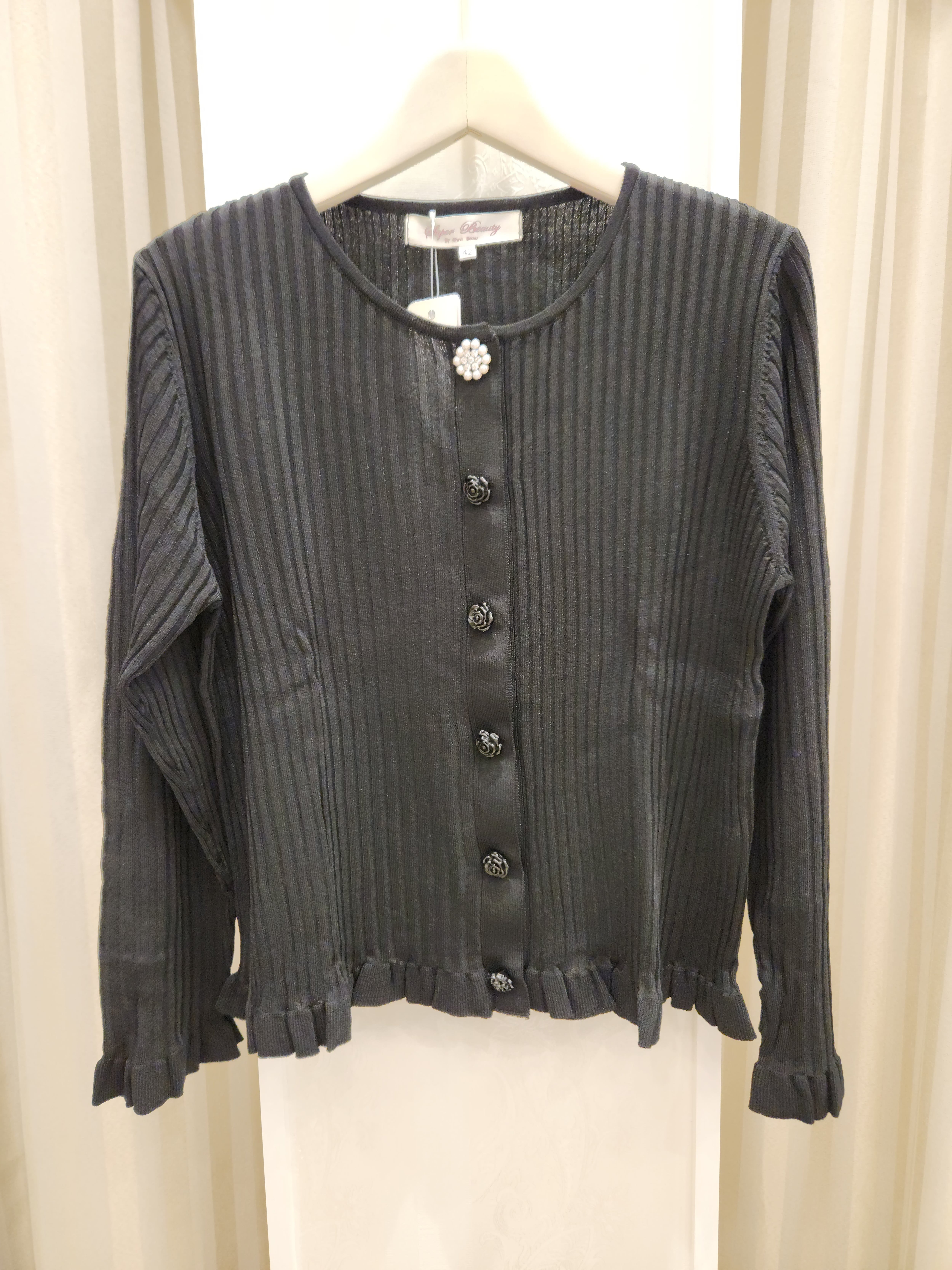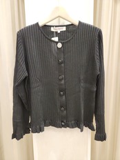 お袖と裾フリルが女性らしいリブニットカーディガンです。