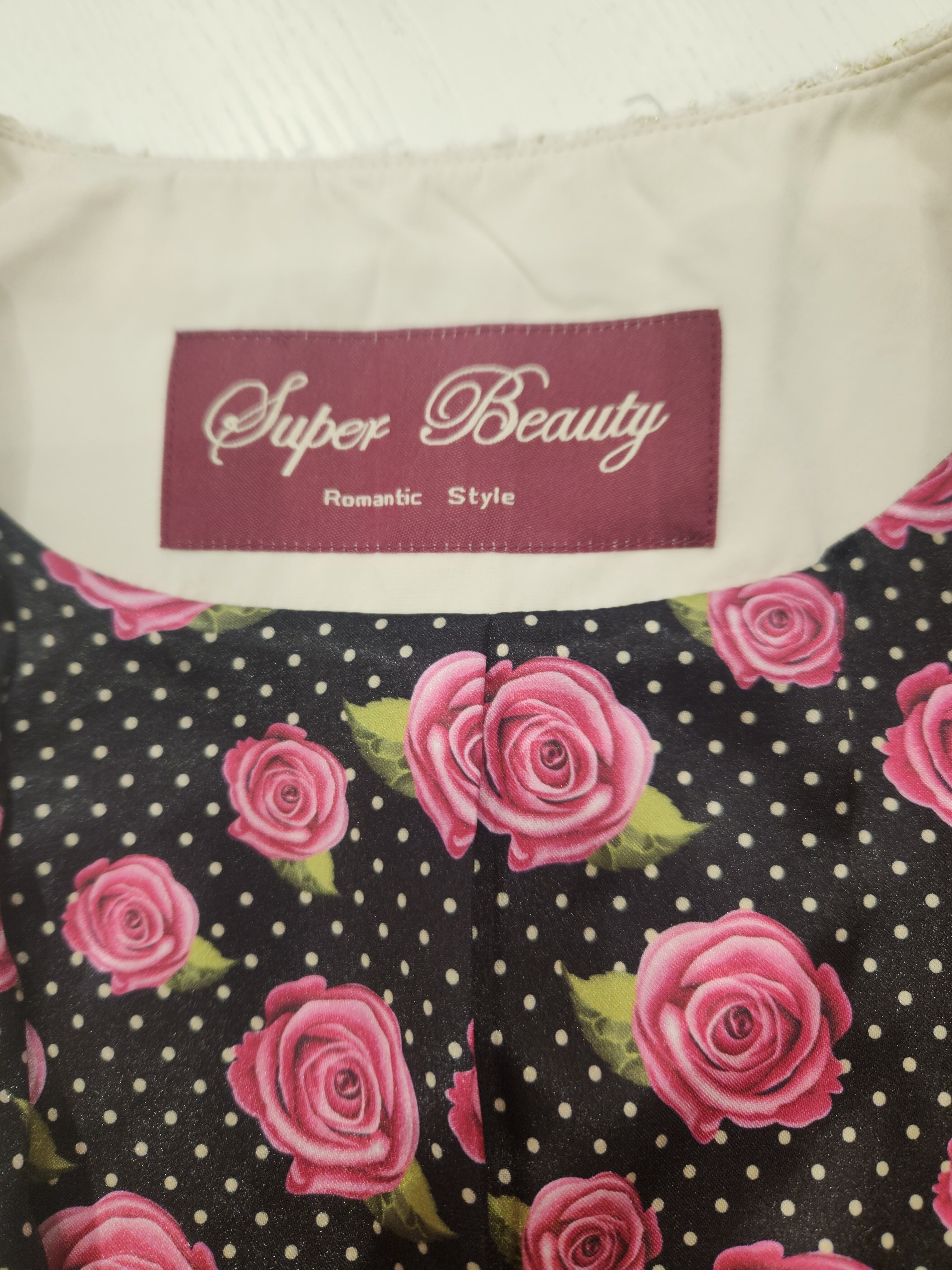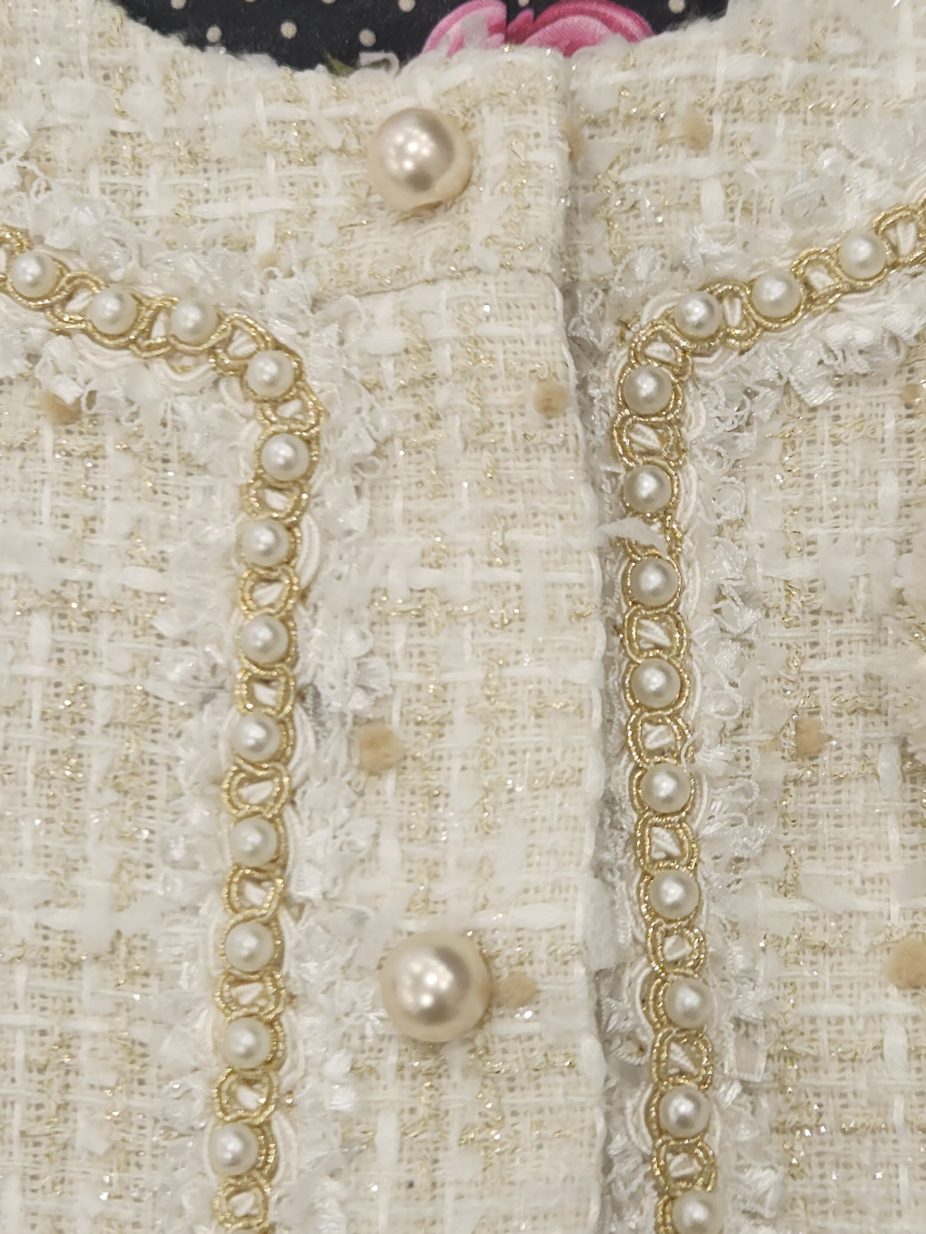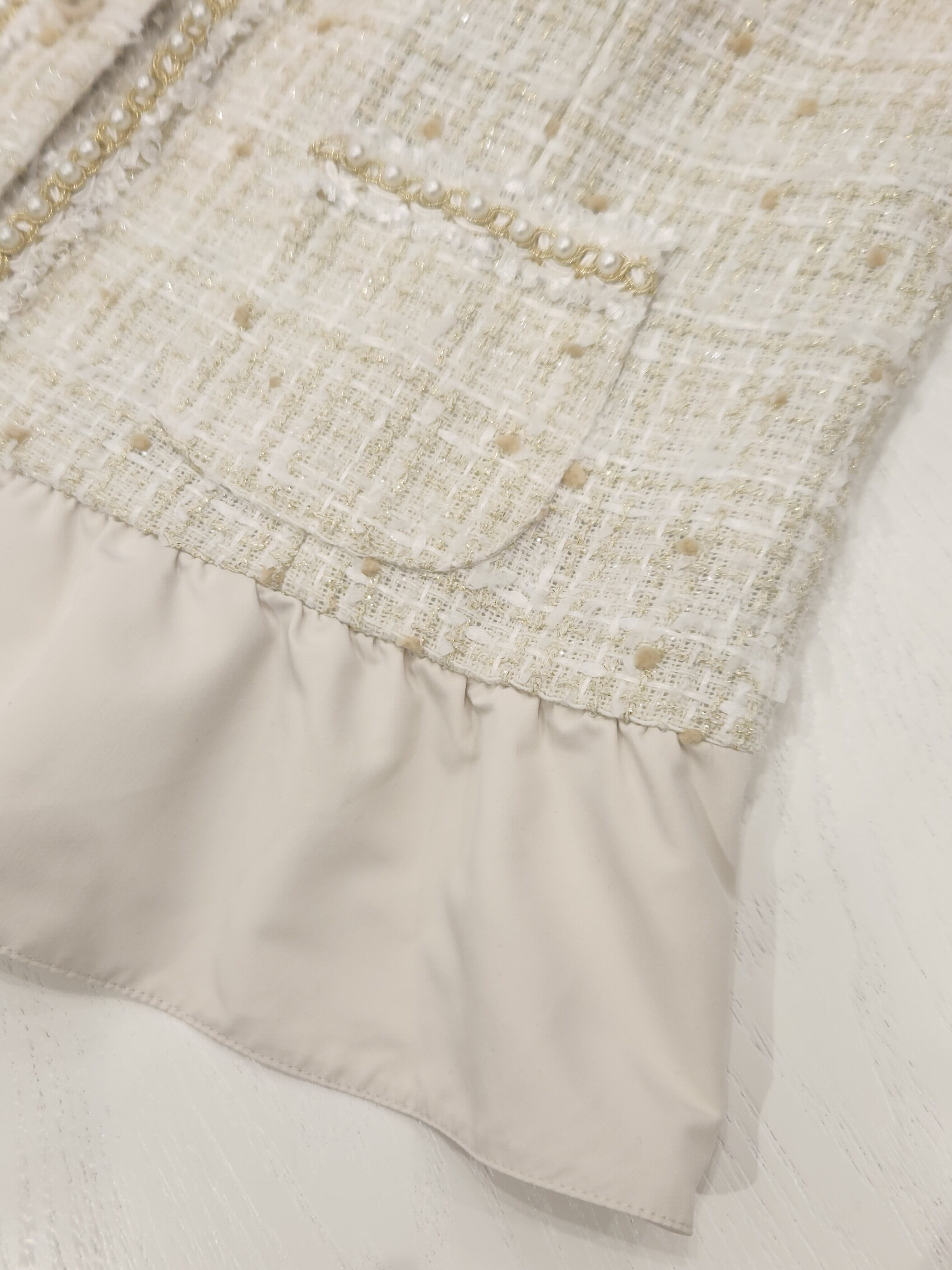 華やかなラメ入りツィード生地に、パールとフリルが施されたデザインは、エレガントさと女性らしさを兼ね備えています。特にコサージュが魅力的なアクセントとなり、特別な日のお出かけやデートにもぴったりのアイテムです。